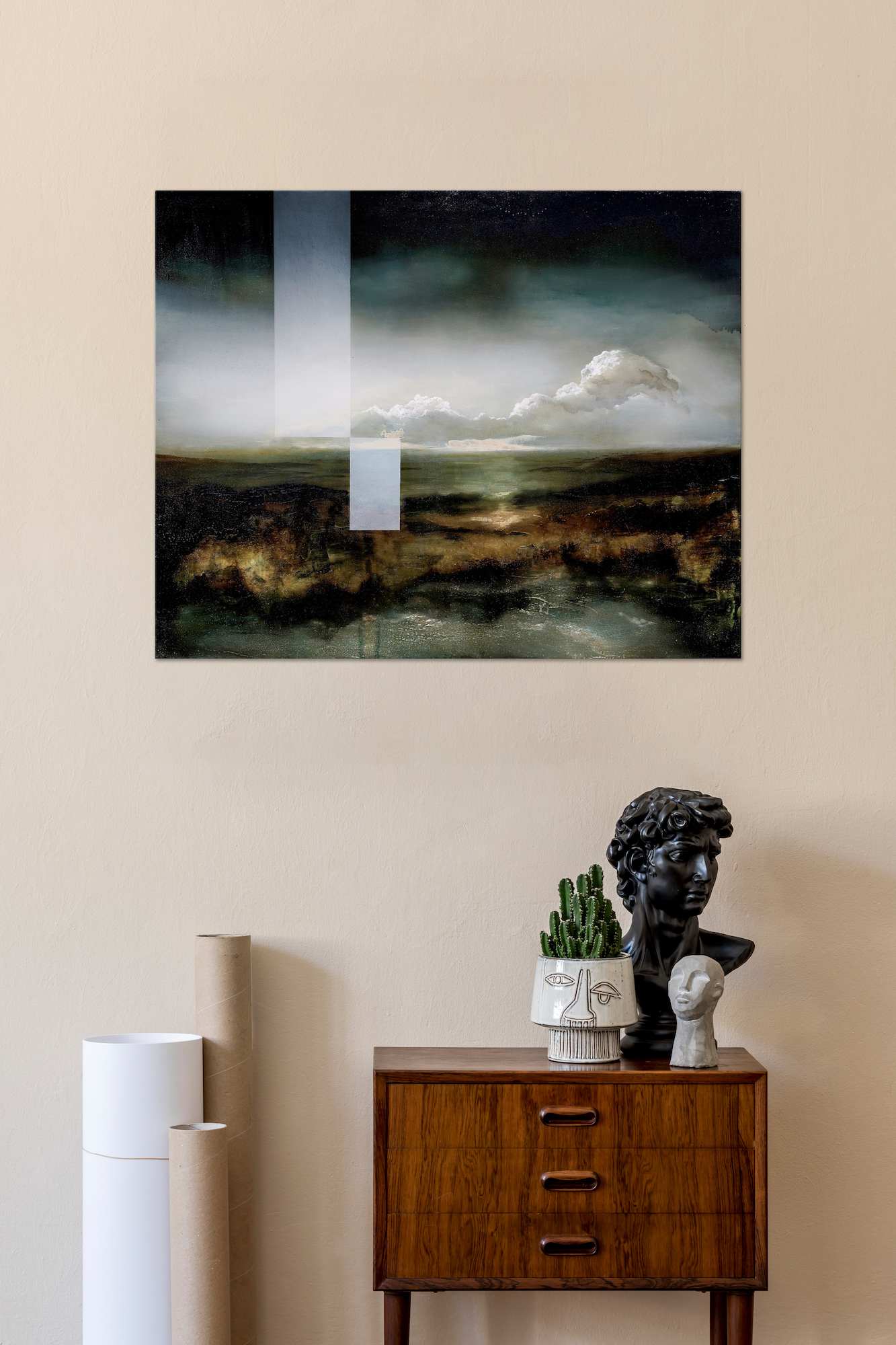 Between abstraction and figuration, Joachim Van der Vlugt’s artworks are created through an amazing work on the light. Whereas the painted subjects let the spectator free to identify a dreamlike world, the artist’s work on the light structures the painting and creates the peculiar and fascinating feeling of reality. Here, dark and light colors combine and create an imaginary landscape divided between sky and land.