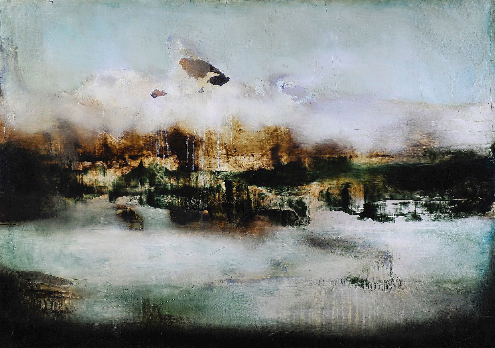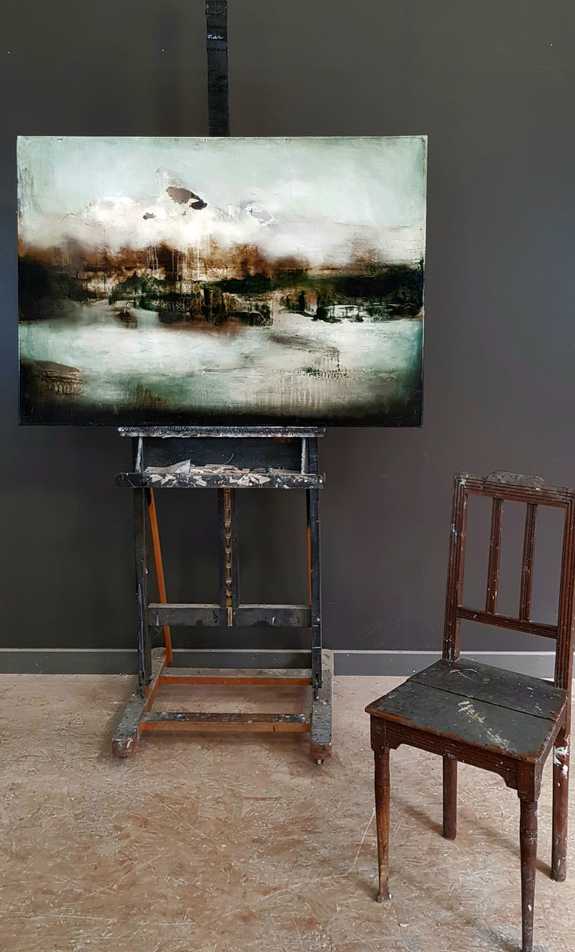 This painting evokes a snowy mountainous landscape, in an abstract style. The scene is painted with a subtle coloured palette composed by varying hues of white, green and brown, creating a mystical composition.