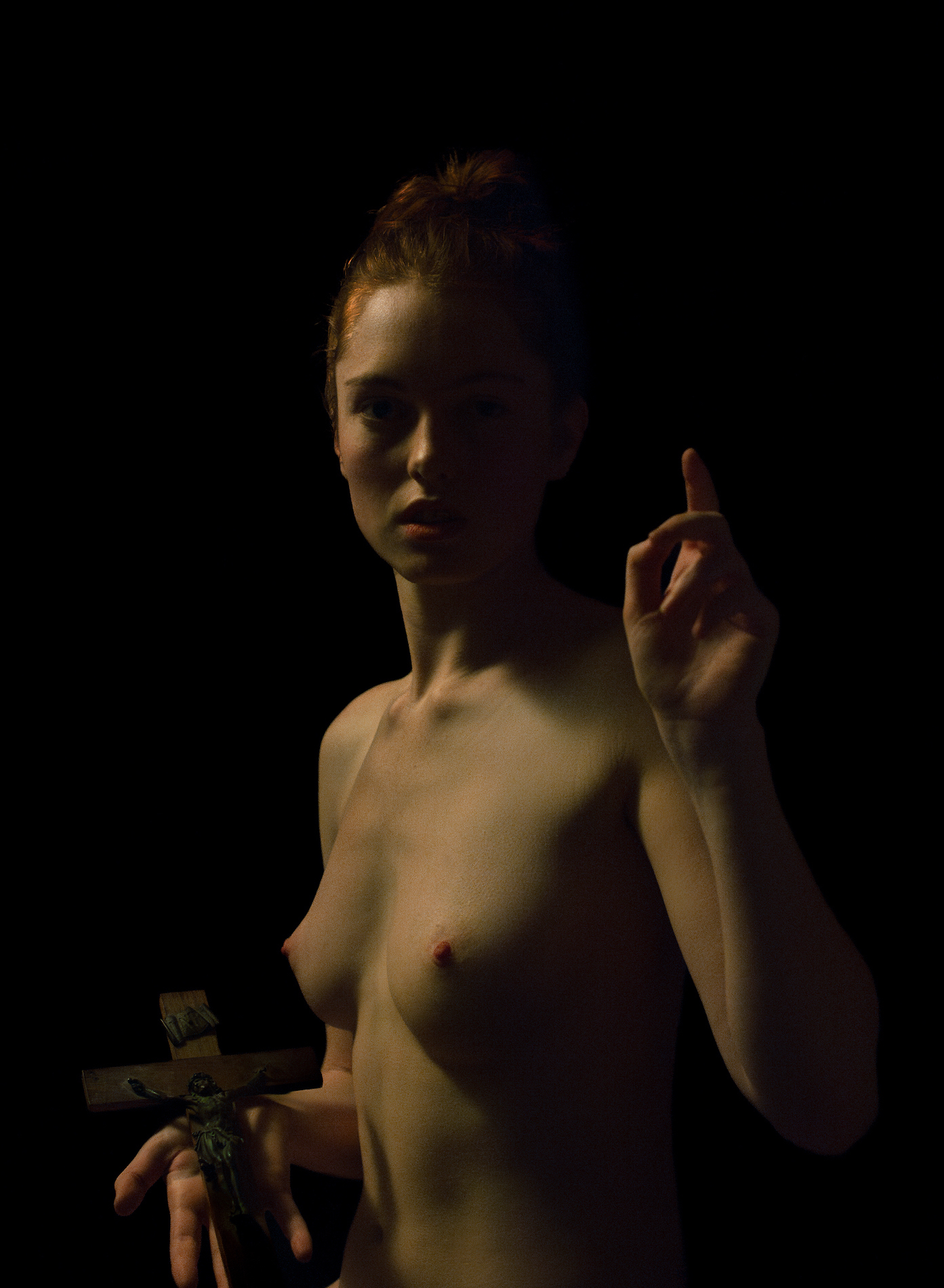 Divine Nude No.46 is a photograph by the French artist Ronald Martinez from the series The girl with the moles. This photograph shows a young woman looking at the viewer. The image is imbued with strong Christian symbols: the figure points to a cross with her right hand and makes the sign of blessing with her left.
