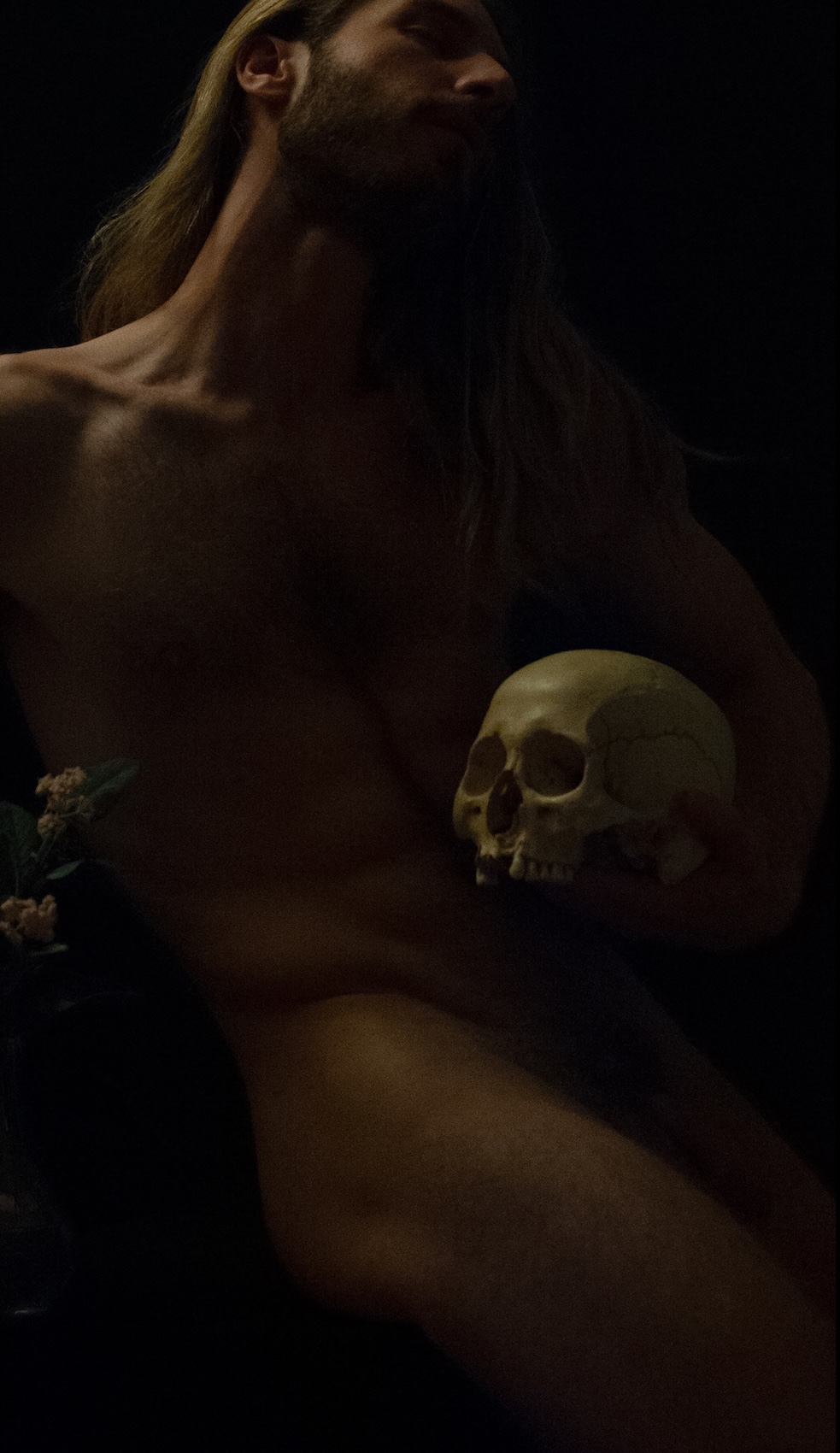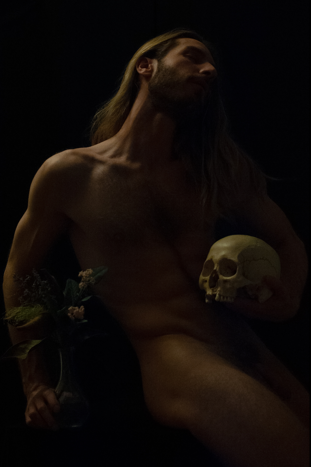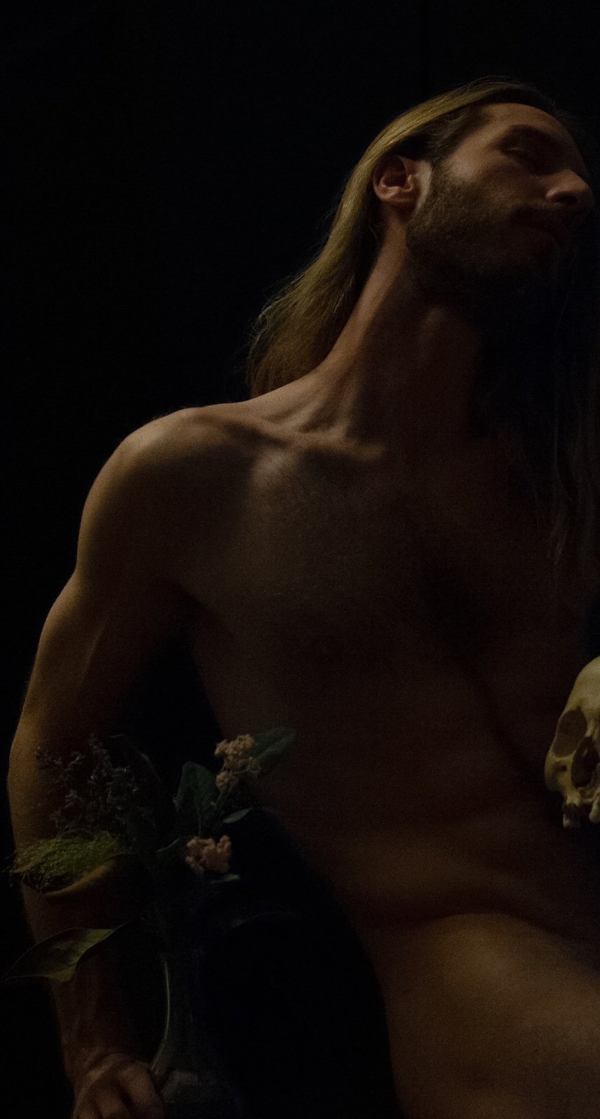 Divine Nude No.49 is a photograph by the French artist Ronald Martinez from the series Ombra Sulla Pelle (Shadow on the skin). This photograph depicts a bare-chested man surrounded by symbolic objects of memento mori. It elevates the beauty of the male body in a chiaroscuro atmosphere.