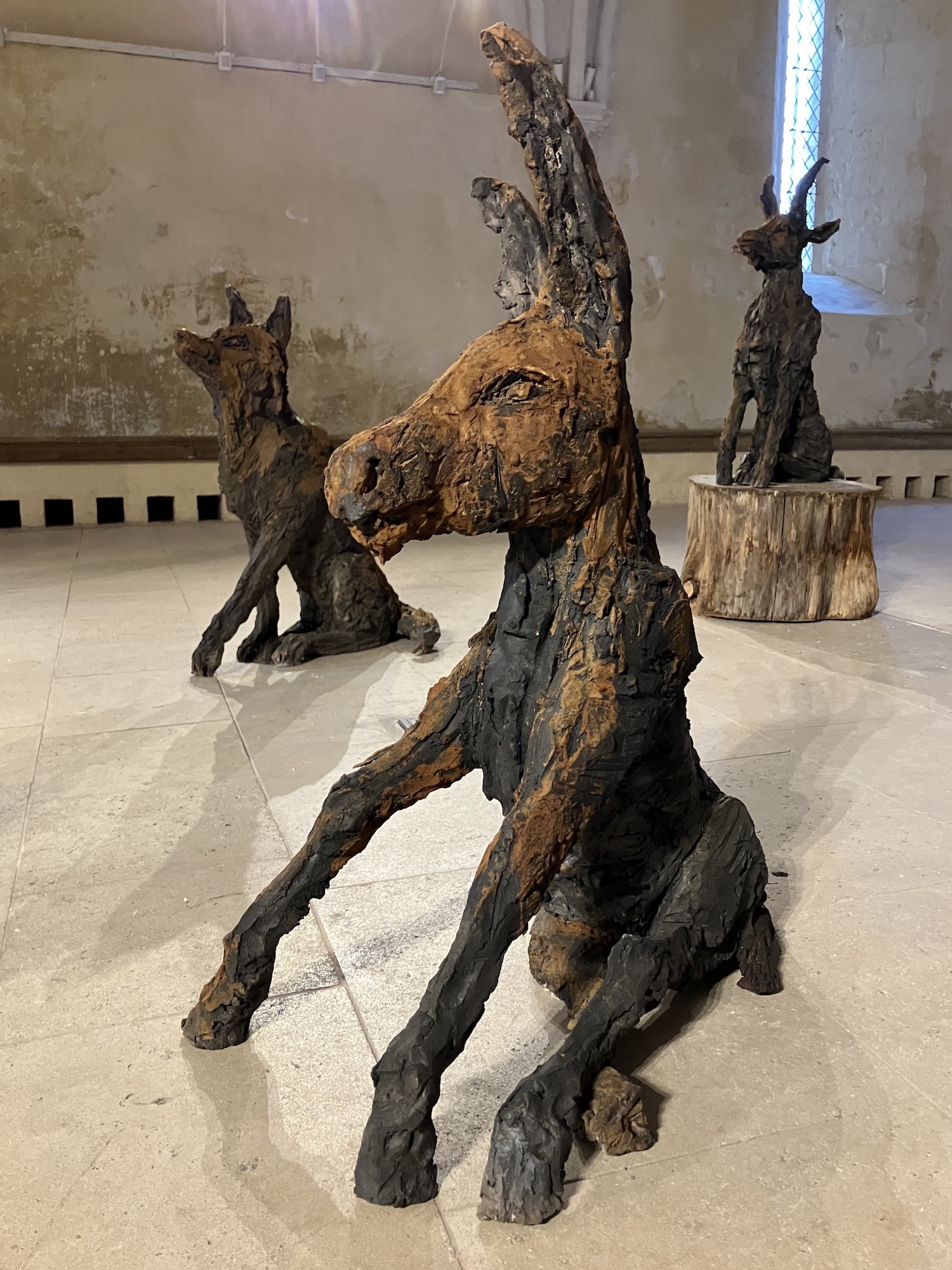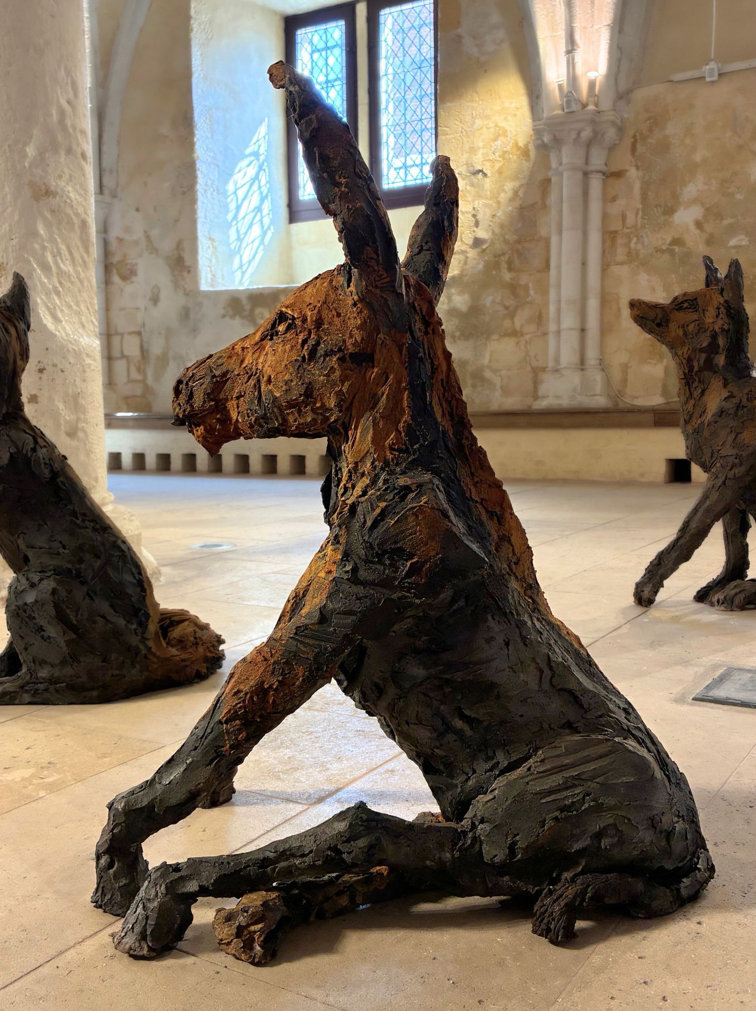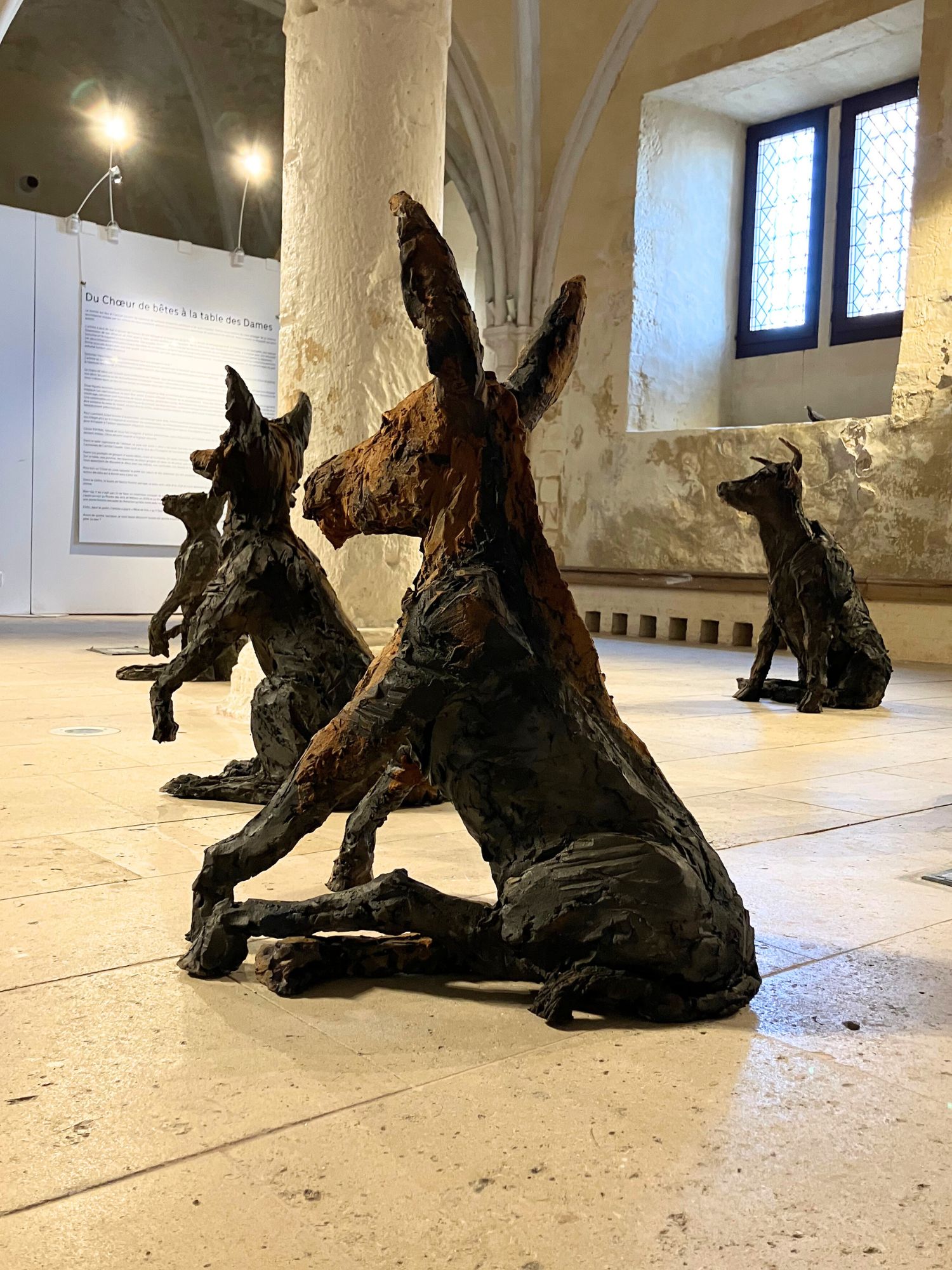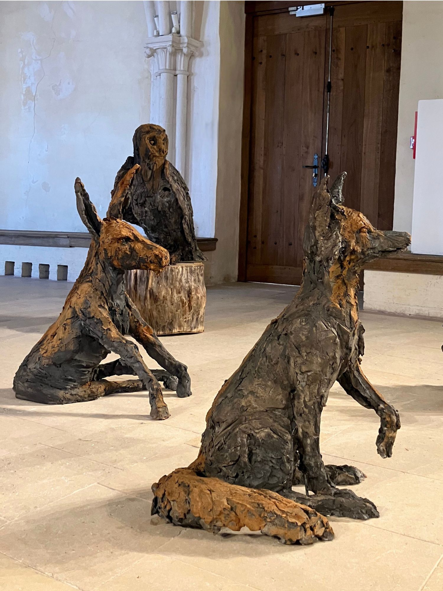 The installation Chœur de bêtes (Choir of beasts), on which the artist has been working for several years, has been exhibited at Cécile Raynal’s solo show, À la table des Dames (At the Ladies’ table), at Montivilliers Abbey in Normandy (2025). In this historic site, long home to women, nuns and abbesses, the sculptor has chosen to present works combining portraits of women and animals. Cécile Raynal’s sculptures do not seek to seduce, and can even sometimes appear disturbing. Rough, they bear the marks of a passage through matter, through trial, and yet they stand upright, alive. They conjure up a world in which the animal, feminine, instinctive or rebellious side is embraced as an essential force. In the restored Abbey, the exhibition retraces the last fifteen years of the French artist’s singular career (more information on the exhibition here).