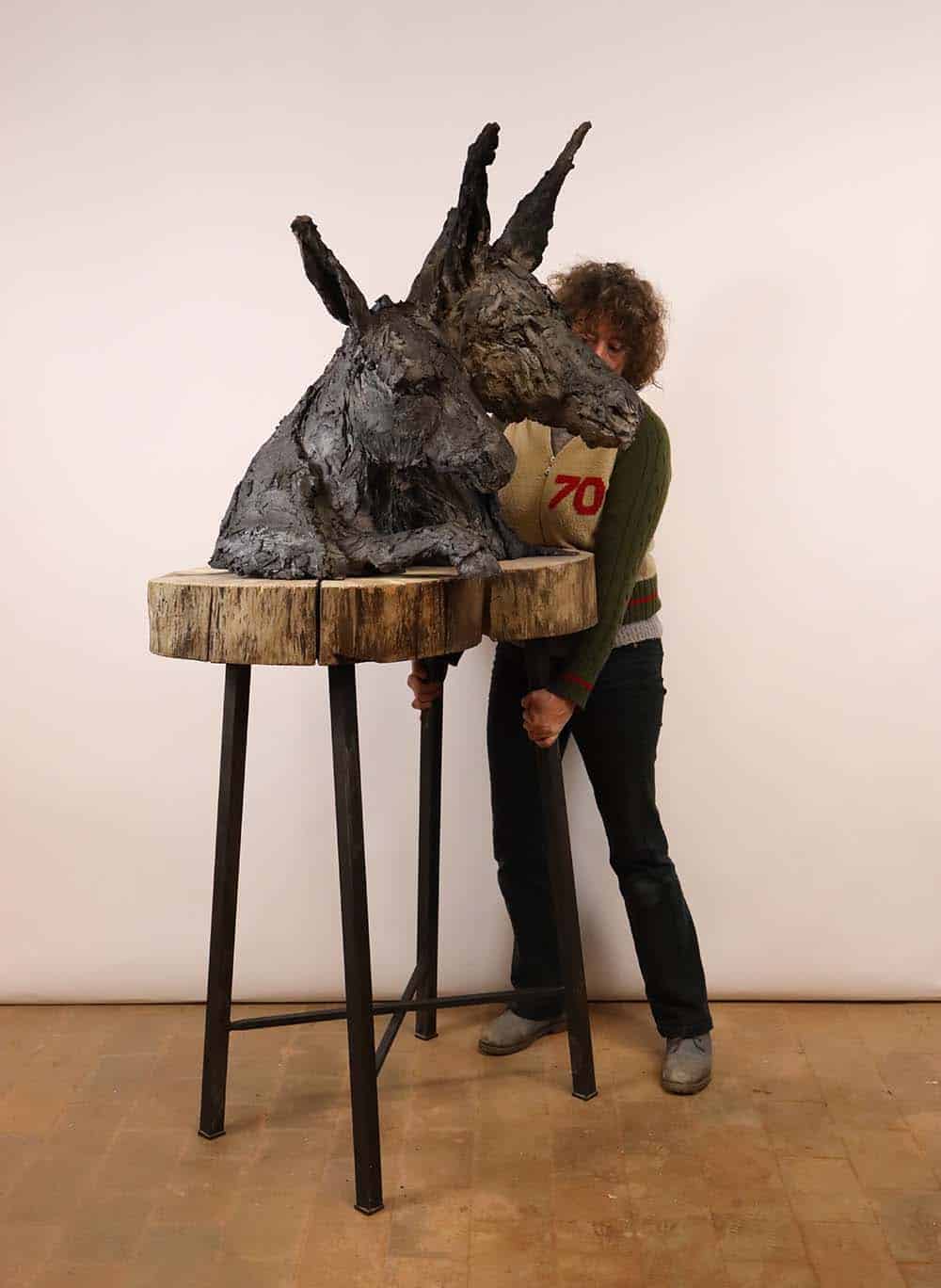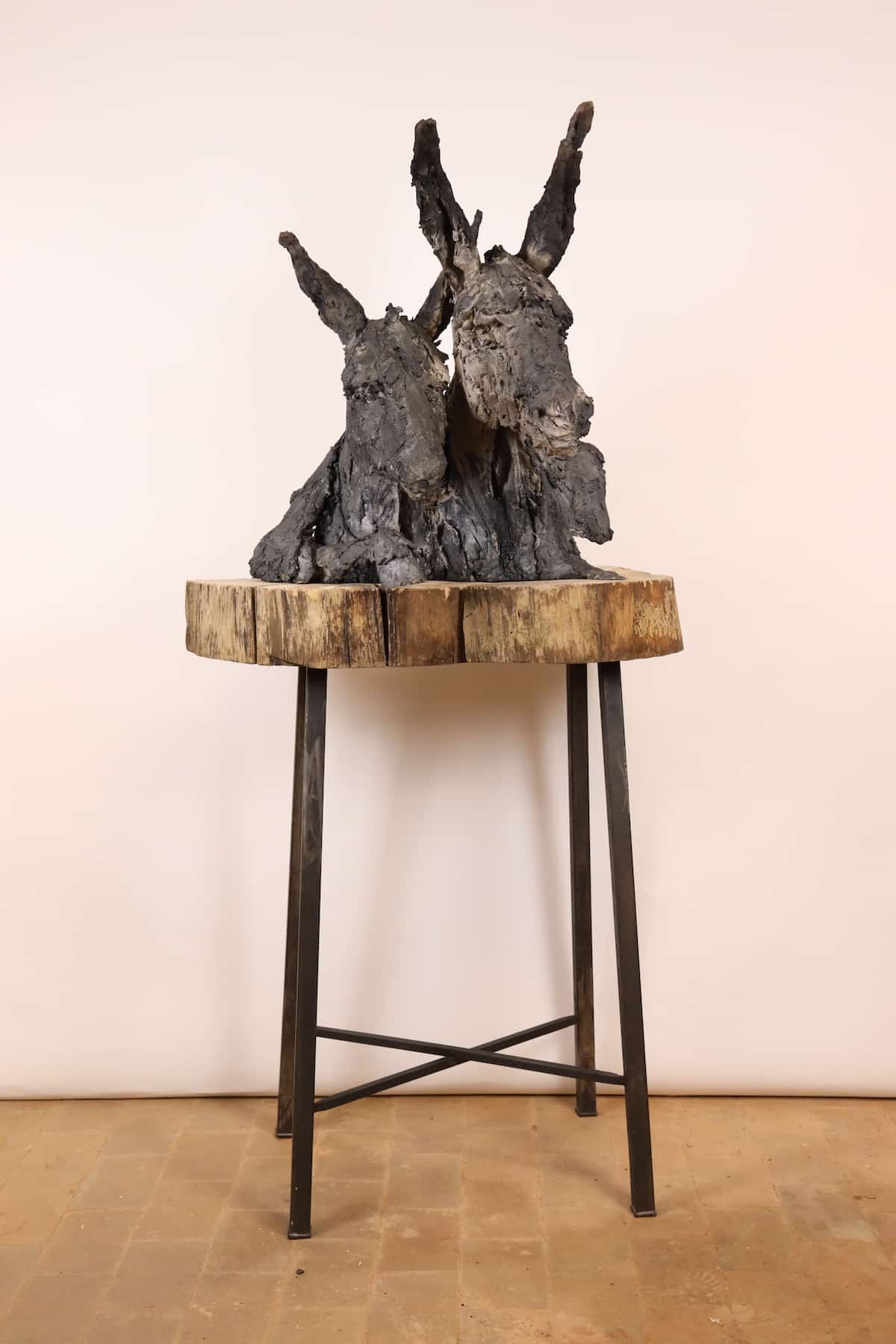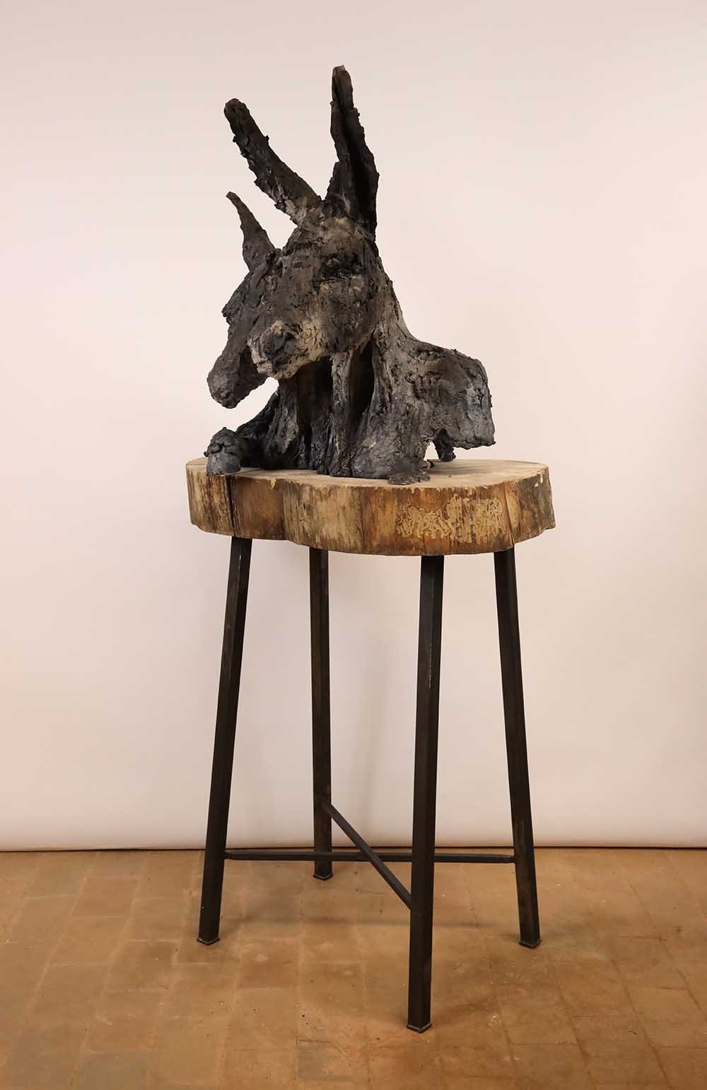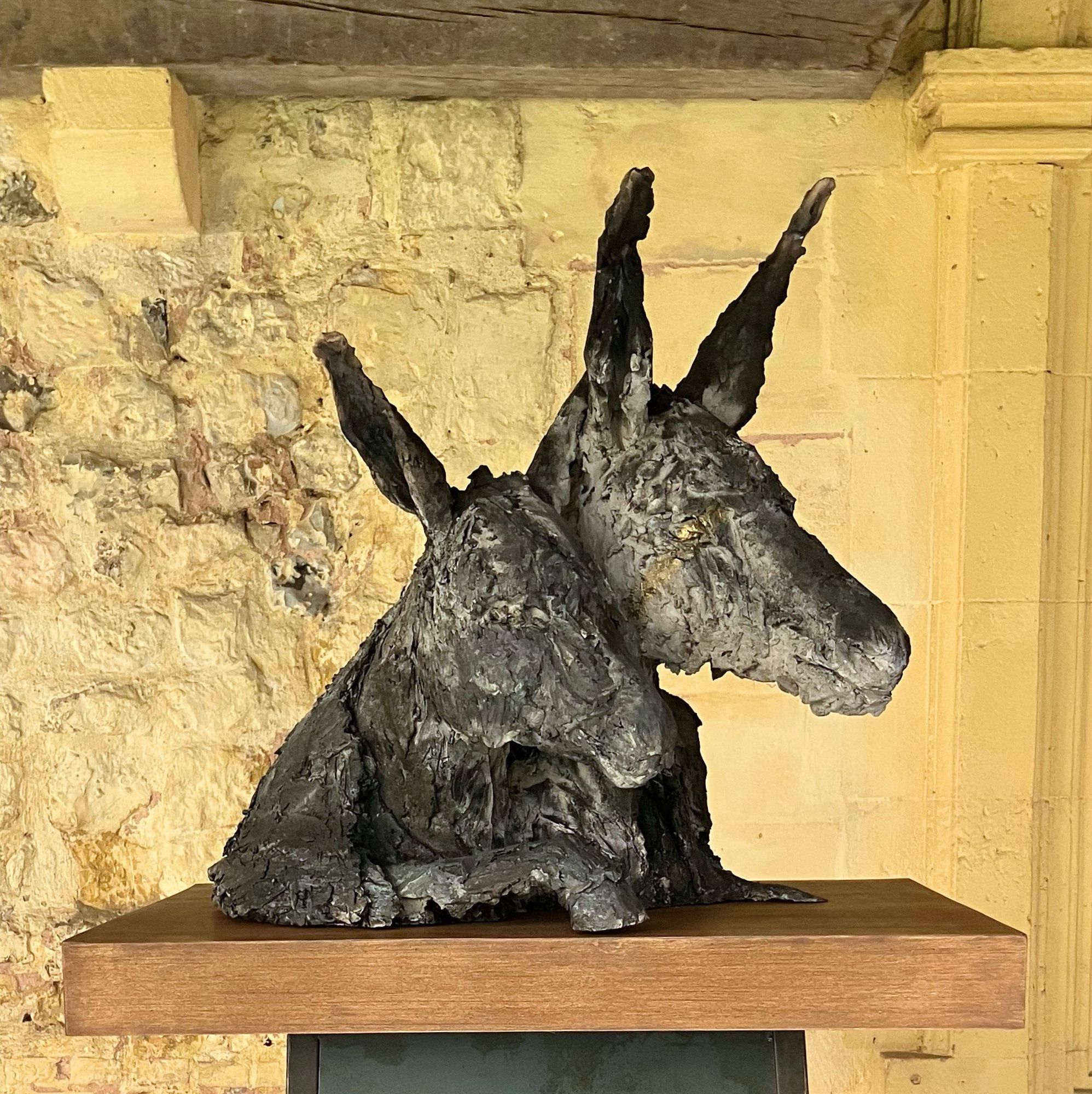 This sculpture represents two donkeys of which only the skin remains, although they seem alive. As it is sometimes the case for Cécile Raynal’s sculpture, this work stages the emptiness as a possible structure. The subject is created on the empty space and not in opposition to it. This artwork is part of a narrative bestiary that has taken a growing place in the work of the artist in the recent years. “All sorts of animals and hybrid forms inhabit my work, chimeras, somewhere between animal and human figures.” (Mémoires de Braise, by Cécile Raynal, Privat Publishing House, 2018).