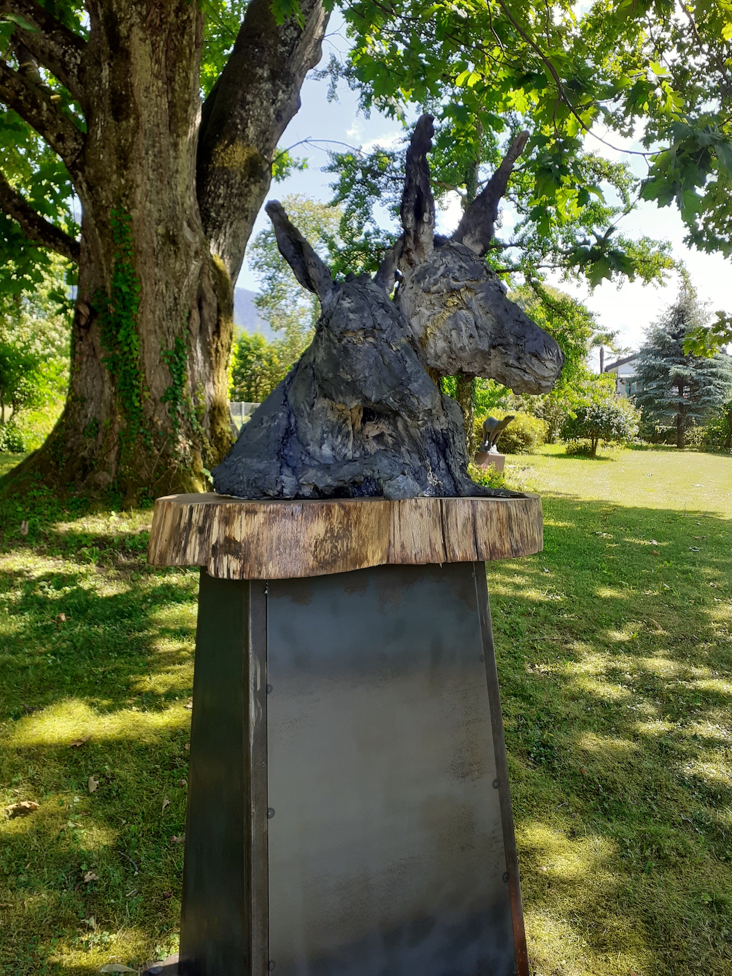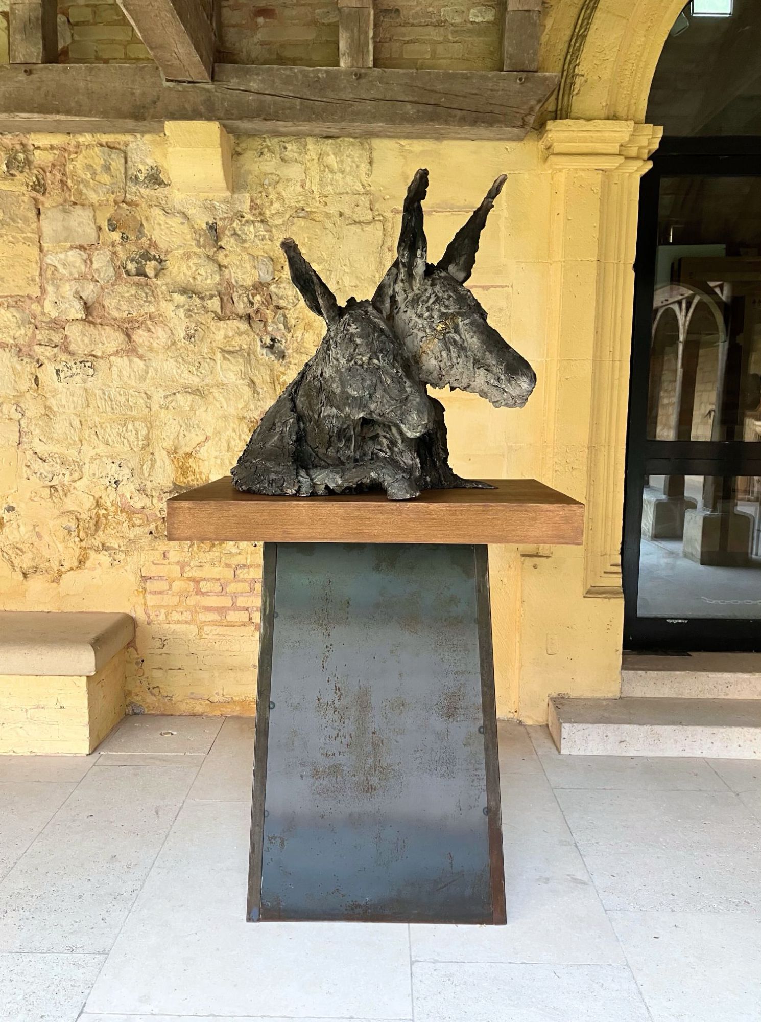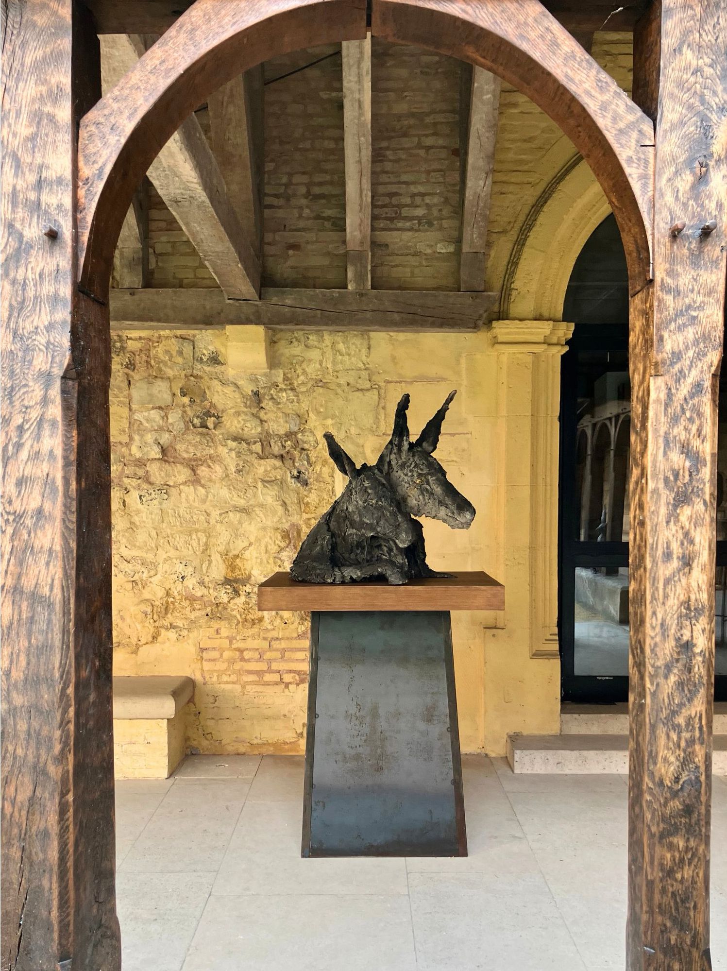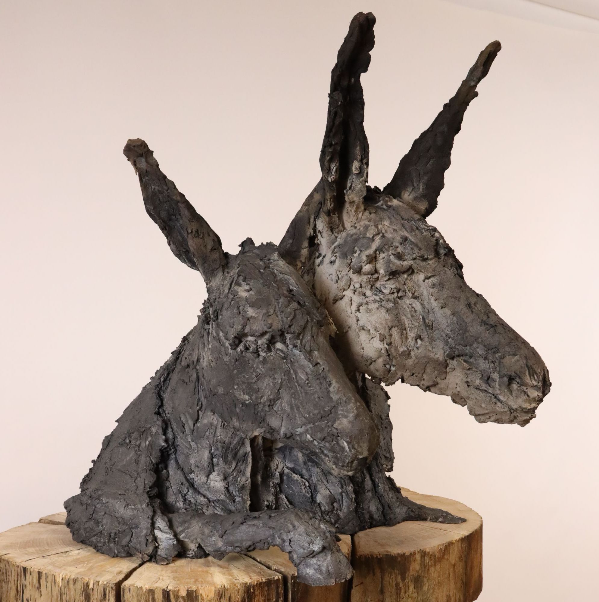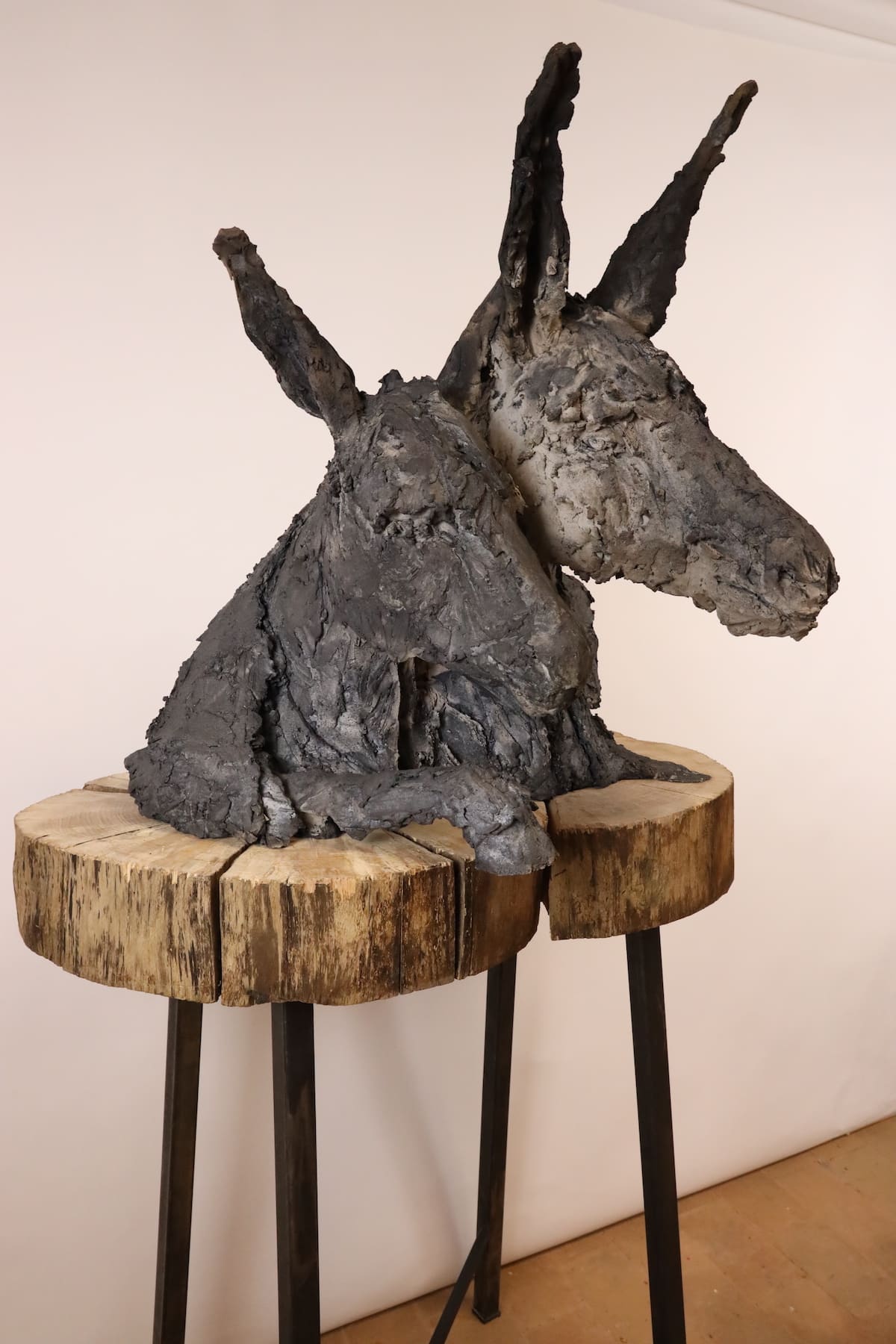 This sculpture represents two donkeys of which only the skin remains, although they seem alive. As it is sometimes the case for Cécile Raynal’s sculpture, this work stages the emptiness as a possible structure. The subject is created on the empty space and not in opposition to it. This artwork is part of a narrative bestiary that has taken a growing place in the work of the artist in the recent years. “All sorts of animals and hybrid forms inhabit my work, chimeras, somewhere between animal and human figures.” (Mémoires de Braise, by Cécile Raynal, Privat Publishing House, 2018).