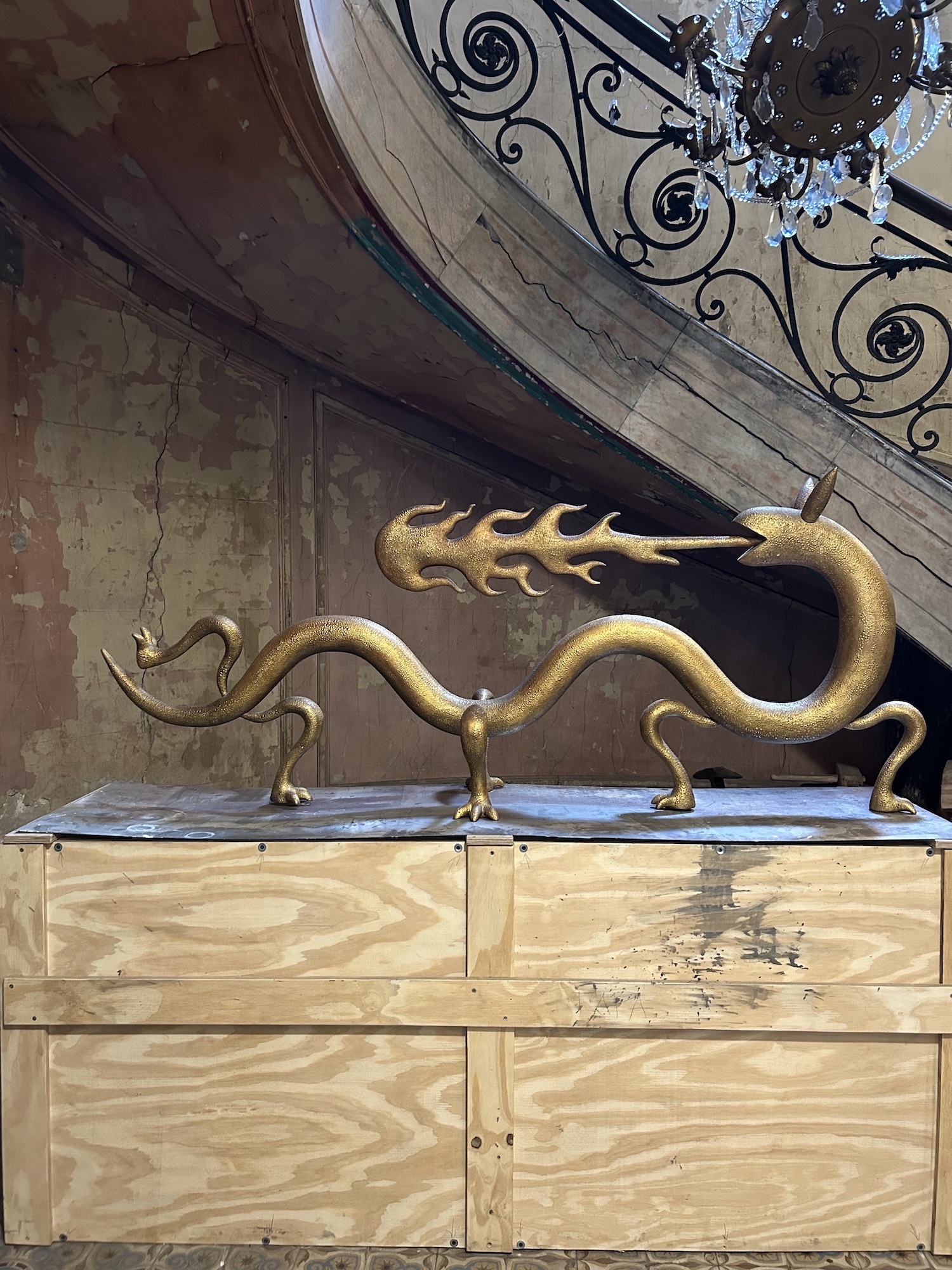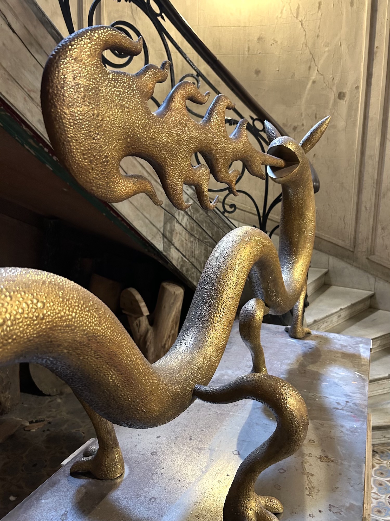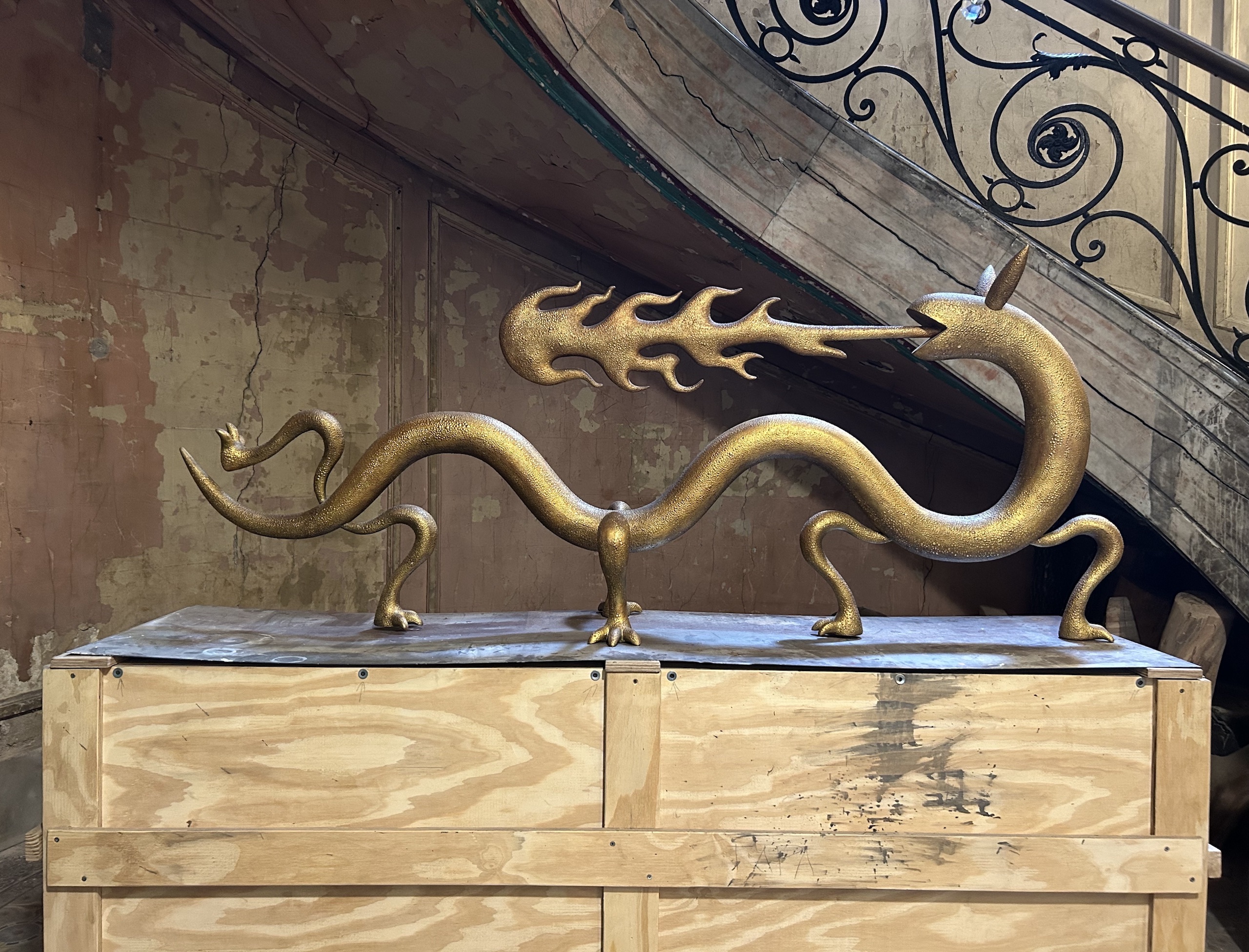 Dragoness (wood & gold leaf) is a sculpture by contemporary Argentinian artist Marcelo Martin Burgos. As the title suggests, the artwork is of a dragoness, with the distinctive elements of the mythical animal, such as the mouth breathing fire or clawed feet. The artist seems to be influenced by Asian dragon iconography, as his dragon is wingless. This unique piece is in wood covered with a very thin 20k gold leaf produced by the historical handicraft workshop in Venice Mario Berta Battiloro. Fire is used to achieve the final texture, which mimics the skin of a dragon.