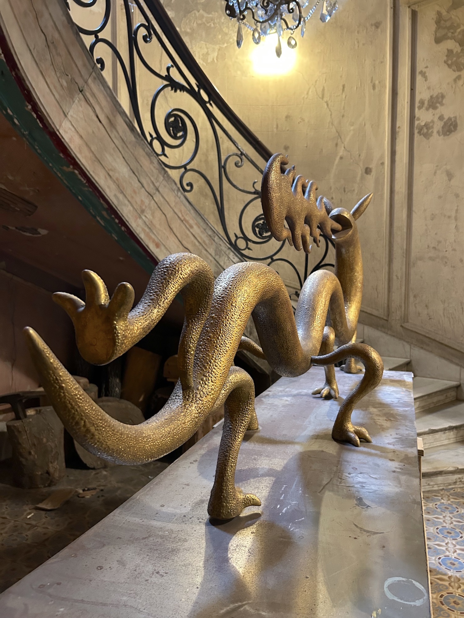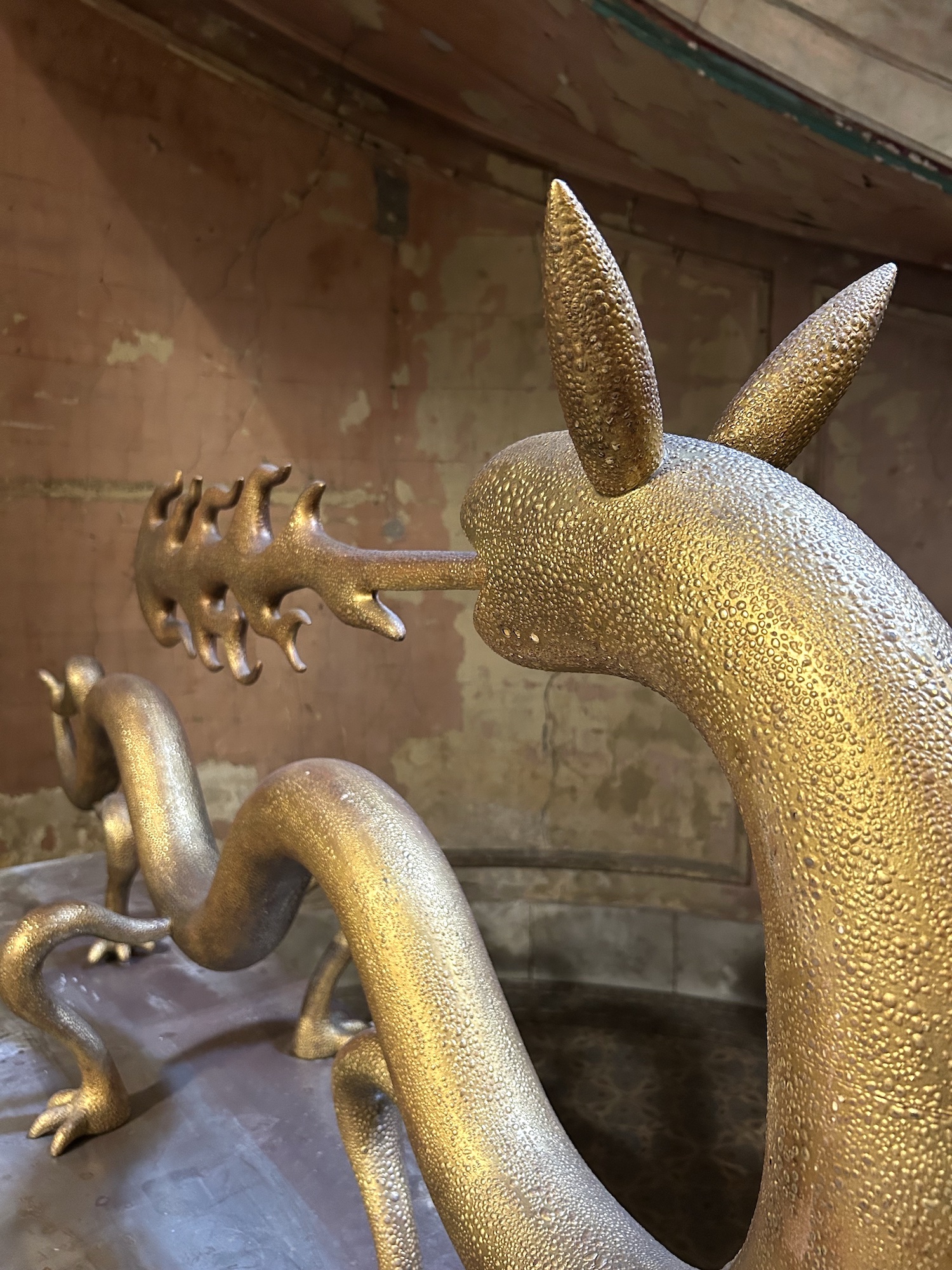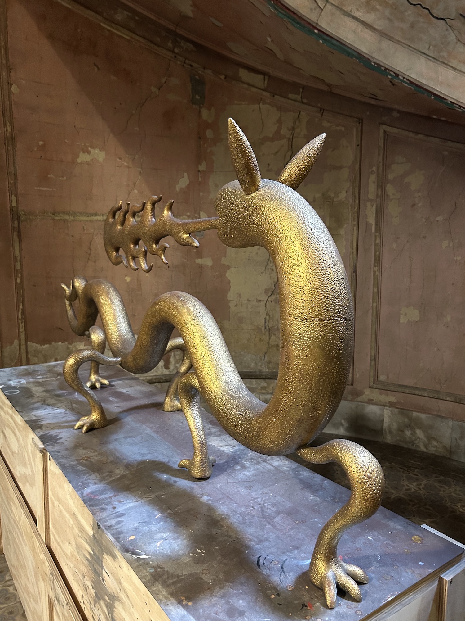 Dragoness (wood & gold leaf) is a sculpture by contemporary Argentinian artist Marcelo Martin Burgos. As the title suggests, the artwork is of a dragoness, with the distinctive elements of the mythical animal, such as the mouth breathing fire or clawed feet. The artist seems to be influenced by Asian dragon iconography, as his dragon is wingless. This unique piece is in wood covered with a very thin 20k gold leaf produced by the historical handicraft workshop in Venice Mario Berta Battiloro. Fire is used to achieve the final texture, which mimics the skin of a dragon.