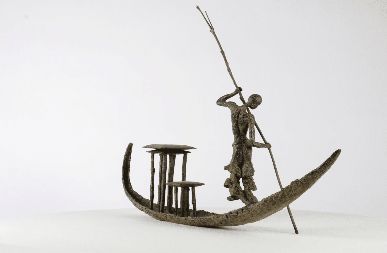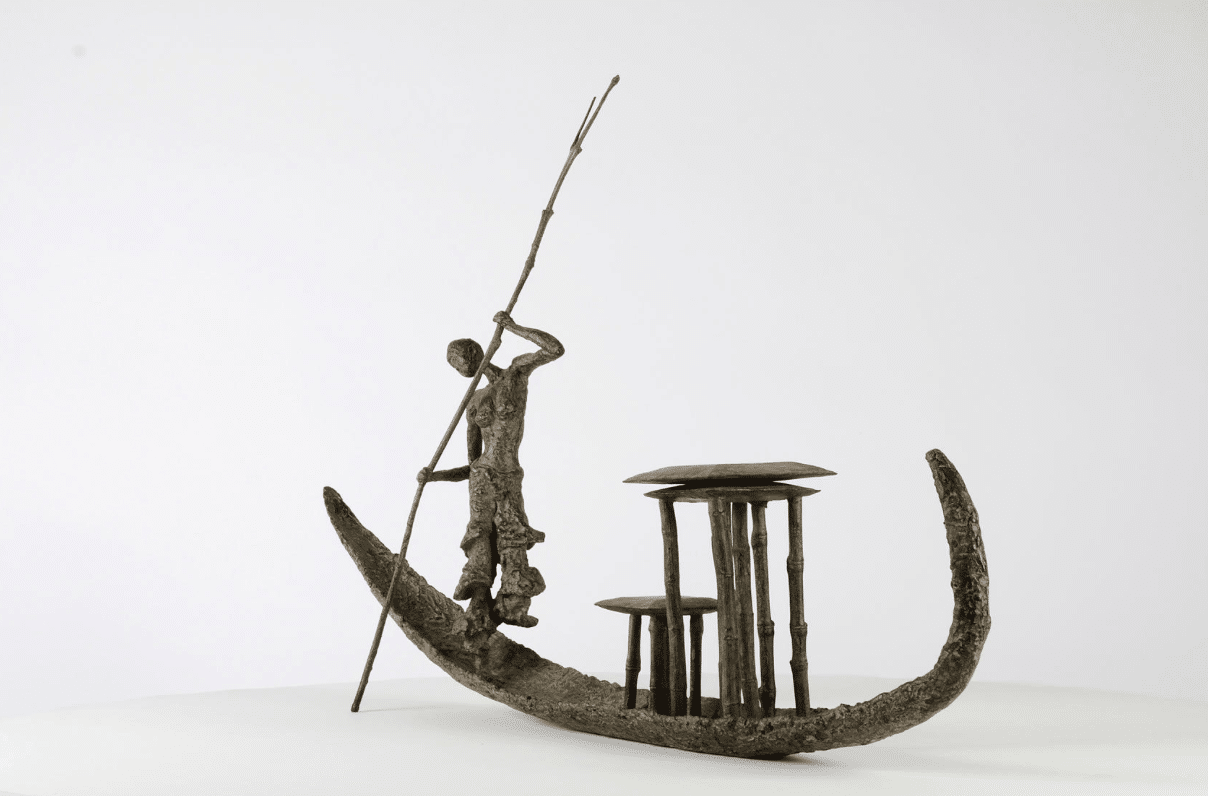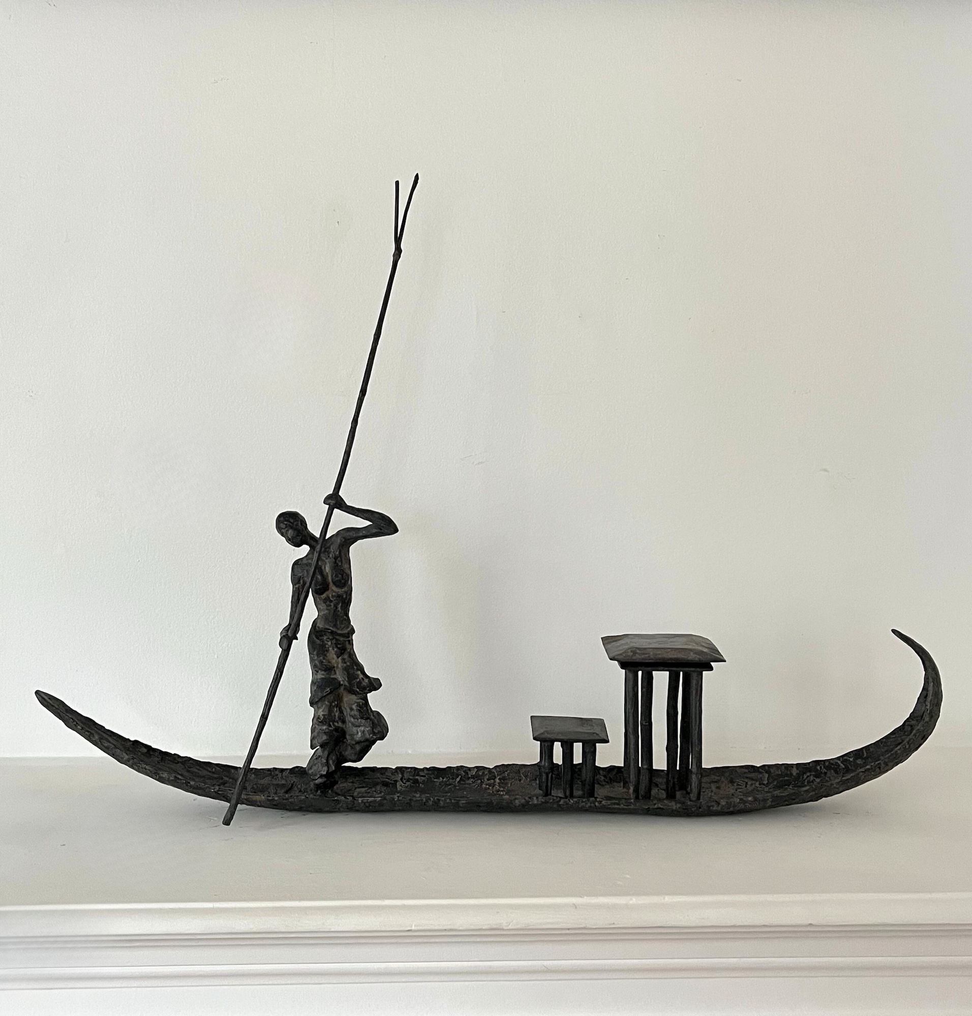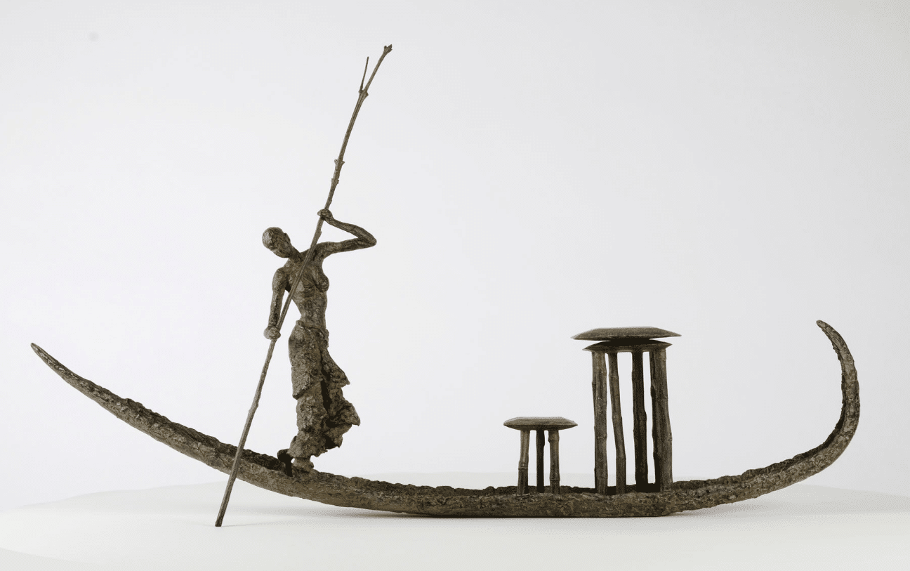 D’une Rive à l’Autre is an artwork by French contemporary sculptor Marine de Soos. This bronze sculpture is from the “Fisherman” series. This figurative piece of art represents a young woman navigating a pirogue by use of a pole. She is standing, bare-chested and her slender silhouette together with the nonchalant attitude, as well as the charming aspect of her skiff, give this sculpture enormous elegance and a feeling of serenity. The artist gets her inspiration from real or imaginary scenes. This bronze sculpture could be placed in an outside setting.