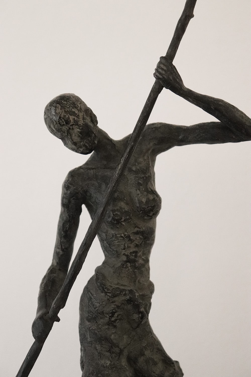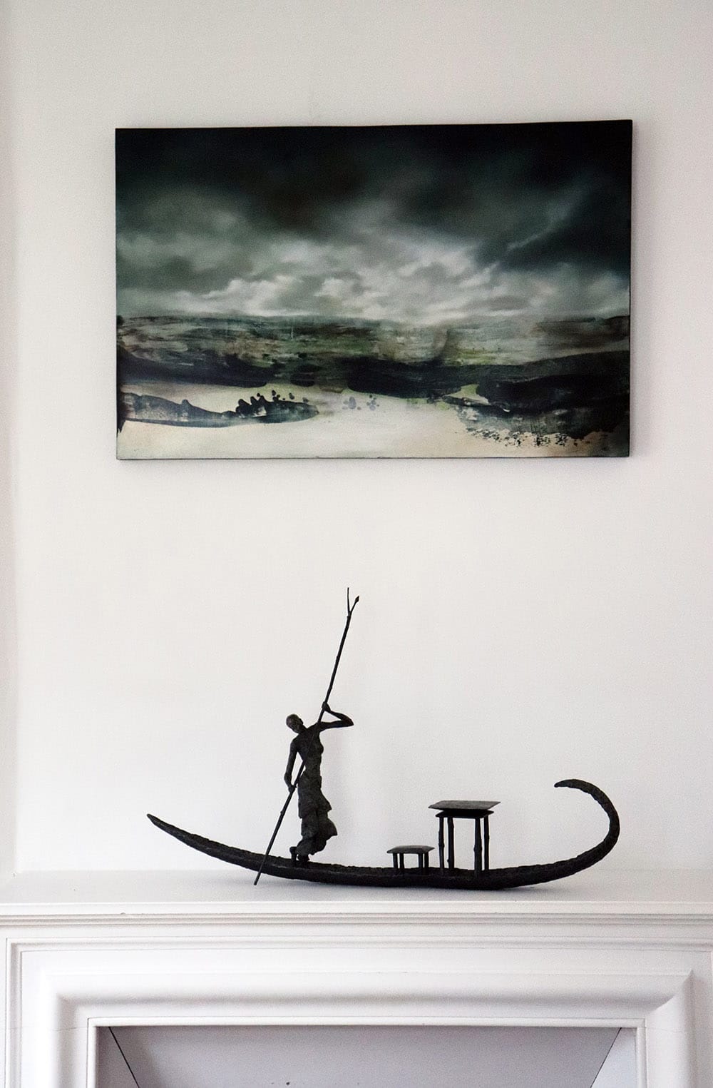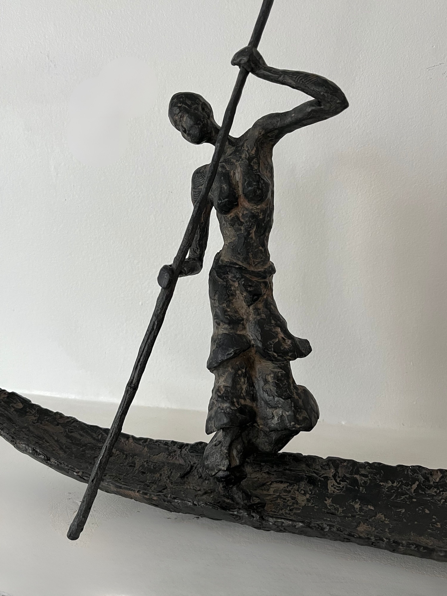 D’une Rive à l’Autre is an artwork by French contemporary sculptor Marine de Soos. This bronze sculpture is from the “Fisherman” series. This figurative piece of art represents a young woman navigating a pirogue by use of a pole. She is standing, bare-chested and her slender silhouette together with the nonchalant attitude, as well as the charming aspect of her skiff, give this sculpture enormous elegance and a feeling of serenity. The artist gets her inspiration from real or imaginary scenes. This bronze sculpture could be placed in an outside setting.