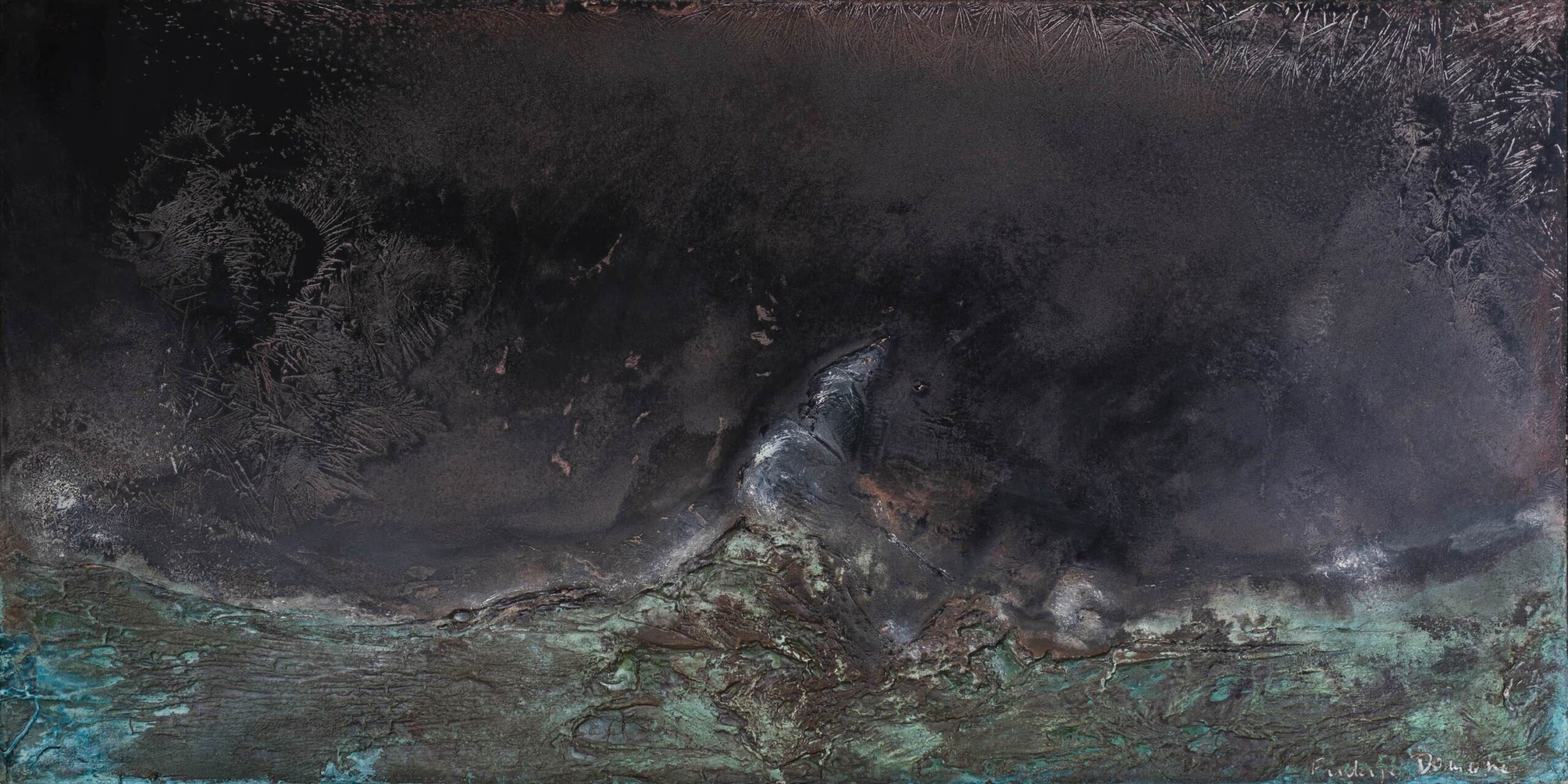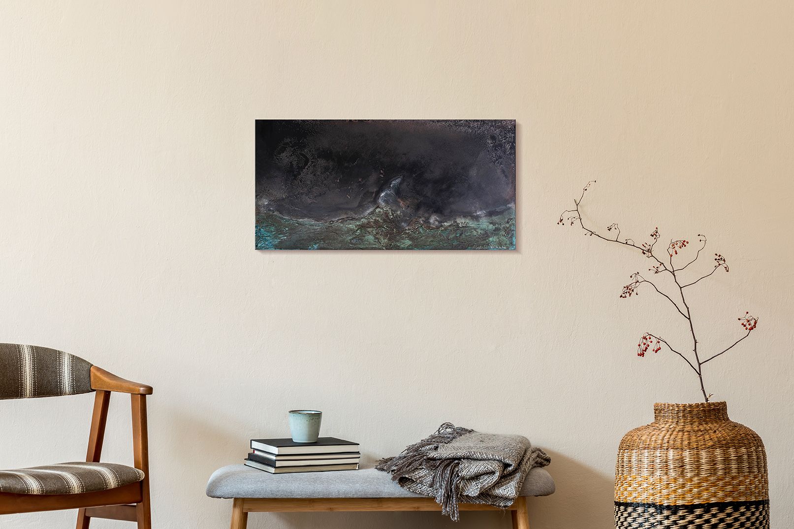 Frédérique Domergue finds her inspiration in nature and at the seaside. Her paintings evoke landscapes, skies and seas that are sometimes calm and tranquil, sometimes dark and turbulent. This abstract work seems to be of a raging sea under an inky sky. The differences in the oxidation, the green and copper tones, impart a powerful contrast on the composition.