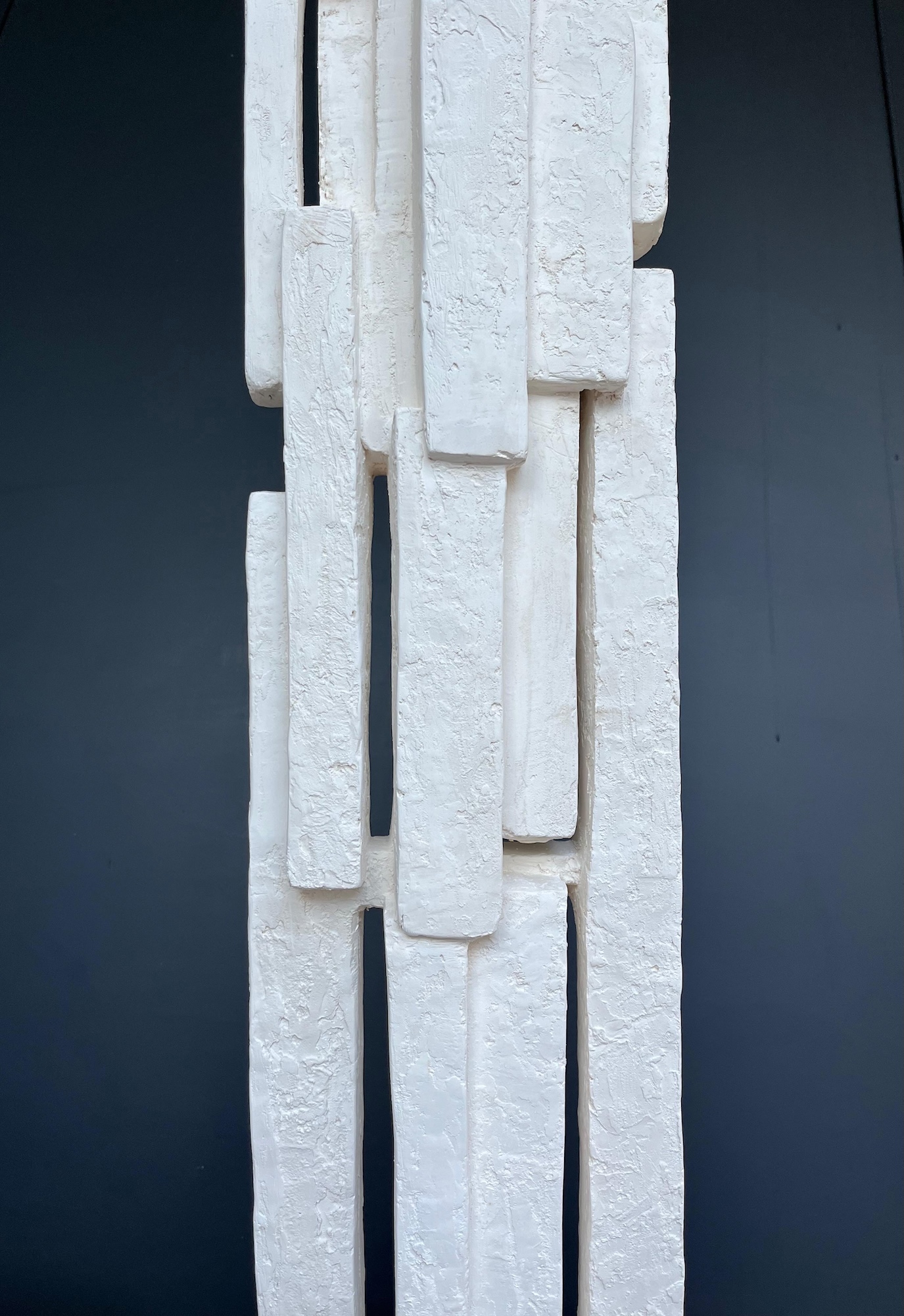 The artist favours expressionist and minimalist shapes. Her study revolves around the verticality and abandons the representation of the human figure that we find in other works of the series. The forms are simple but at the same time retain their slender character and the dialog they have amongst themselves.