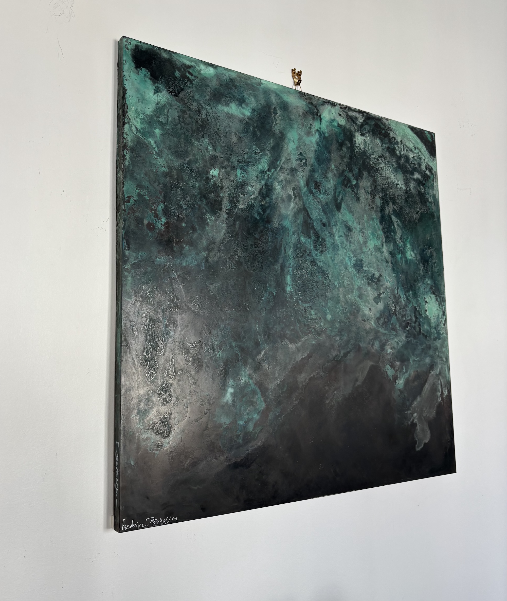 Emerald Constellation is an artwork by French contemporary artist Frédérique Domergue, crafted with oxidized bronze leaves on honeycomb aluminum panel.