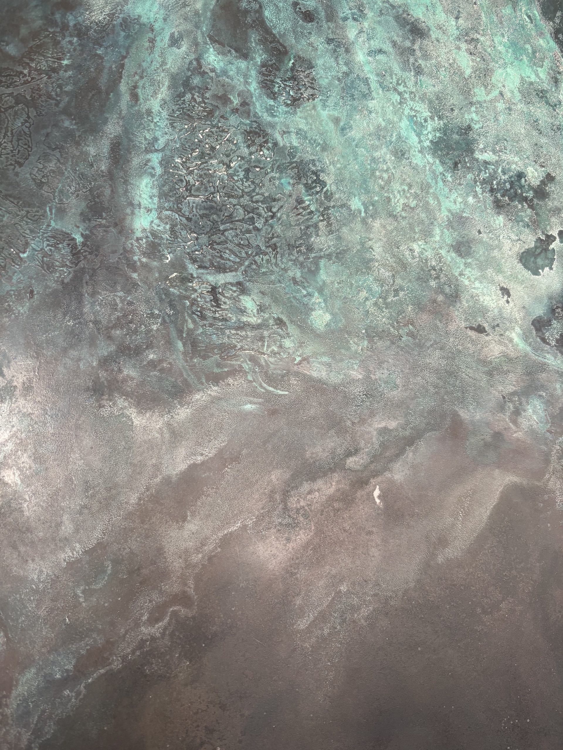 Description: Oxidized bronze leaves on honeycomb aluminum panel, patina fixed with beeswax