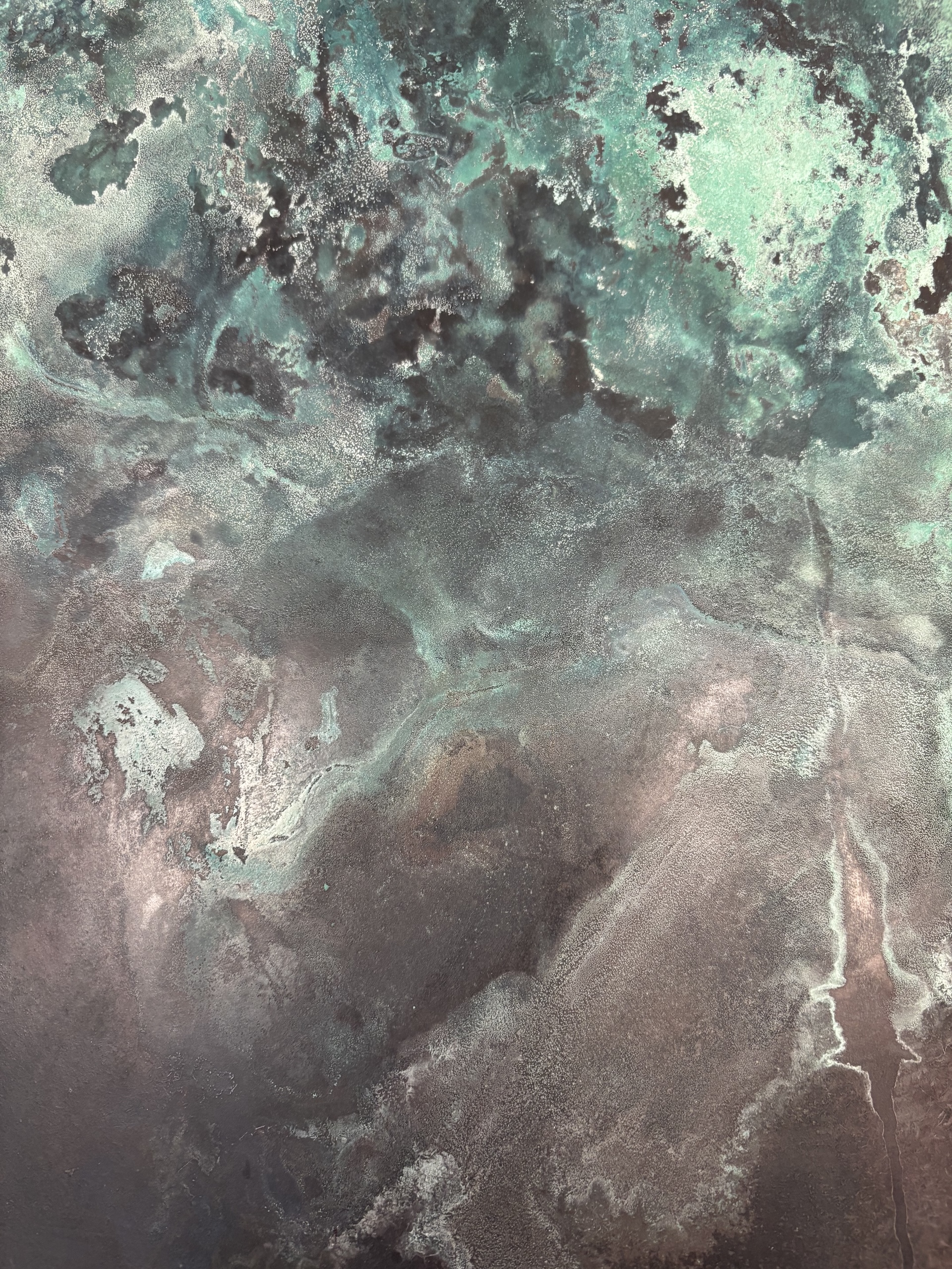 Fascinated by metal, Frédérique Domergue has developed a unique two-dimensional body of work that draws on both sculpture, through the use of relief, and painting, through the research of different colour shades obtained with oxidation. The artist uses thin sheets of metal applied on aluminium panels. Through a patient process of polishing and oxidation the artist manages to confer a warmth and sensuality which tempts the observer to caress the oxidized surface of her paintings, now become all radiant and silky.