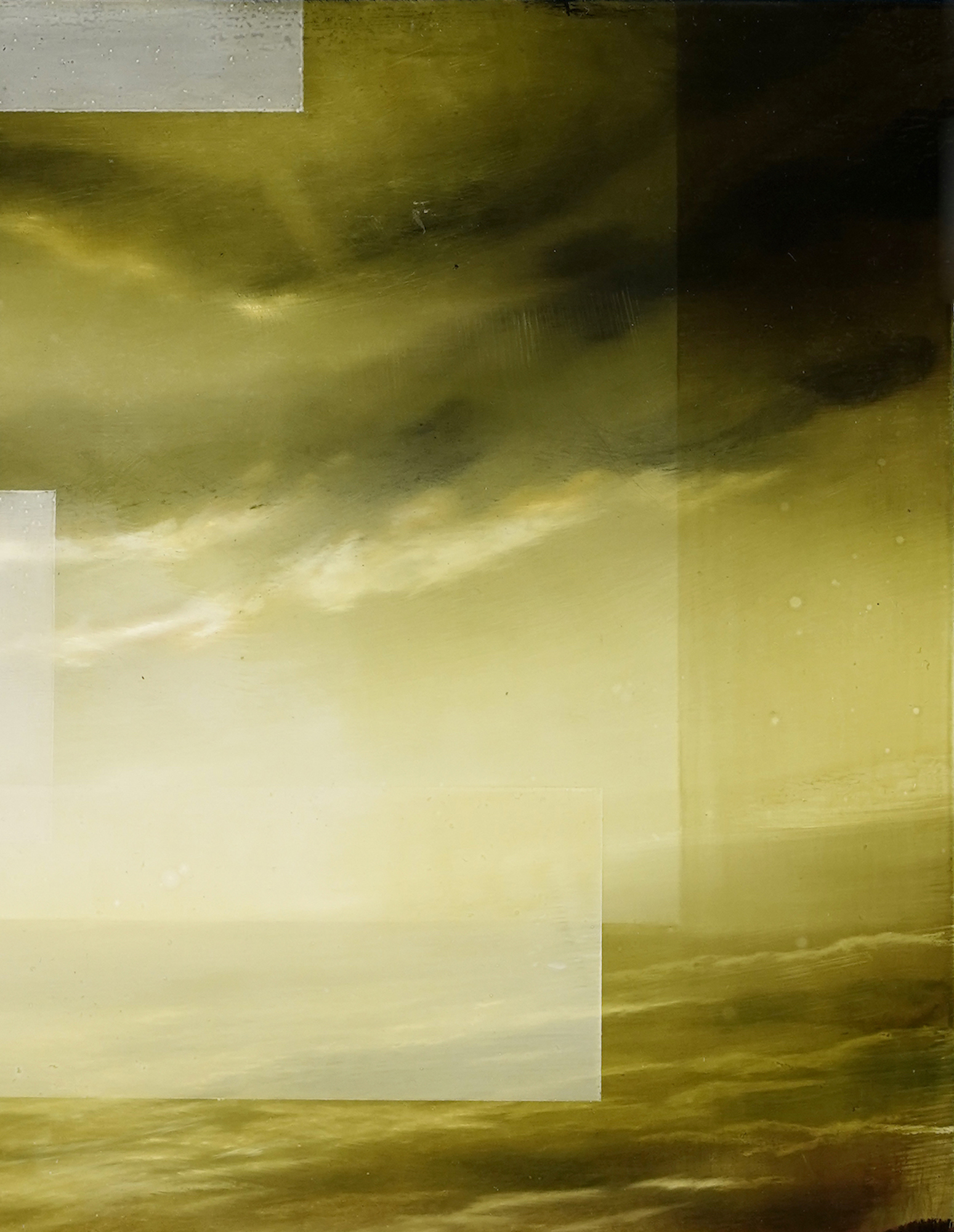 Emerald Sky III is a painting by the contemporary artist Joachim van der Vlugt. This oil on wood is an abstract composition, that can be inspired by landscape painting. The artist mainly uses shades of green, yellow and brown for this painting.