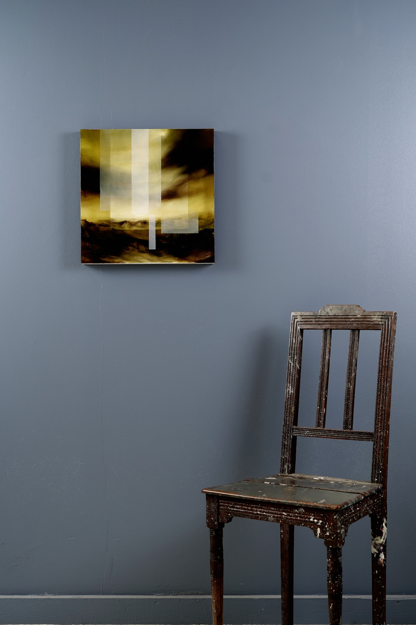 Emerald Sky IV is a painting by the contemporary artist Joachim van der Vlugt. This oil on wood is an abstract composition, that can be inspired by landscape painting. The artist mainly uses shades of green, yellow and brown for this painting.
