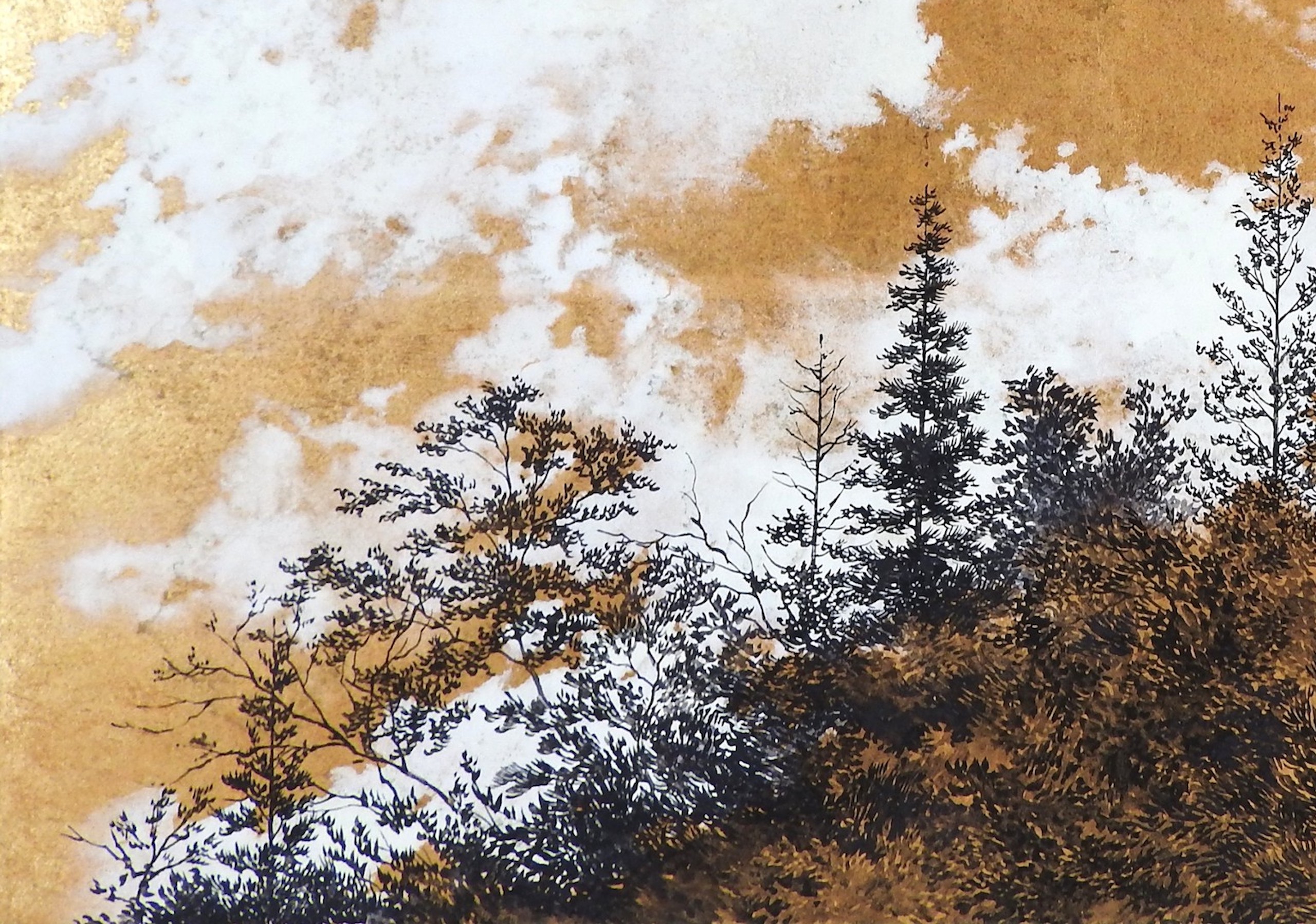 Shoko Okumura’s works explore the link between man and nature. Inspired by Shinto beliefs, which regard nature as sacred and inhabited by invisible forces, the artist brings natural elements to life through delicate paintings illuminated by gold and silver leaf. Her paintings celebrate nature as alive and in motion, reflecting a world where every detail carries meaning. By capturing the present moment in ever-changing natural landscapes, she seeks to freeze the essence of the moment. This aesthetic and philosophical approach transforms her paintings into a meditation on time and life.