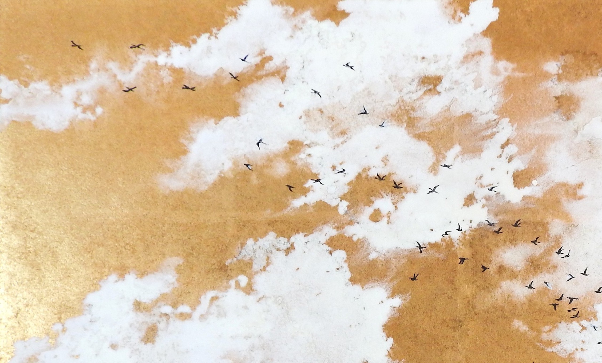 Empathy towards Things #3 is a painting by Japanese artist Shoko Okumura from the series Empathy Towards Things. This painting depicts a golden sky crossed by white clouds and a flock of birds, with the dark silhouettes of trees below.