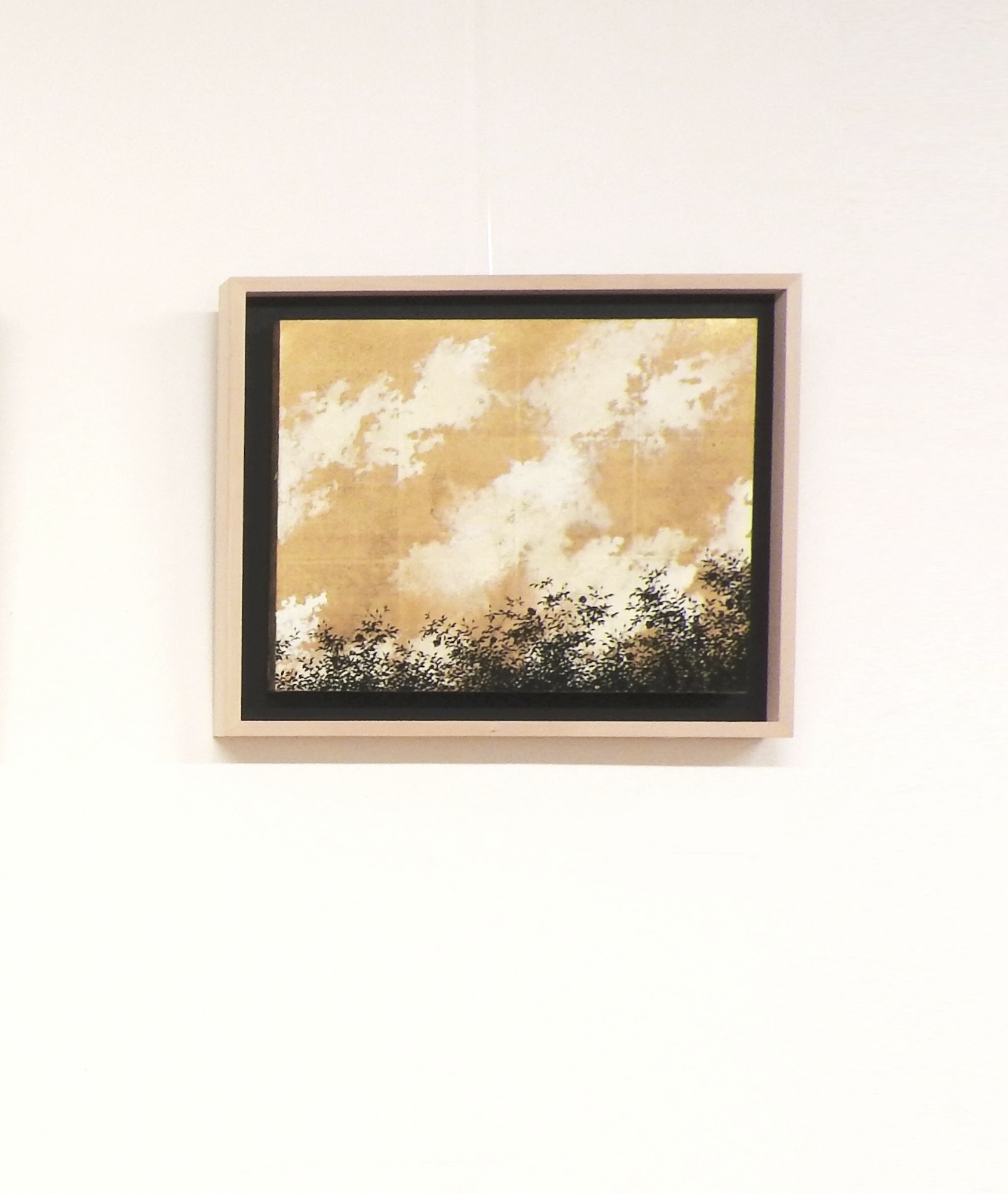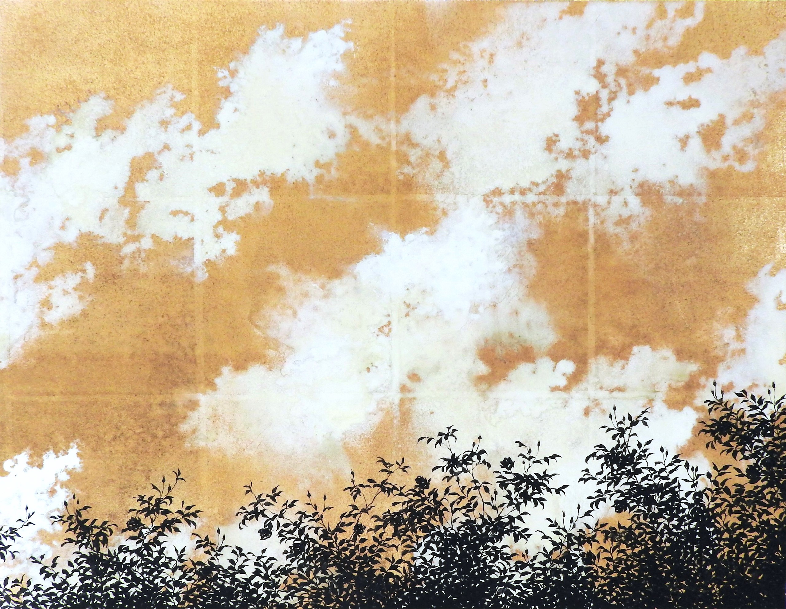Empathy towards Things is a painting by Japanese artist Shoko Okumura from the series Empathy Towards Things. This painting depicts white clouds against a golden sky, with black silhouettes of trees in the foreground.