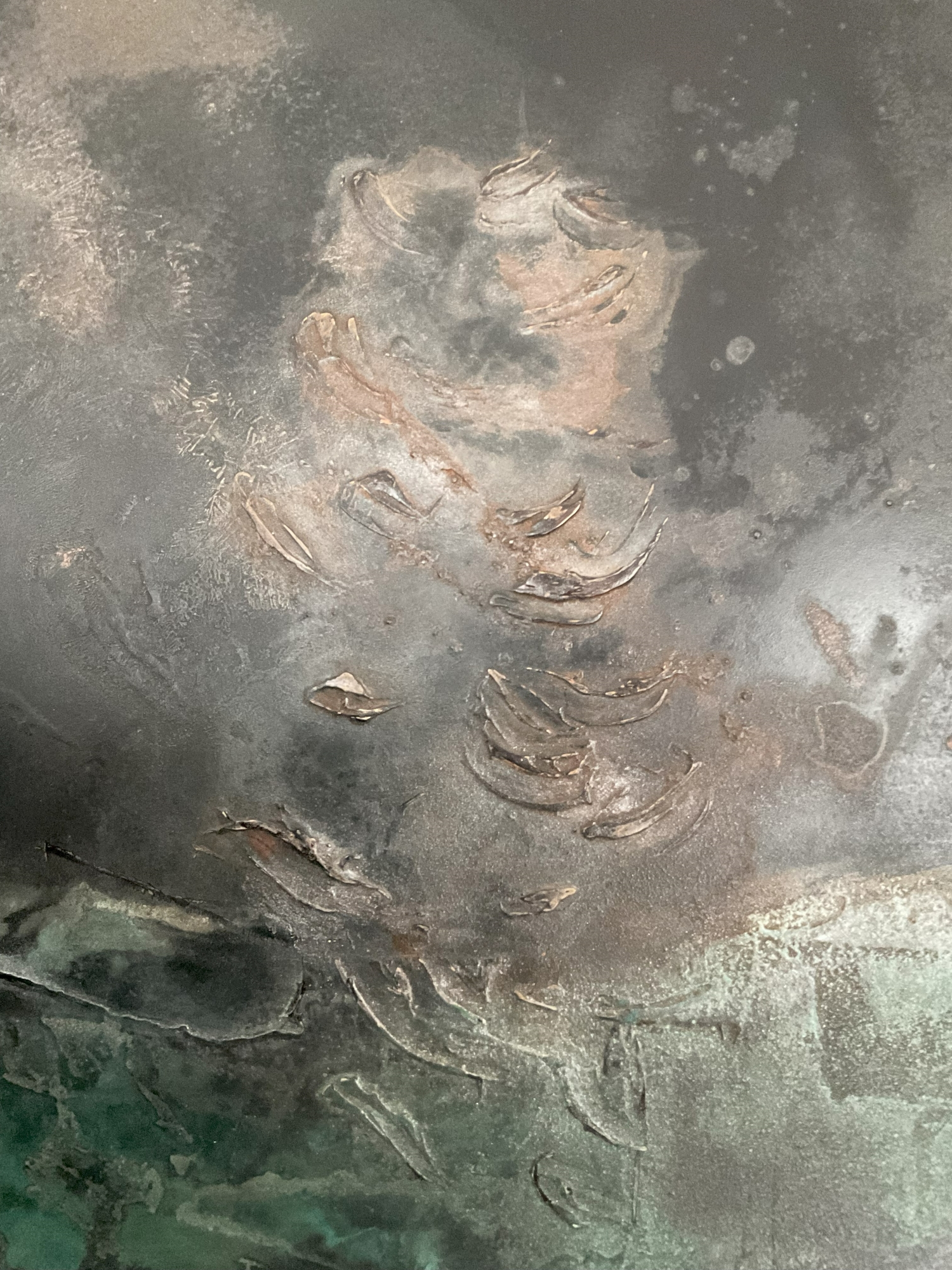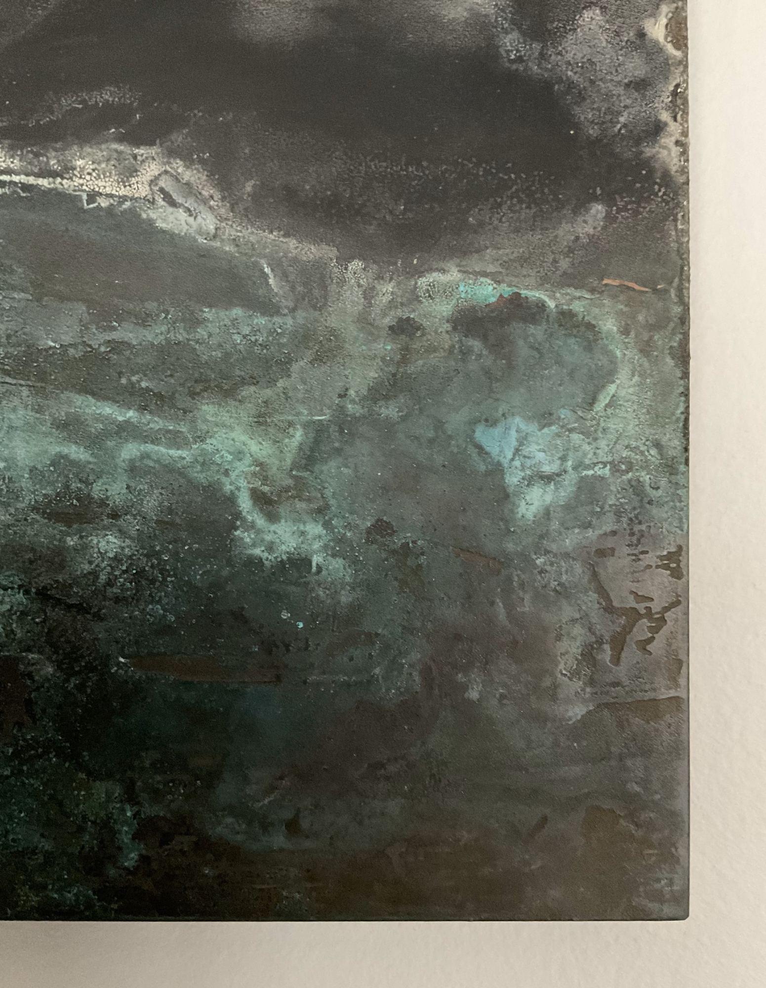 Description: Oxidized zinc and bronze leaves on aluminum panel, patina fixed with beeswax polish
