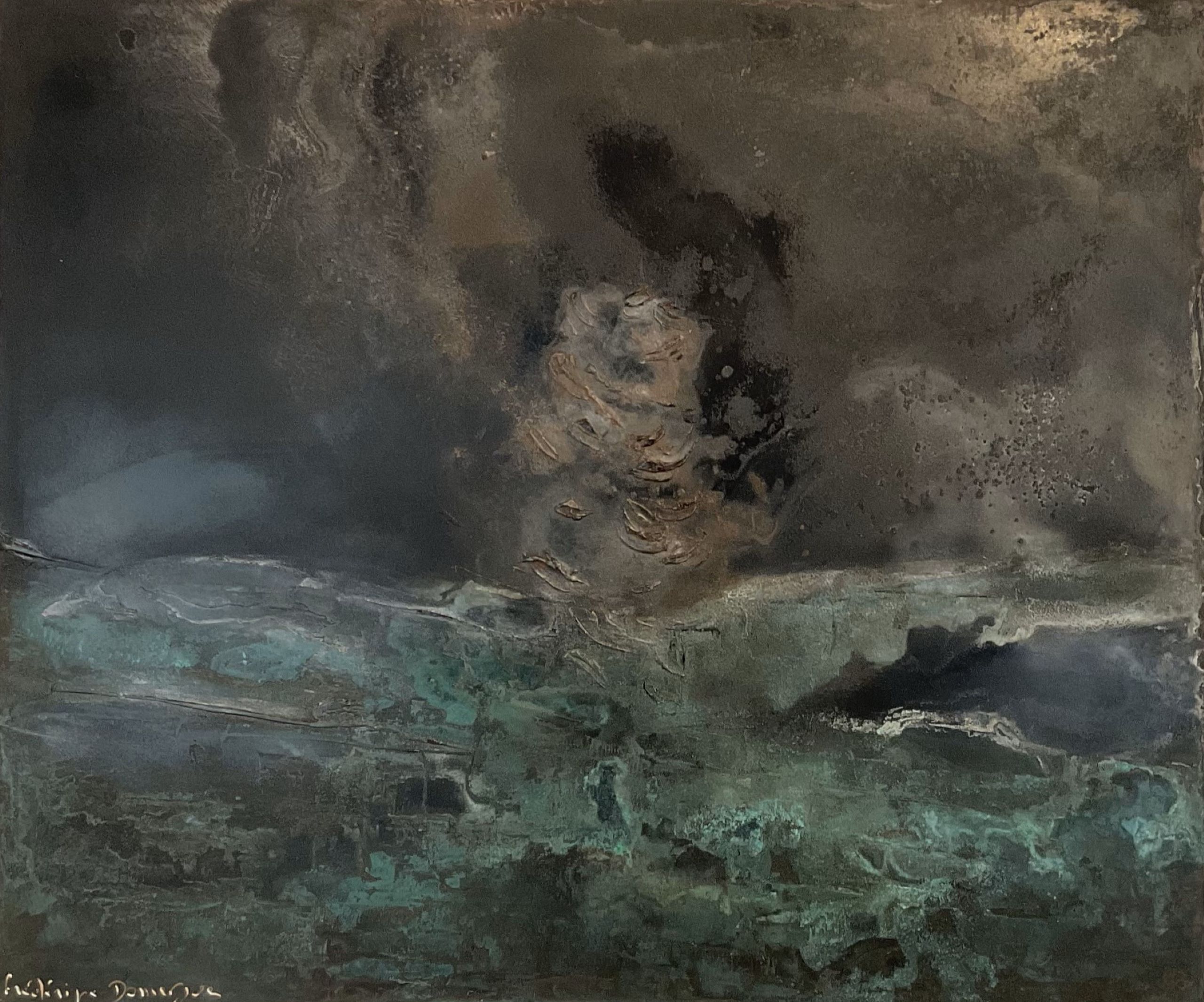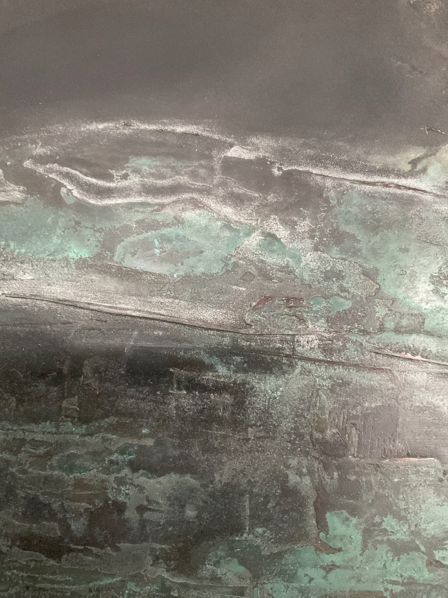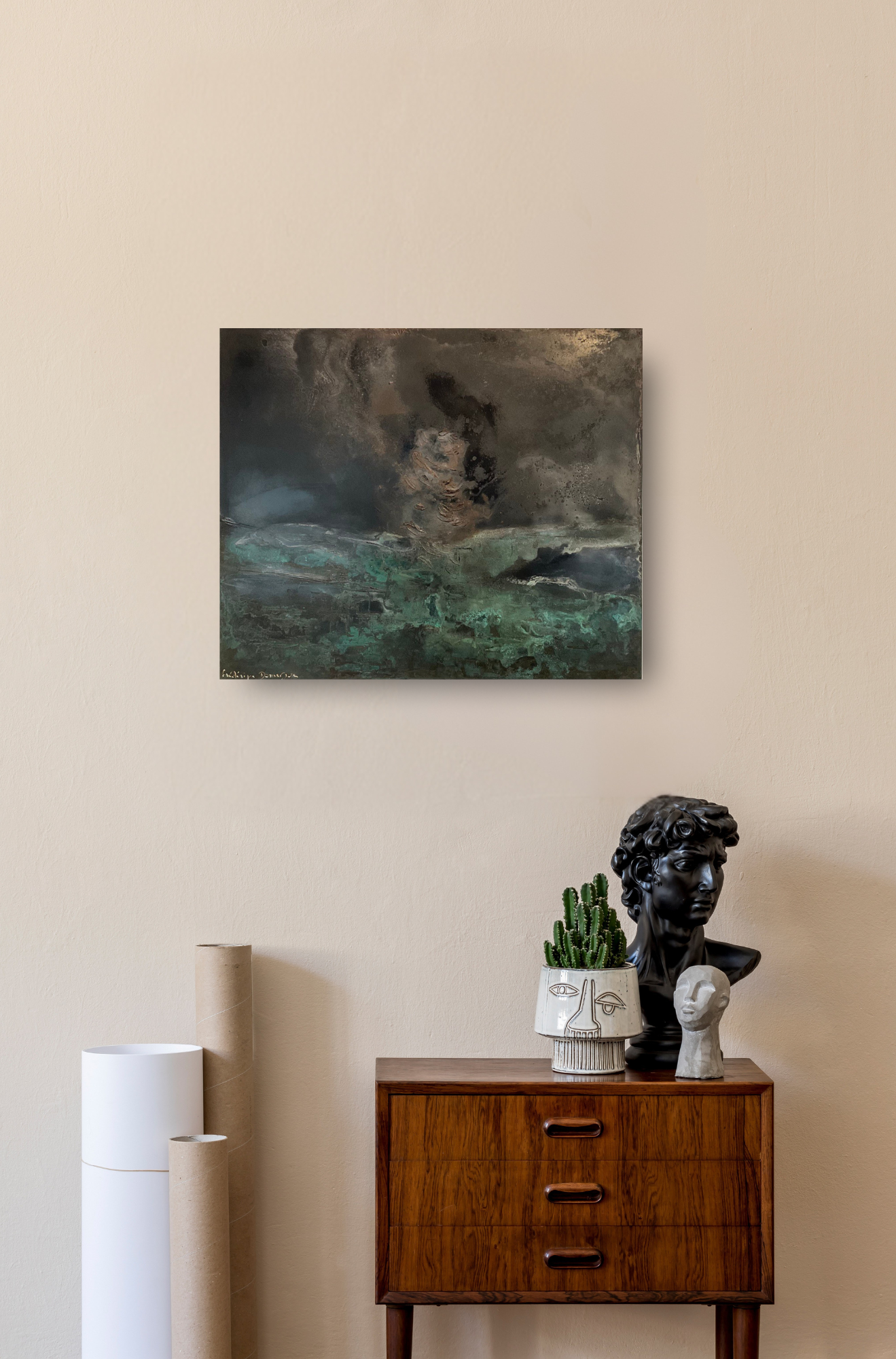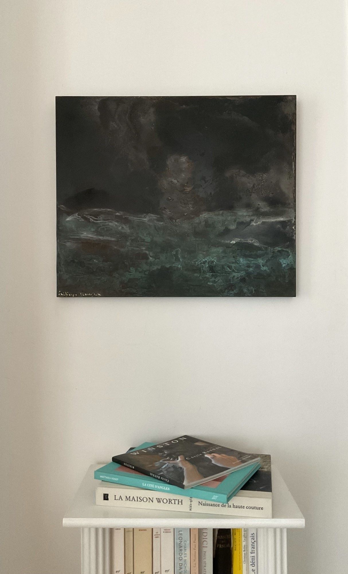 Frédérique Domergue finds her inspiration in nature and especially in the seaside. Her paintings evoke landscapes, skies and seas that are sometimes calm and tranquil, sometimes dark and turbulent. Here, the artist’s abstract piece could be of a turquoise wave breaking under a dark sky.