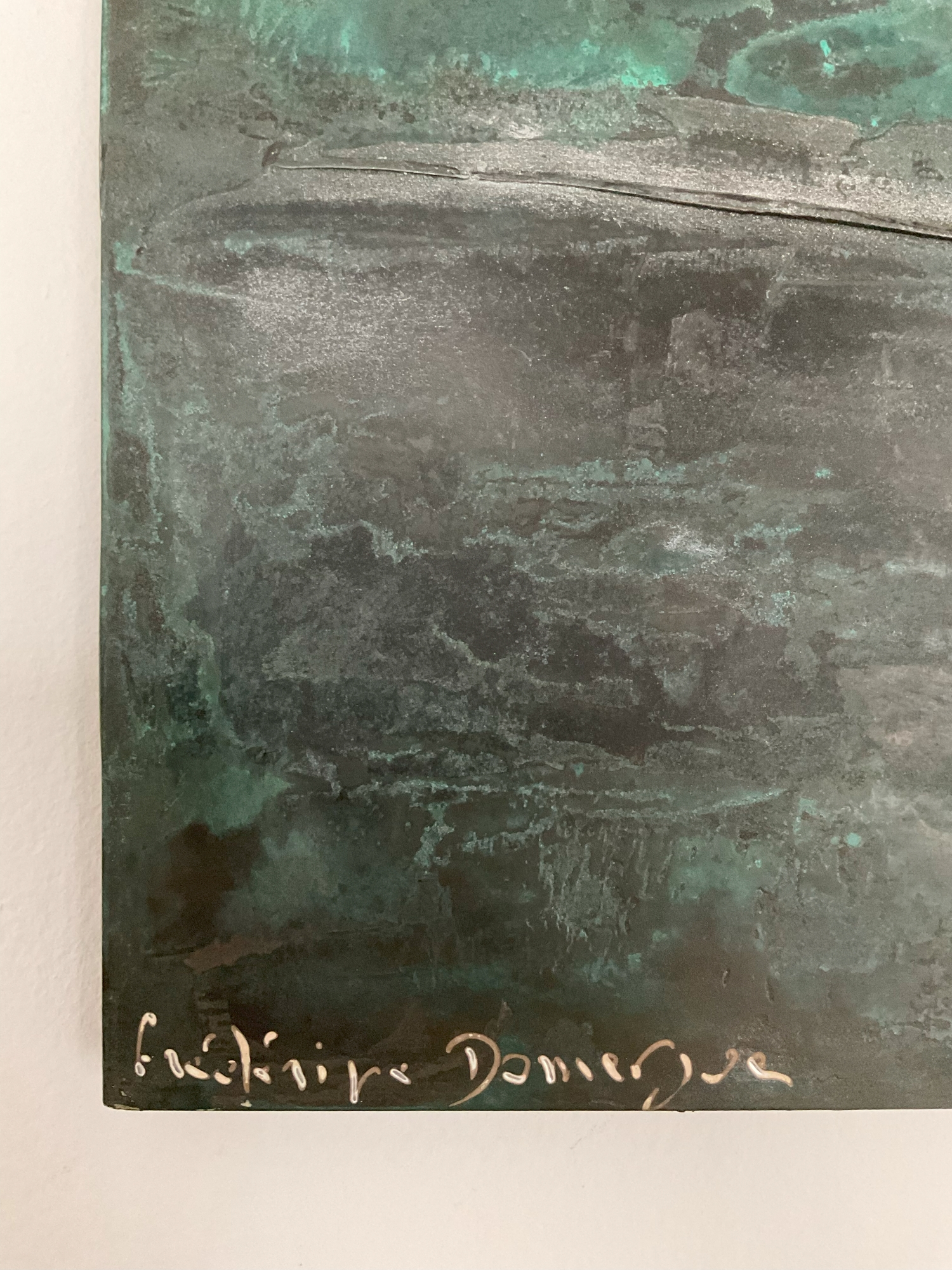Frédérique Domergue uses thin sheets of metal applied on wood or aluminum panels. Through a patient process of polishing and oxidation the artist manages to confer a warmth and sensuality which tempts the observer to caress the oxidized surface of her paintings, now become all radiant and silky.