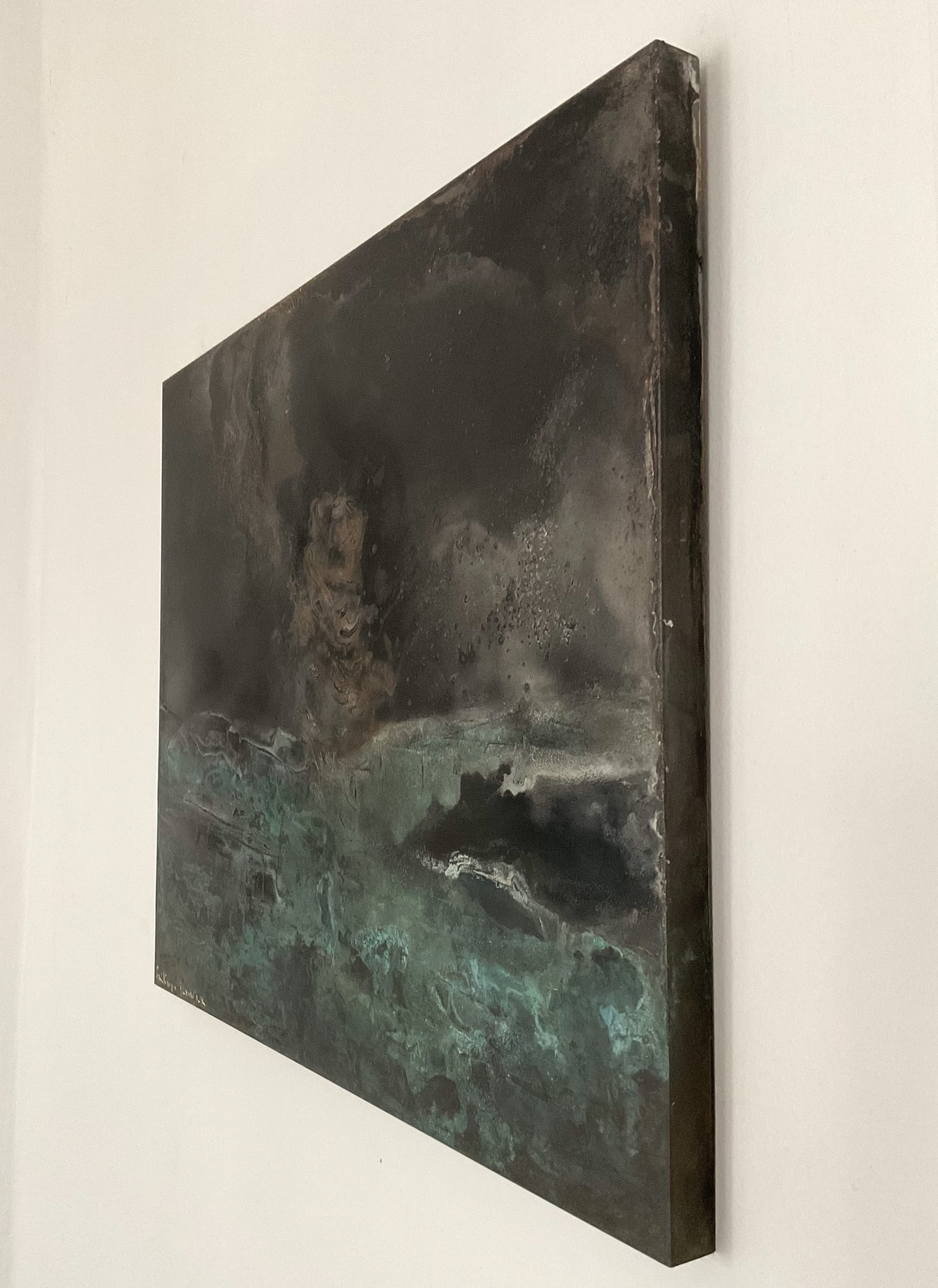 | Description | Oxidized zinc and bronze leaves on aluminum panel, patina fixed with beeswax polish |