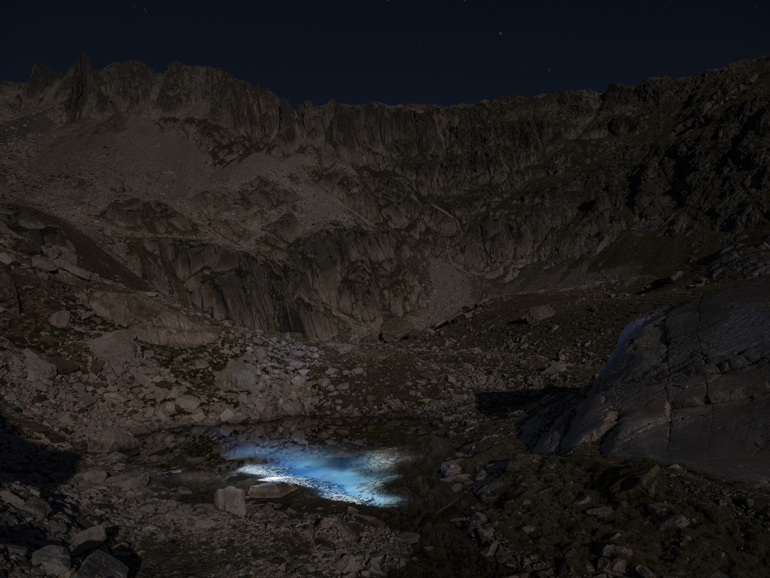 “There was a time when the mountains were inhabited by gods, giants and dragons. Every peak, every standing stone and every chasm had its own story, its own power. Water, in particular, was the focus of veneration: inhabited by fairies and nymphs, it inspired awe and wonder in equal measure. Today, these beliefs have faded under the weight of exploitation. […] But the mountains have forgotten nothing. They continue to whisper to those who know how to listen. The Encantats series was born of this listening. Taken at night, by the light of a full moon, it plunges us into a world where water seems to emit its own light, as if it were still inhabited. Torrents of light, golden waterfalls, opal lakes, phosphorescent glaciers… Each image seems to emerge from an ancient dream. In this darkness where landmarks waver, the boundary between reality and fiction is blurred. Water becomes a character, a breath, an enchantment. […] By giving water back its share of mystery, I hope to rekindle a bond of respect, wonder and listening in a context of ecological urgency. Because the magic hasn’t disappeared. It dives in, emerges, insinuates itself, transforms itself. It reveals itself at night, when the moon is full. It still flows for those who know how to look and feel.” Xavier Dumoulin