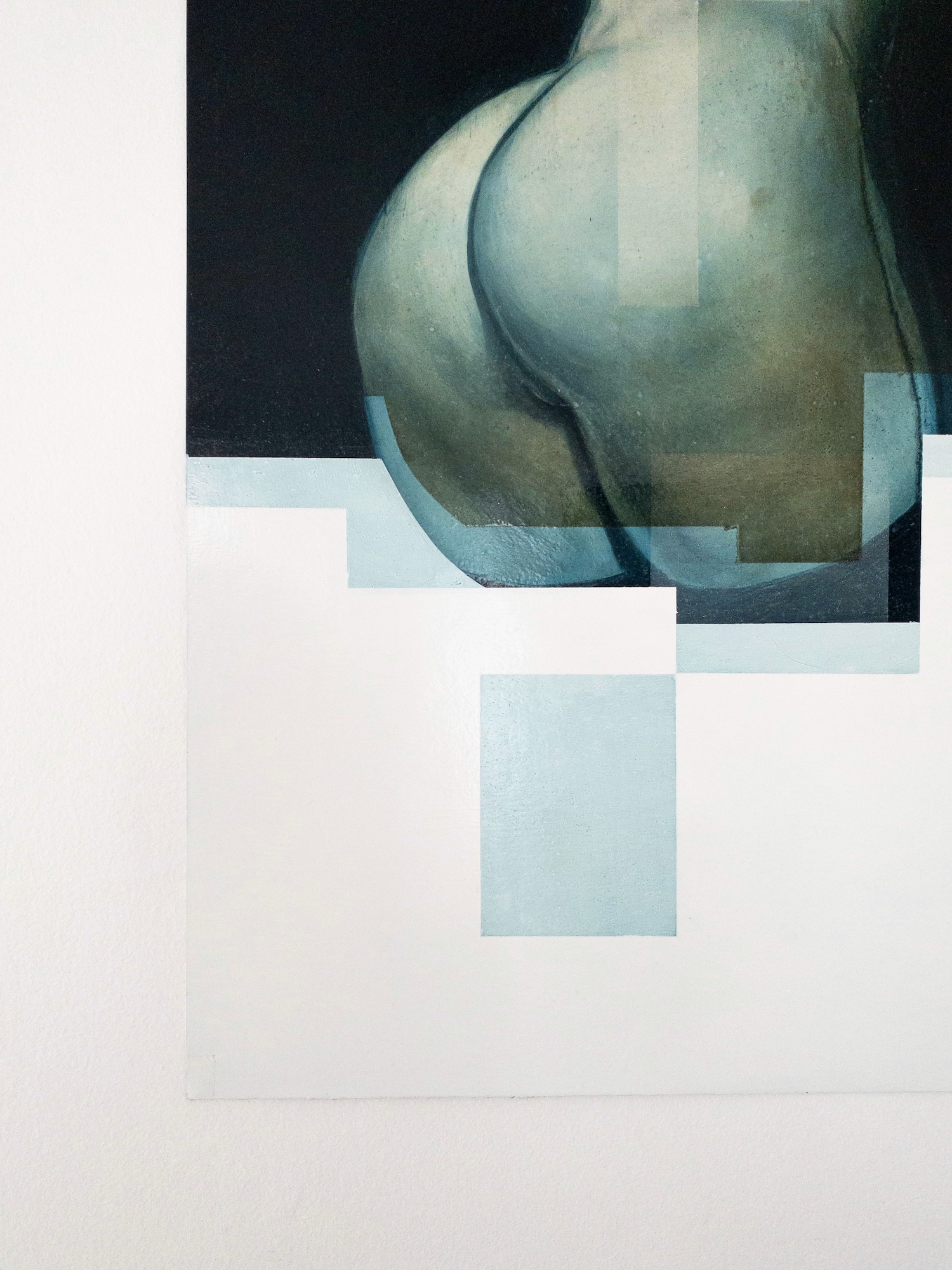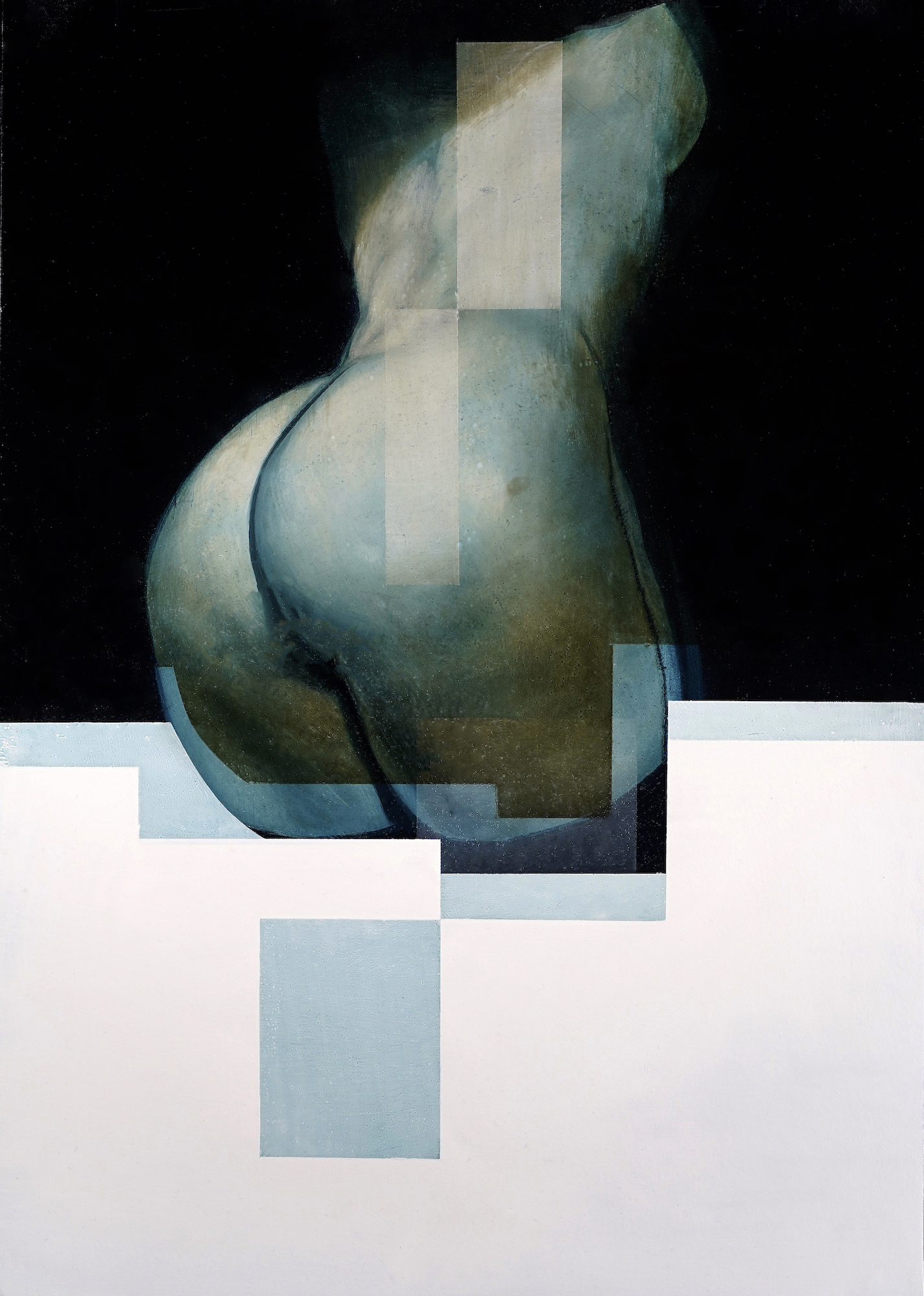 In this artwork, the artist explores the human body. Geometric shapes intersect with curved ones, creating a visual dialogue between the body’s natural lines and structured abstraction.