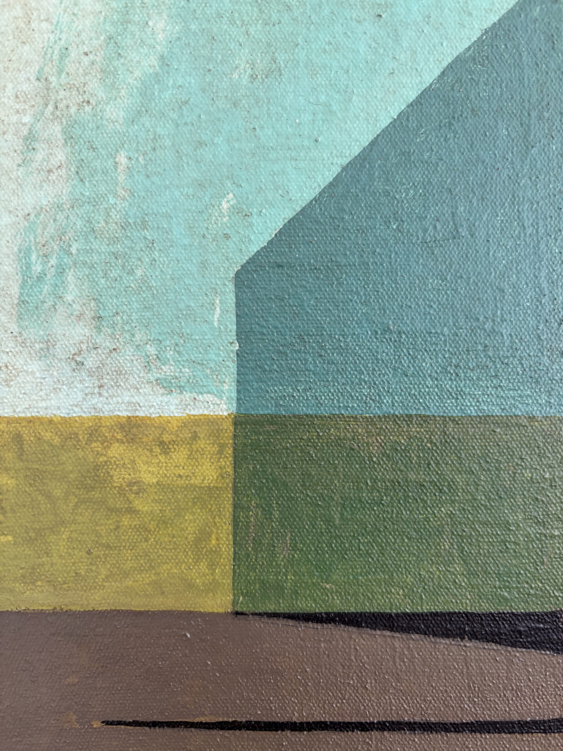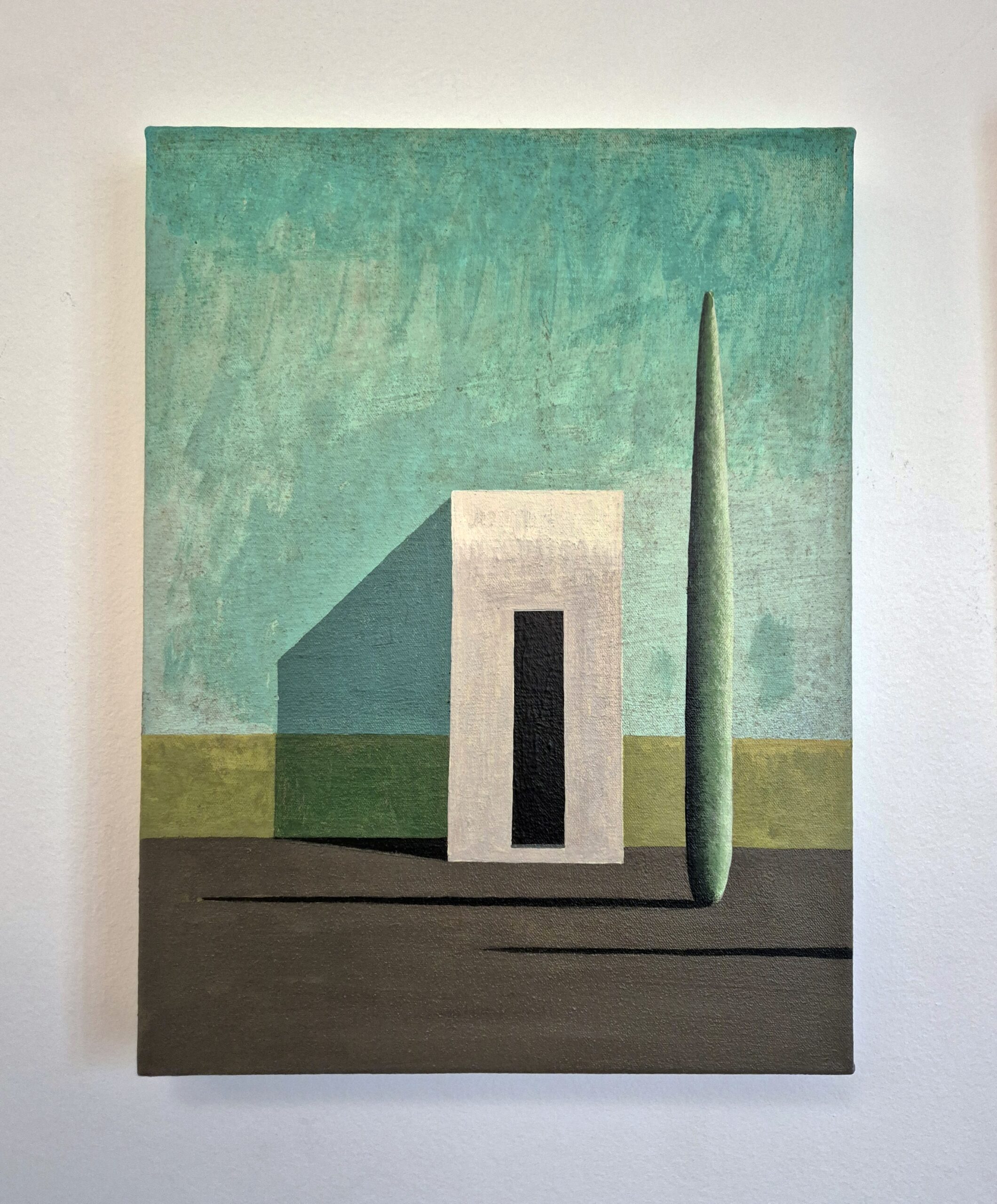 The illumination and presentation of these stripped-down elements, with a prominent cast shadow defining the light source, create a distinctly dramatic perspective on architecture. The vibrant, textured turquoise of the sky and the minimal, nearly abstract surfaces of the ground and buildings contribute to the artwork’s potent beauty. Encouraging the viewer to contemplate these surreal, quiet settings, Ramon Enrich transports us on an internal voyage that is more introspective than geographical. This piece, aligning with the artist’s philosophy, seeks to “let something hidden be seen, allowing inexplicable connections,” resulting in a feeling of deep, yet appealing, solitude and wonder.