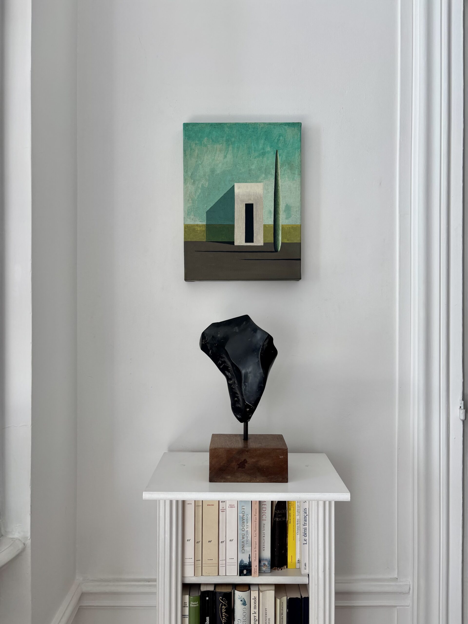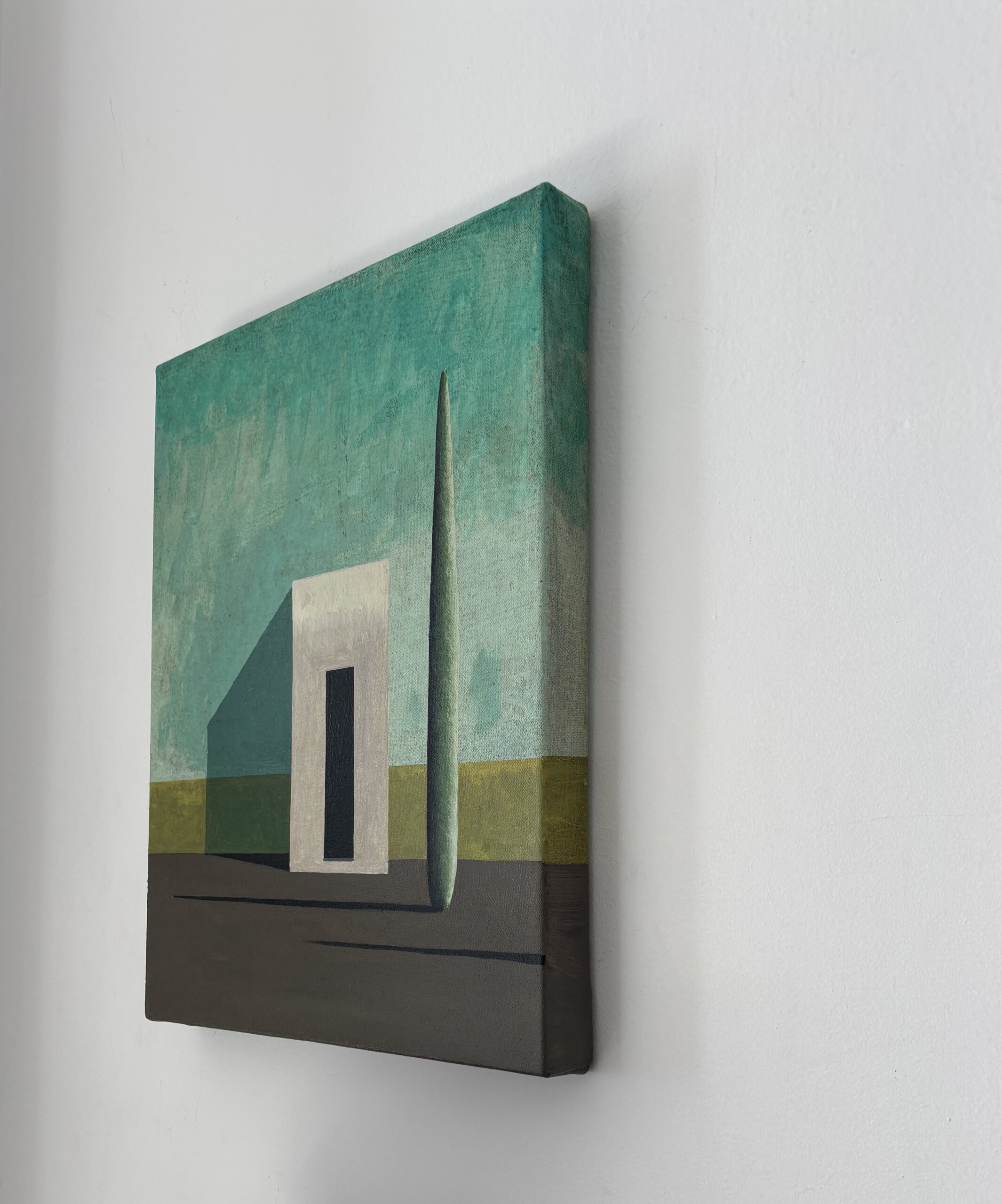 This artwork demonstrates a characteristic interplay between built structures and natural scenery, unveiling a figurative composition marked by bold geometric forms and a decidedly mysterious mood. The visual structure is primarily composed of a single block-like, geometric architectural shape and a tall, tapering conical form set against a wide, textured turquoise background and a layered foreground featuring a dark plane, a thin green band, and a central white form, evoking a sense of contained, quiet emptiness.