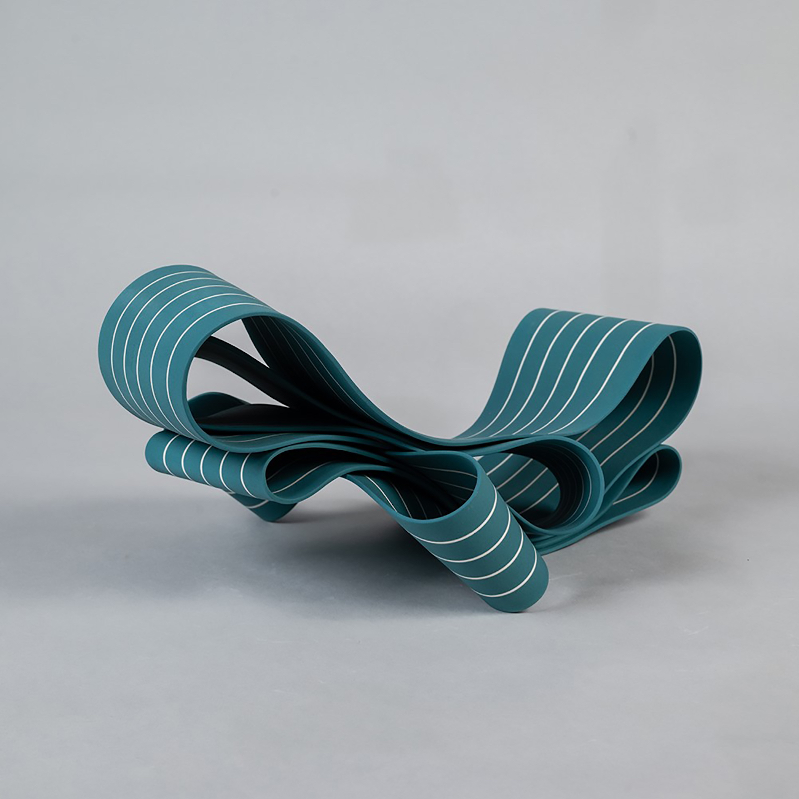 This sculpture is part of the sculptor’s most recent work, in which she uses paper porcelain (porcelain with 0.5% paper fibre added for greater flexibility) to create organic, dynamic and natural shapes. The artist tests the physical limits of the material (its collapse during firing) and plays with the balance between the full and empty spaces created by the shapes. She assembles different pieces to build her sculptures, but because of this process of collapsing, the final result after firing is always open to the unexpected. Colour is an important feature of this sculptural production, likely to elicit an emotional or psychological response from the observer. The linear patterns on the surface follow the viewer’s gaze along the curves, accentuating the soft, light, fluid look of the sculptures.