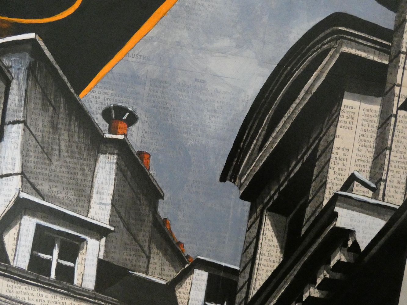 Megacities are the artist’s favorite subject. Through his paintings, Guillaume Chansarel attempts to capture the city’s graphic identity, as a photographer would press the shutter button on his camera. The uniqueness of the artist’s work lies in the realistic aspect of his work but also on the original use of an innovative support : pages of print from antique books onto which he draws and then paints, and consequently which tells a completely new story.