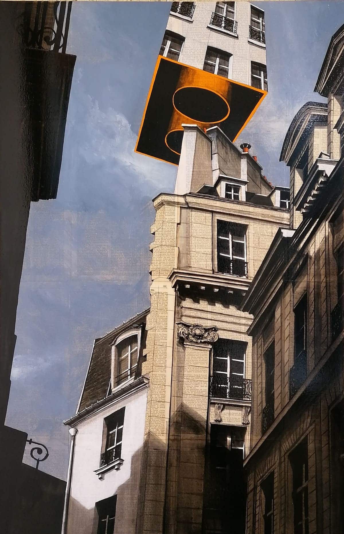 In this figurative landscape, an orange cube with the façade of a Haussmann building on one face, floats in the sky. This type of work, playing with perspective and light, is drawn from Guillaume Chansarel style, lending a realistic effect to his figurative paintings. In this new series, the realism is turned over by the eruption of coloured cubes, as if suspended in the sky.