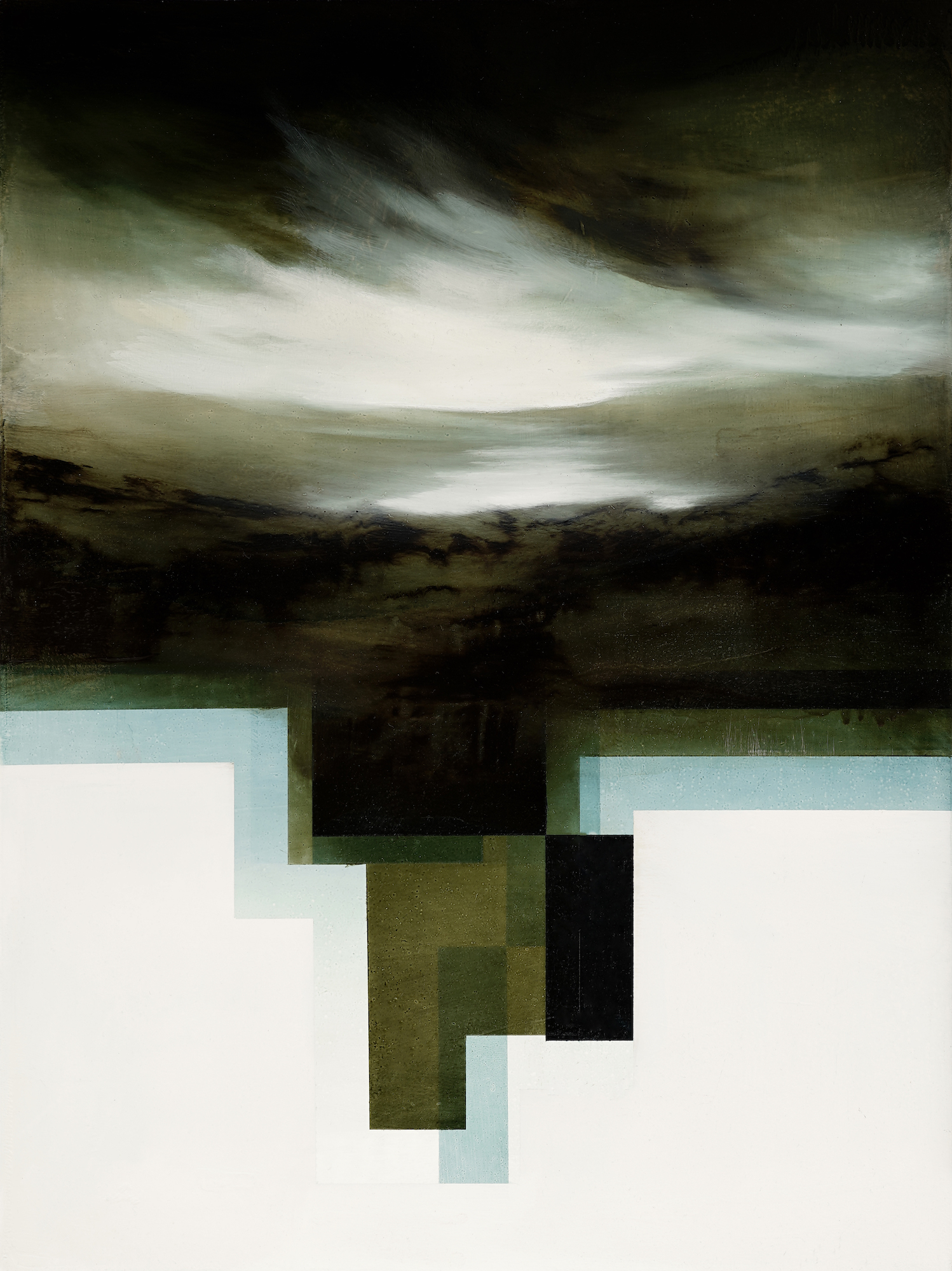 Between abstraction and figuration, Joachim Van der Vlugt’s artworks are created through an amazing work on the light. Whereas the painted subjects let the spectator free to identify a dreamlike world, the artist’s work on the light structures the painting and creates the peculiar and fascinating feeling of reality. Here, dark and light colors combine and create an imaginary landscape. The geometric forms which superimpose in the foreground, like clues of an altered reality, incarnate the tacit agreement of a pictorial illusion that the artist is sharing with the spectator.