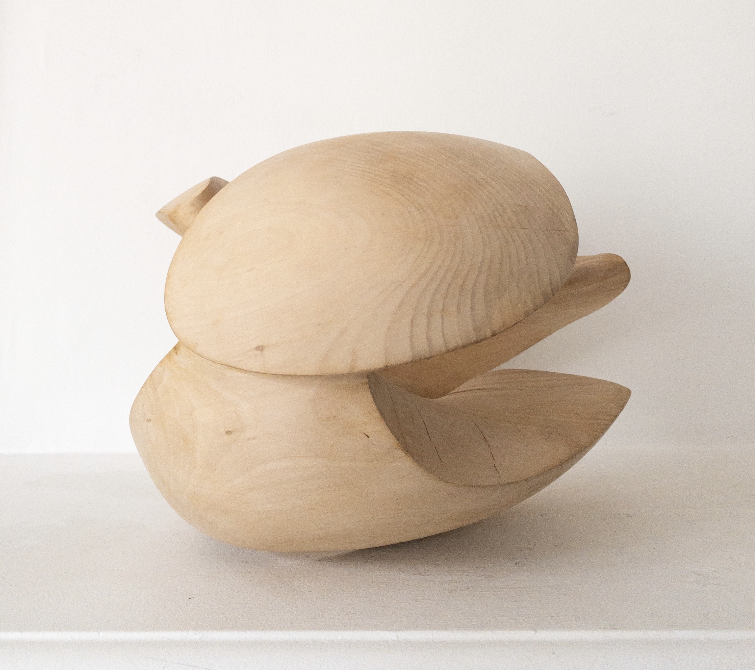 This sculpture is made from wood, a material the artist favours for its naturalness, texture, smell and the way it feels to the touch. The sculptor uses only local woods and chooses them on the basis of their size, which is where the sculptural potential lies. The artist approaches this living material with great respect. He imposes his will on the material to sculpt it, but at the same time, the wood itself directs his work with its imperfections, shapes, knots, and blackened elements.