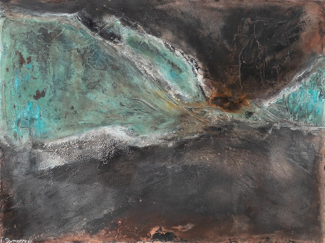 Frédérique Domergue uses thin sheets of metal applied on aluminum panels. Through a patient process of polishing and oxidation the artist manages to confer a warmth and sensuality which tempts the observer to caress the oxidized surface of her paintings, now become all radiant and silky.