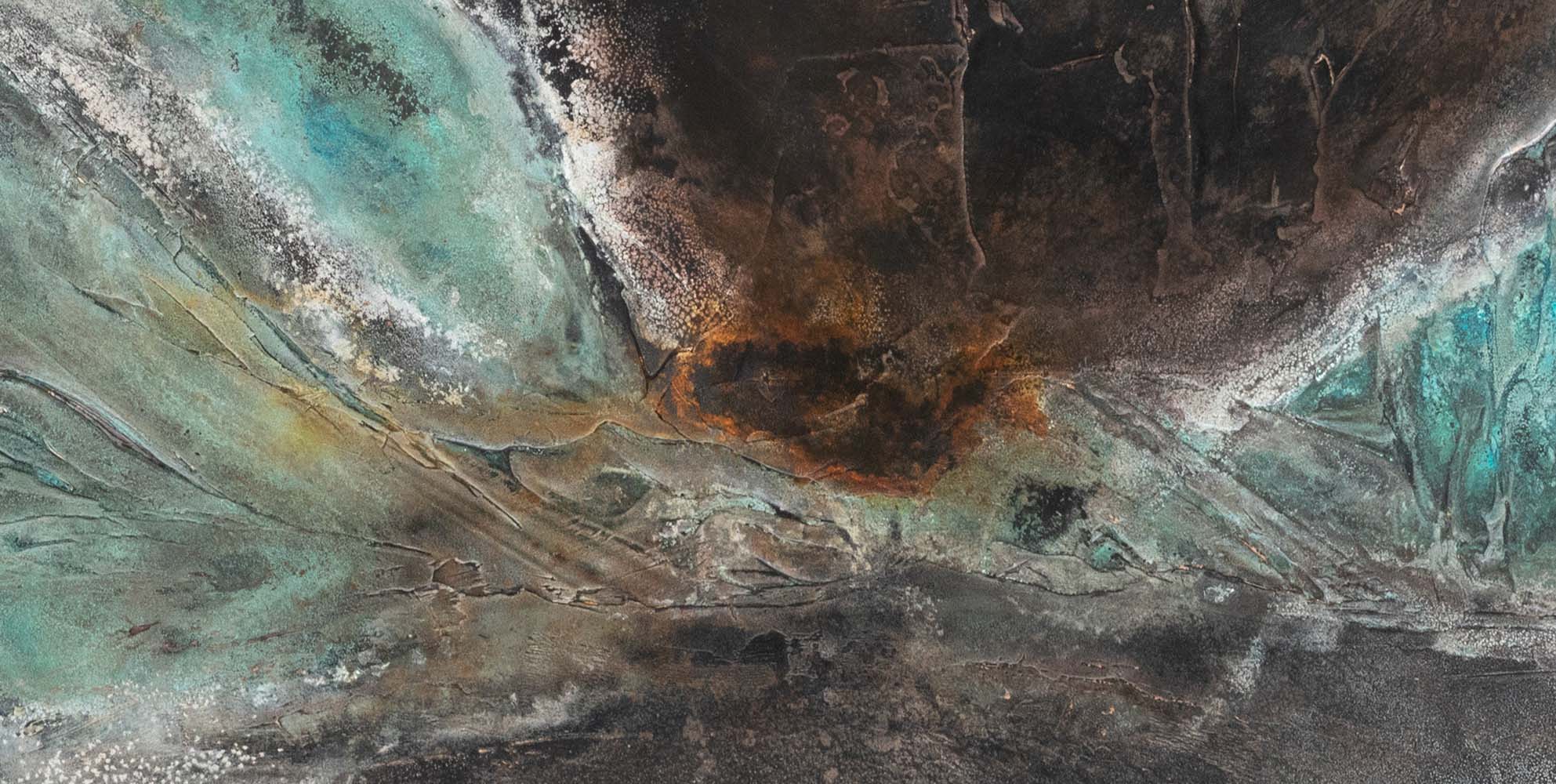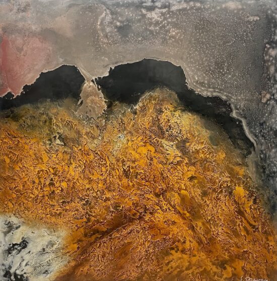 Frédérique Domergue finds her inspiration in nature. Her paintings evoke landscapes, skies, mountains and seas that are sometimes calm and tranquil, sometimes turbulent, dark and ablaze. In this work, the title suggests the representation of a mountain landscape.
