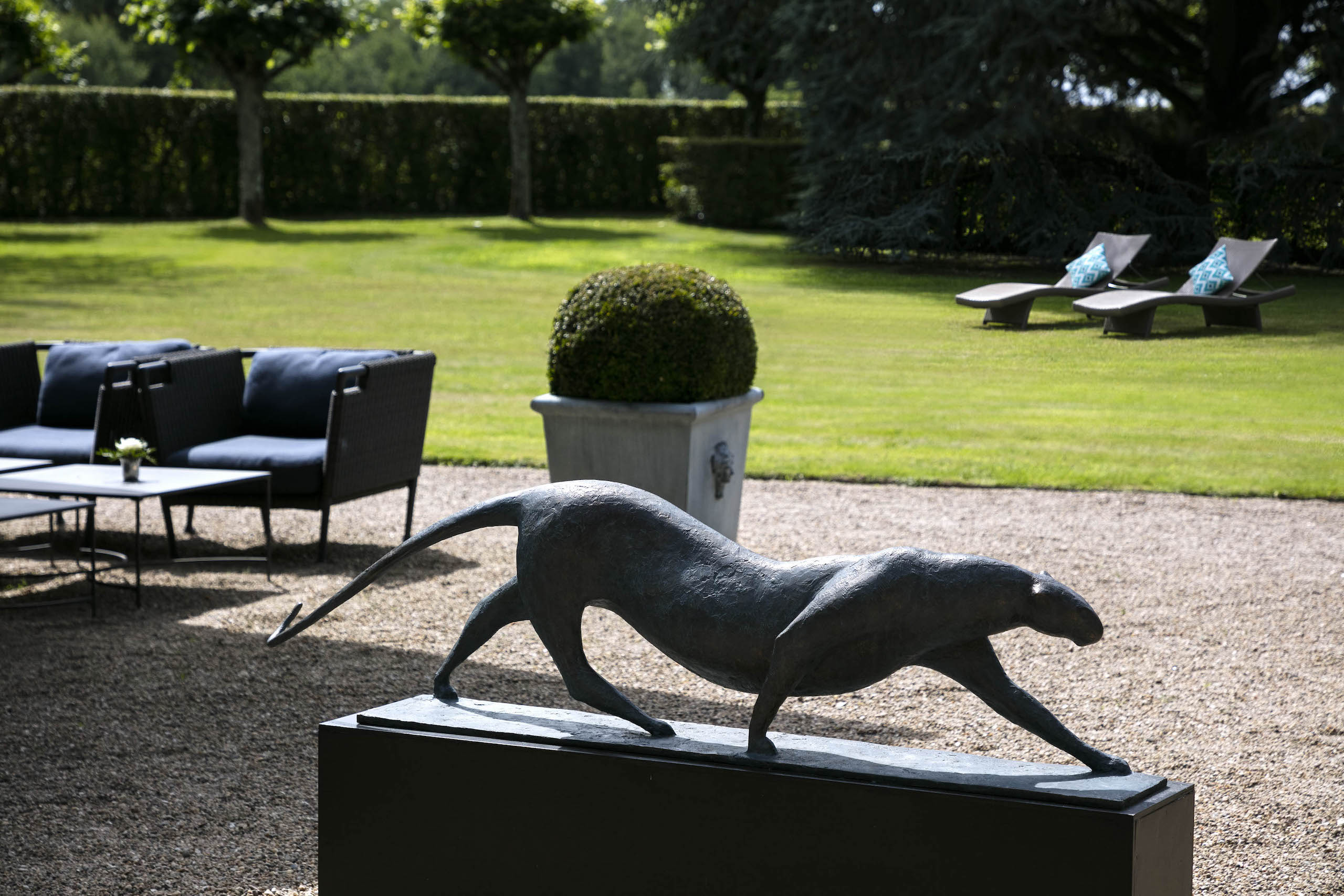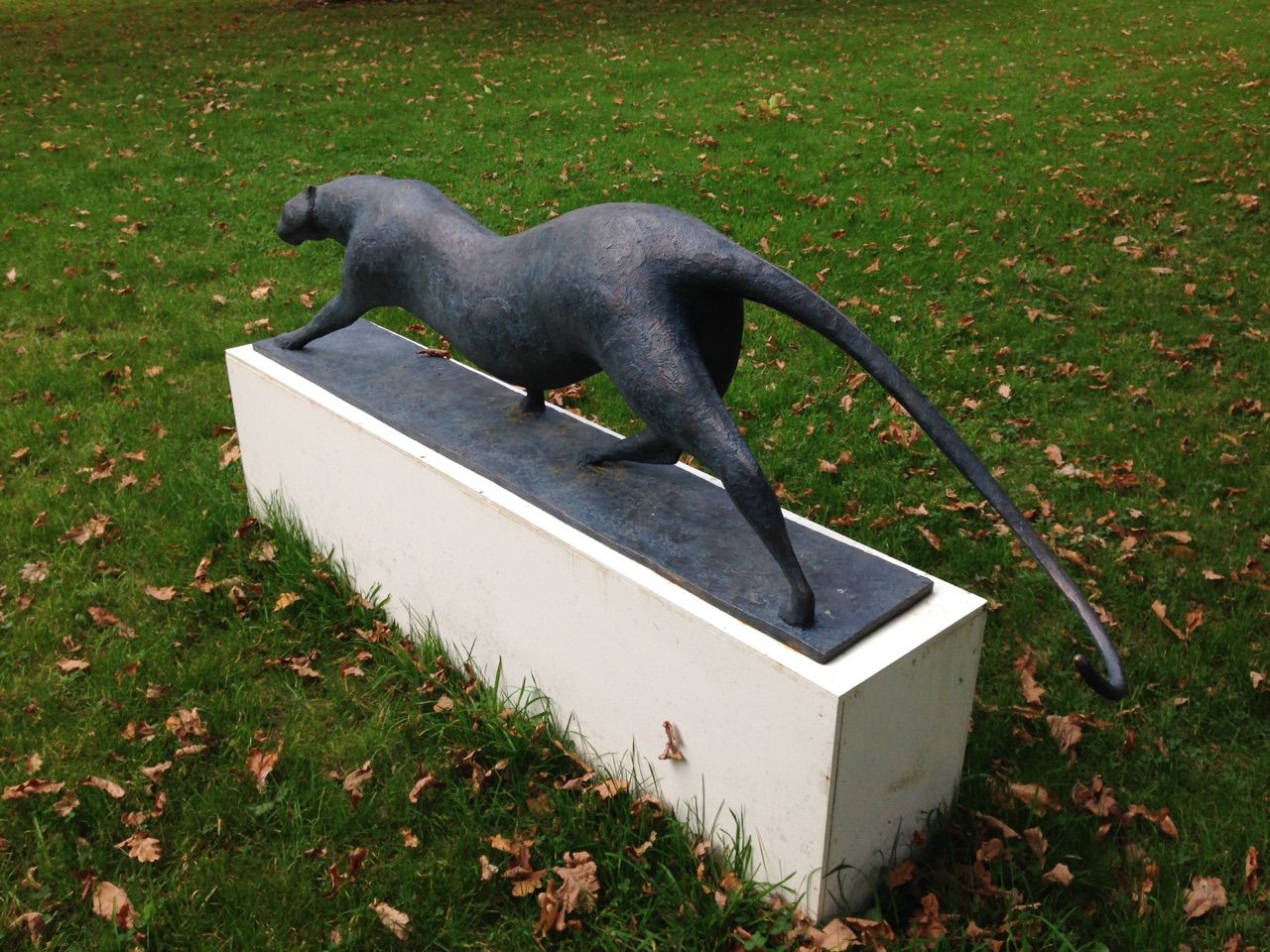 This monumental bronze sculpture depicts a feline. This animal, the perfect symbol of the brave and courageous guardian, is shown here with great elegance: its limbs are refined, its position is as peaceful as it is delicate, frozen between the time of action and the time of observation.
