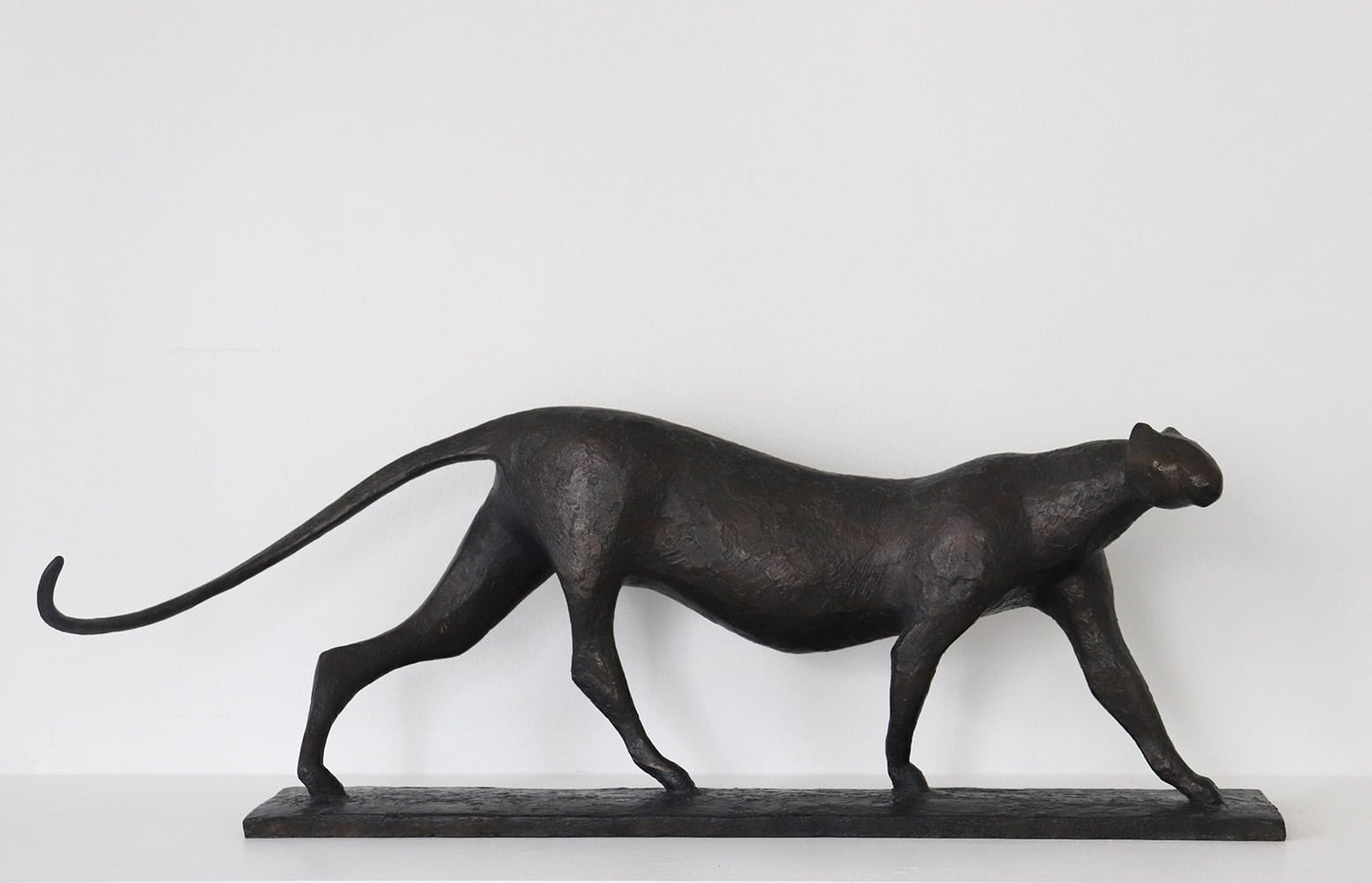 This bronze sculpture represents a walking feline, which seems to be in a hunting position: the body stretched out, almost at ground level, and the head forward. The artist does not identify the type of feline through the title of the work but its slender silhouette evokes that of a cheetah. With this sculpture all in curves and tension, the artist delivers a work of great elegance, which pays tribute to the power and the wild beauty of the big predators.