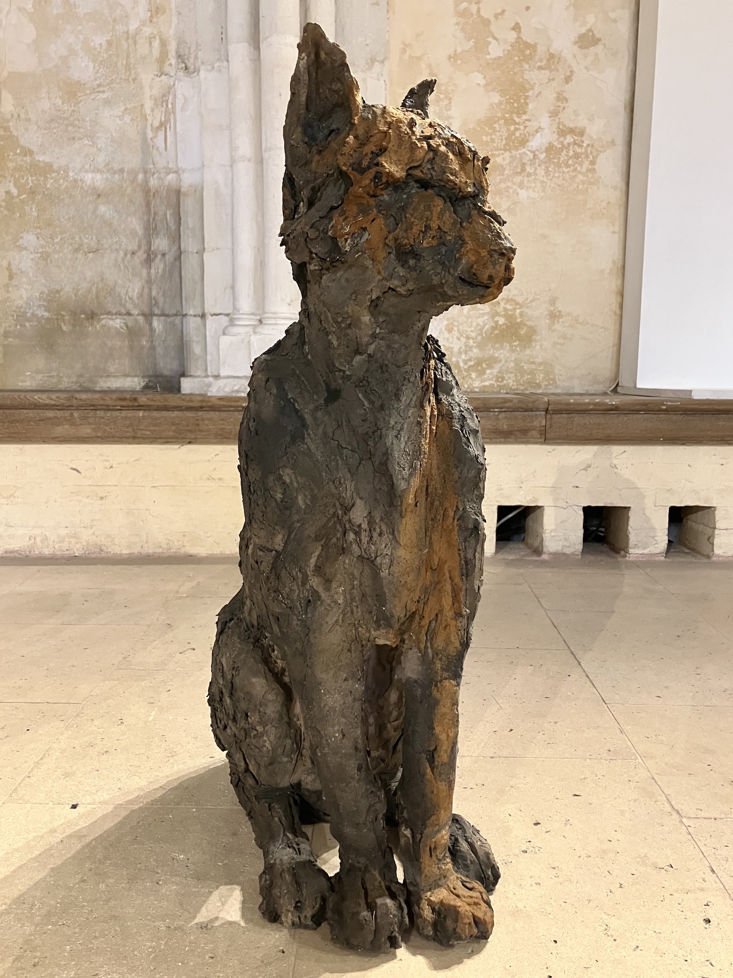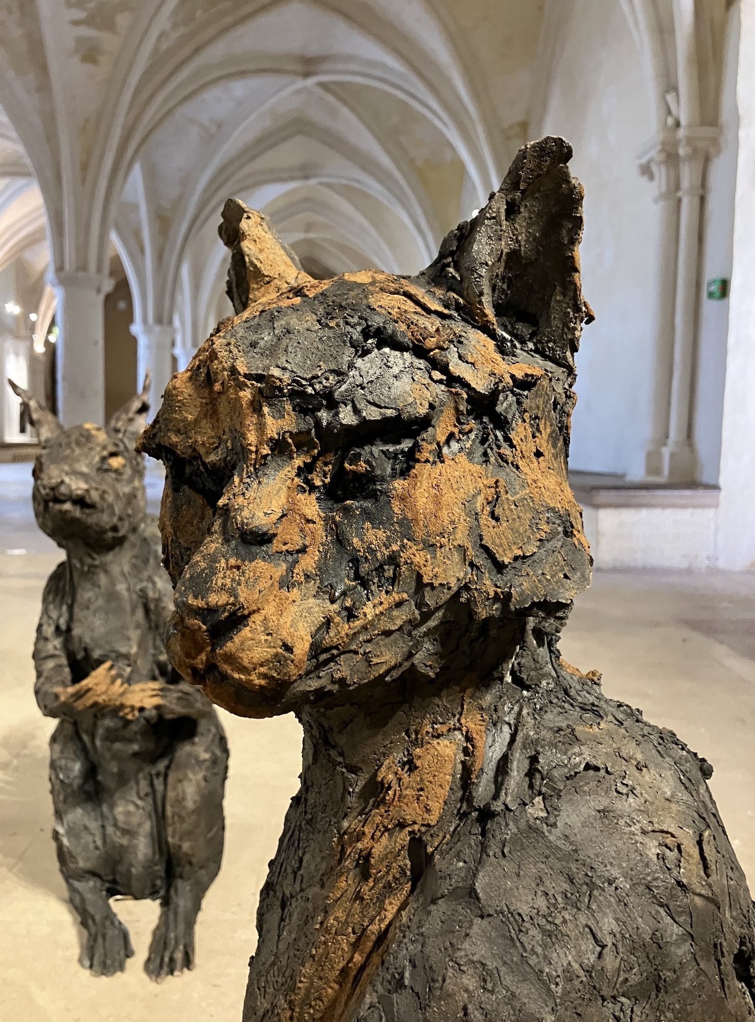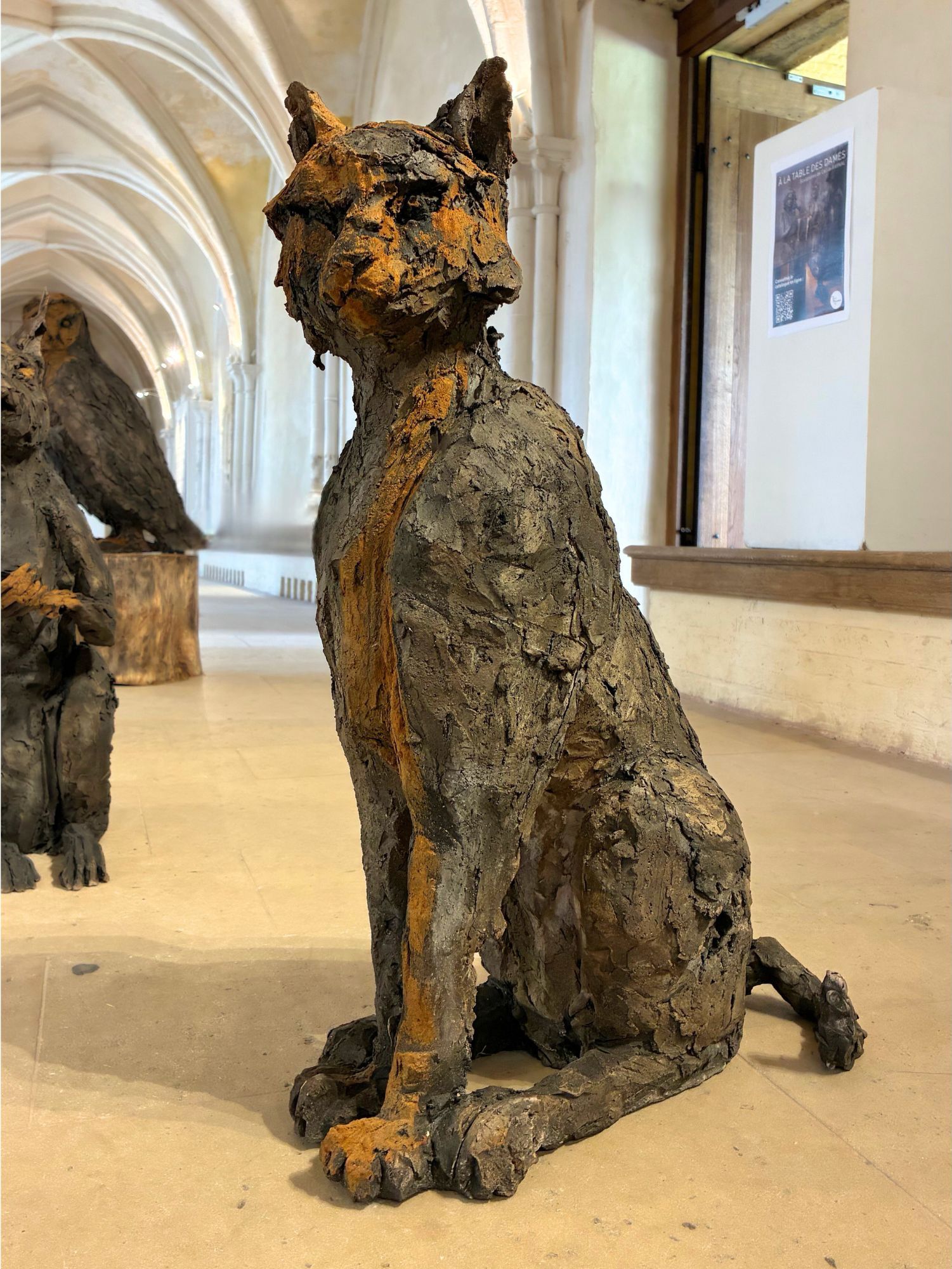 The installation Chœur de bêtes (Choir of beasts), on which the artist has been working for several years, has been exhibited at Cécile Raynal’s solo show, À la table des Dames (At the Ladies’ table), at Montivilliers Abbey in Normandy (2025). In this historic site, long home to women, nuns and abbesses, the sculptor has chosen to present works combining portraits of women and animals. Cécile Raynal’s sculptures do not seek to seduce, and can even sometimes appear disturbing. Rough, they bear the marks of a passage through matter, through trial, and yet they stand upright, alive. They conjure up a world in which the animal, feminine, instinctive or rebellious side is embraced as an essential force. In the restored Abbey, the exhibition retraces the last fifteen years of the French artist’s singular career (more information on the exhibition here).
