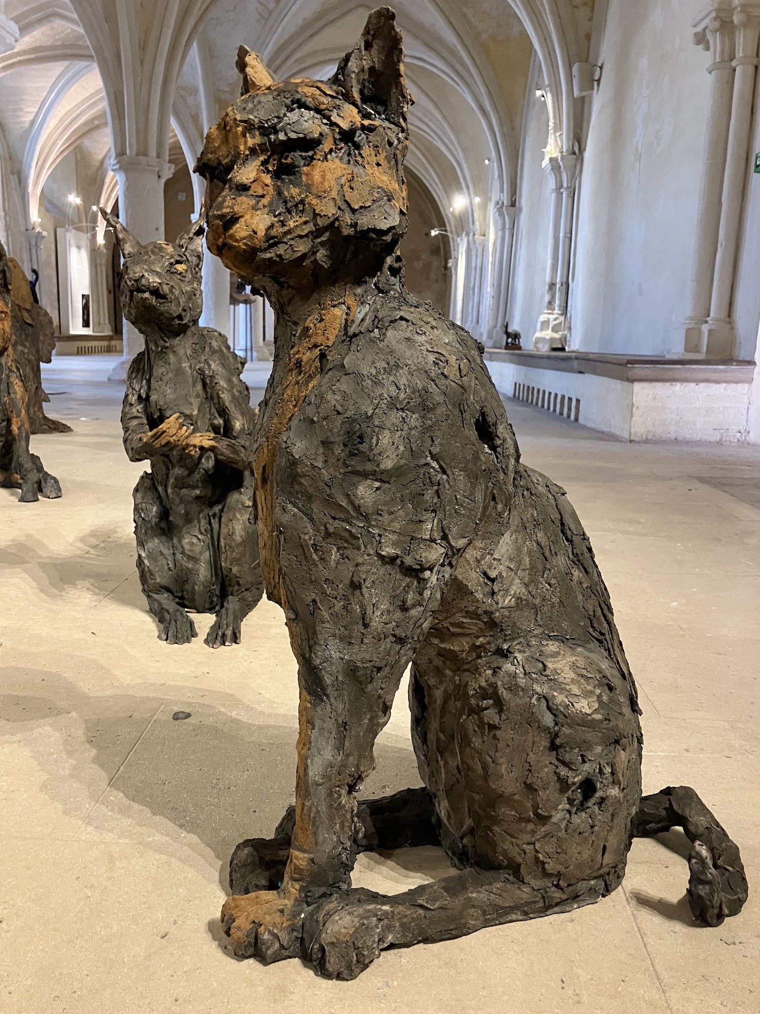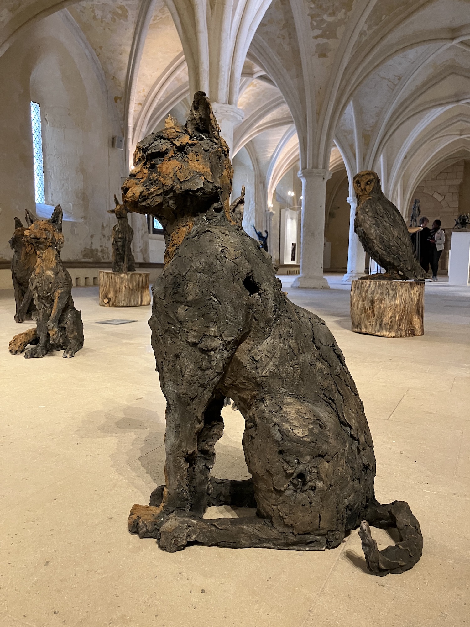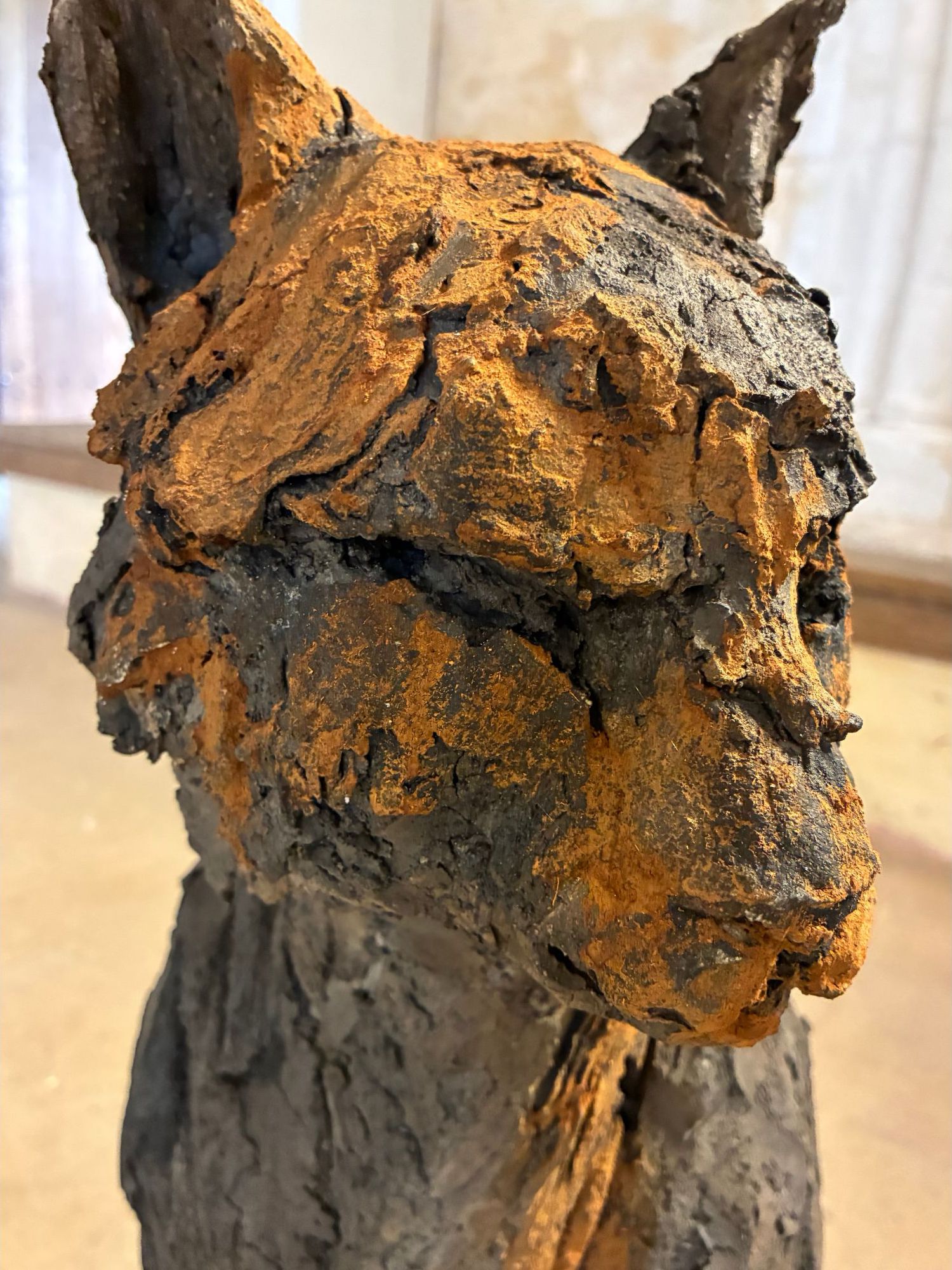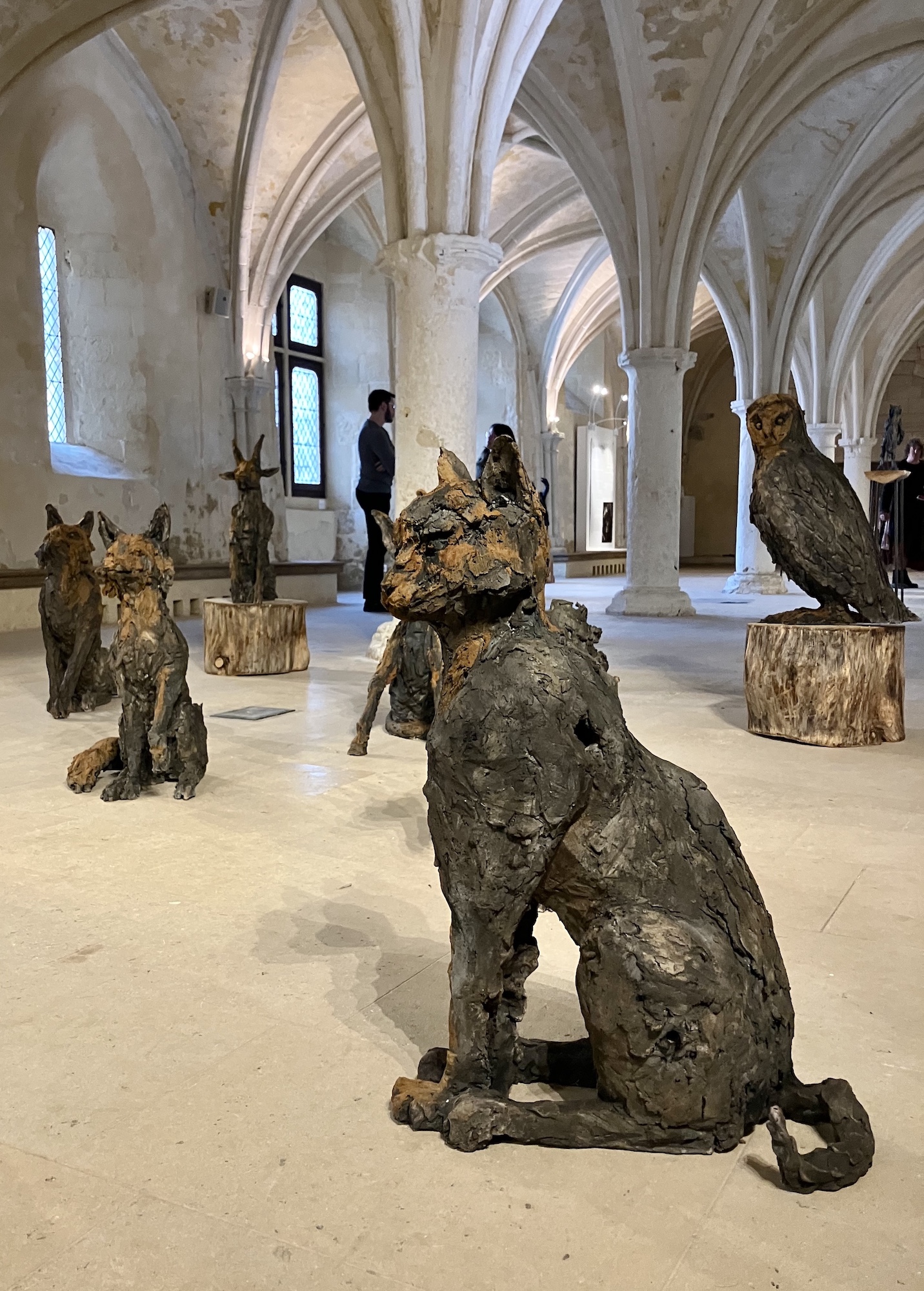 The installation Chœur de bêtes (Choir of beasts), on which the artist has been working for several years, has been exhibited at Cécile Raynal’s solo show, À la table des Dames (At the Ladies’ table), at Montivilliers Abbey in Normandy (2025). In this historic site, long home to women, nuns and abbesses, the sculptor has chosen to present works combining portraits of women and animals. Cécile Raynal’s sculptures do not seek to seduce, and can even sometimes appear disturbing. Rough, they bear the marks of a passage through matter, through trial, and yet they stand upright, alive. They conjure up a world in which the animal, feminine, instinctive or rebellious side is embraced as an essential force. In the restored Abbey, the exhibition retraces the last fifteen years of the French artist’s singular career (more information on the exhibition here).