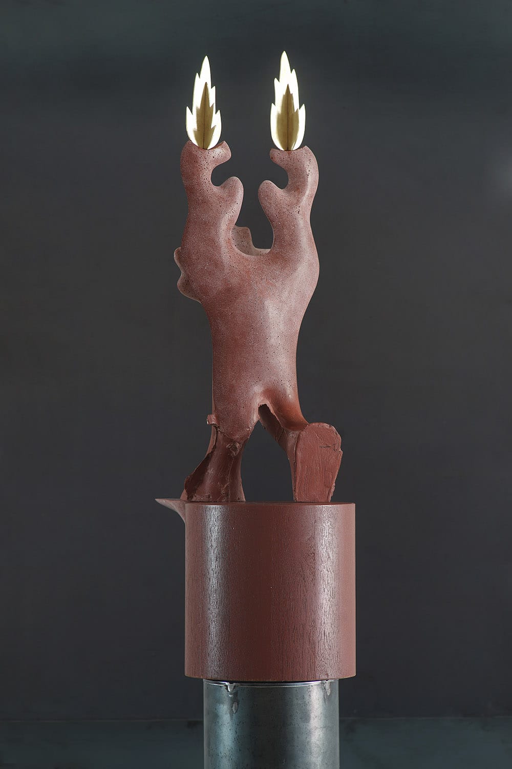 The walking creature in this sculpture is born out of the artist’s imagination and personal vision; this work seems to represent an anthropomorphic figure, a ‘flame carrier’ as the title suggests. This sculpture has been created with Acrystal, a material made of aqueous acrylic resins and natural mineral crystals. The flames and the round shape on the figure’s face are in brass, while the cylindrical support is in walnut wood.