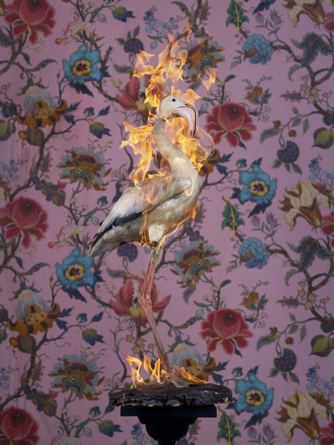 These photographs are areas of cultural and mythological reference through which Christian Houge creates. Immortalising the destructive fire, he celebrates the animal’s release from the condemned to a state of permanent and eternal degradation. This scene, disturbing as it is frightening, represents a passive triumph for the animals who gradually die out on a backdrop of a luxurious nature reproduced by Victorian tapestries. The latter were chosen by the photographer to embody the human century-old imperialism over nature and their fellow man.