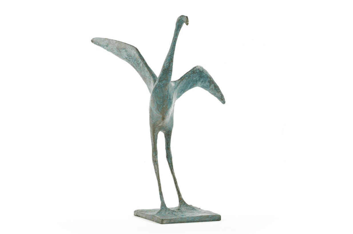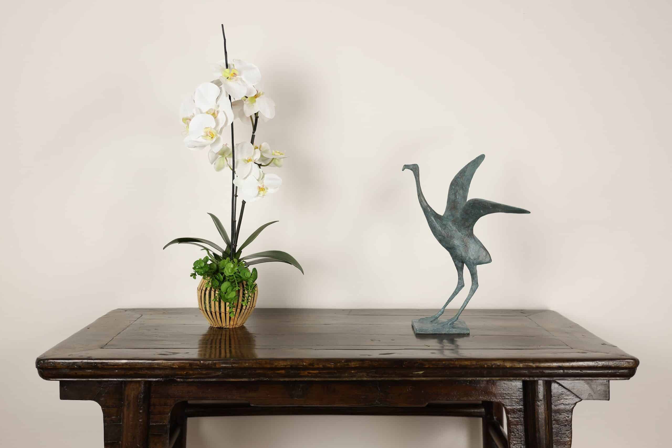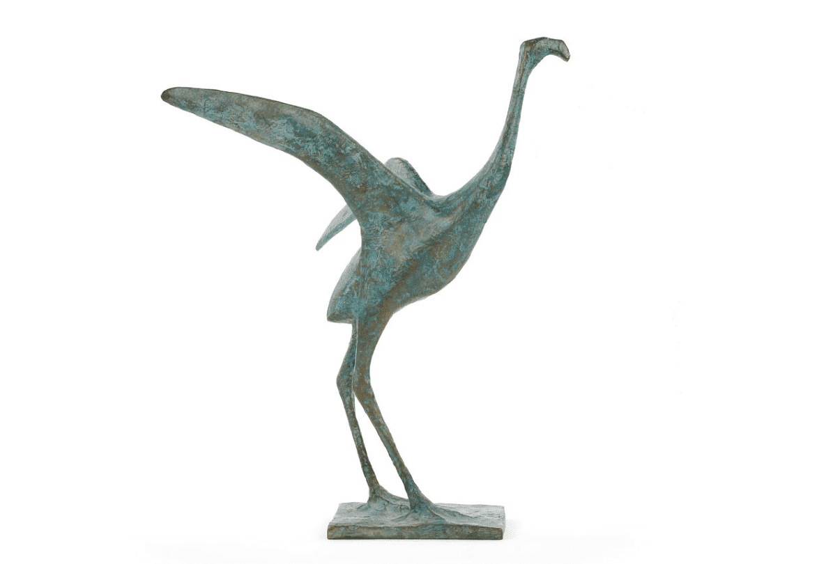 This bronze sculpture is of a bird about to fly. The bird, a celestial symbol, is still standing on its long legs, keeping a harmonious balance of grace and lightness.