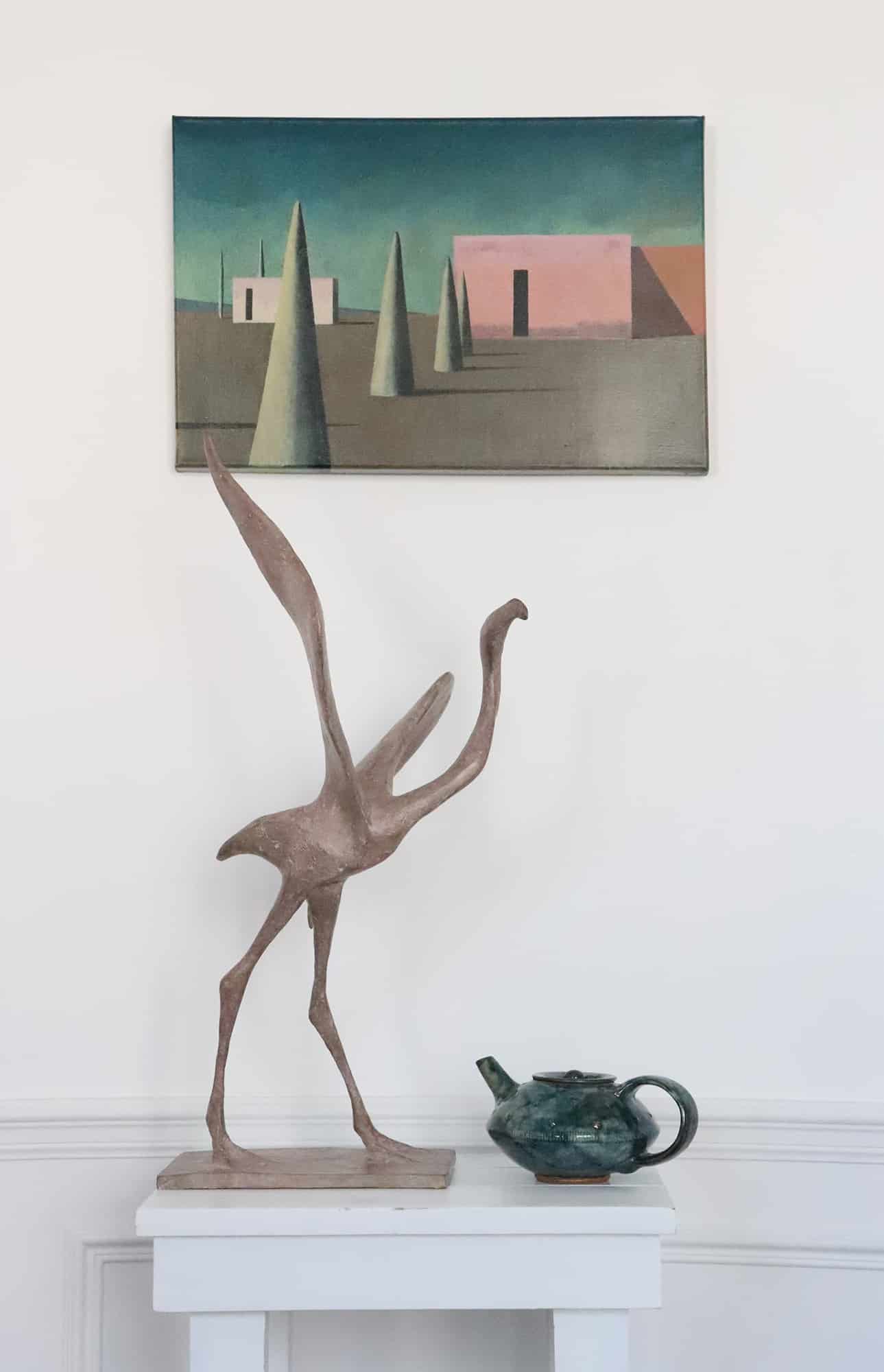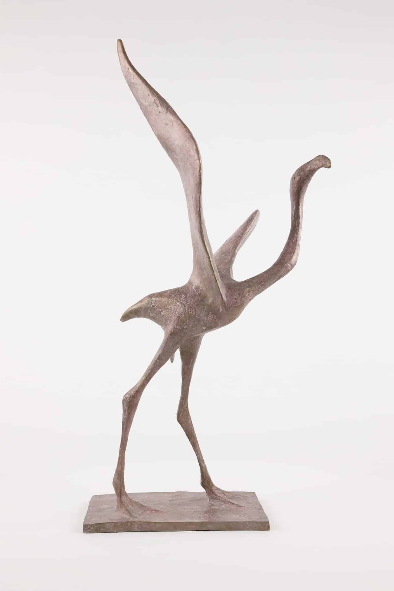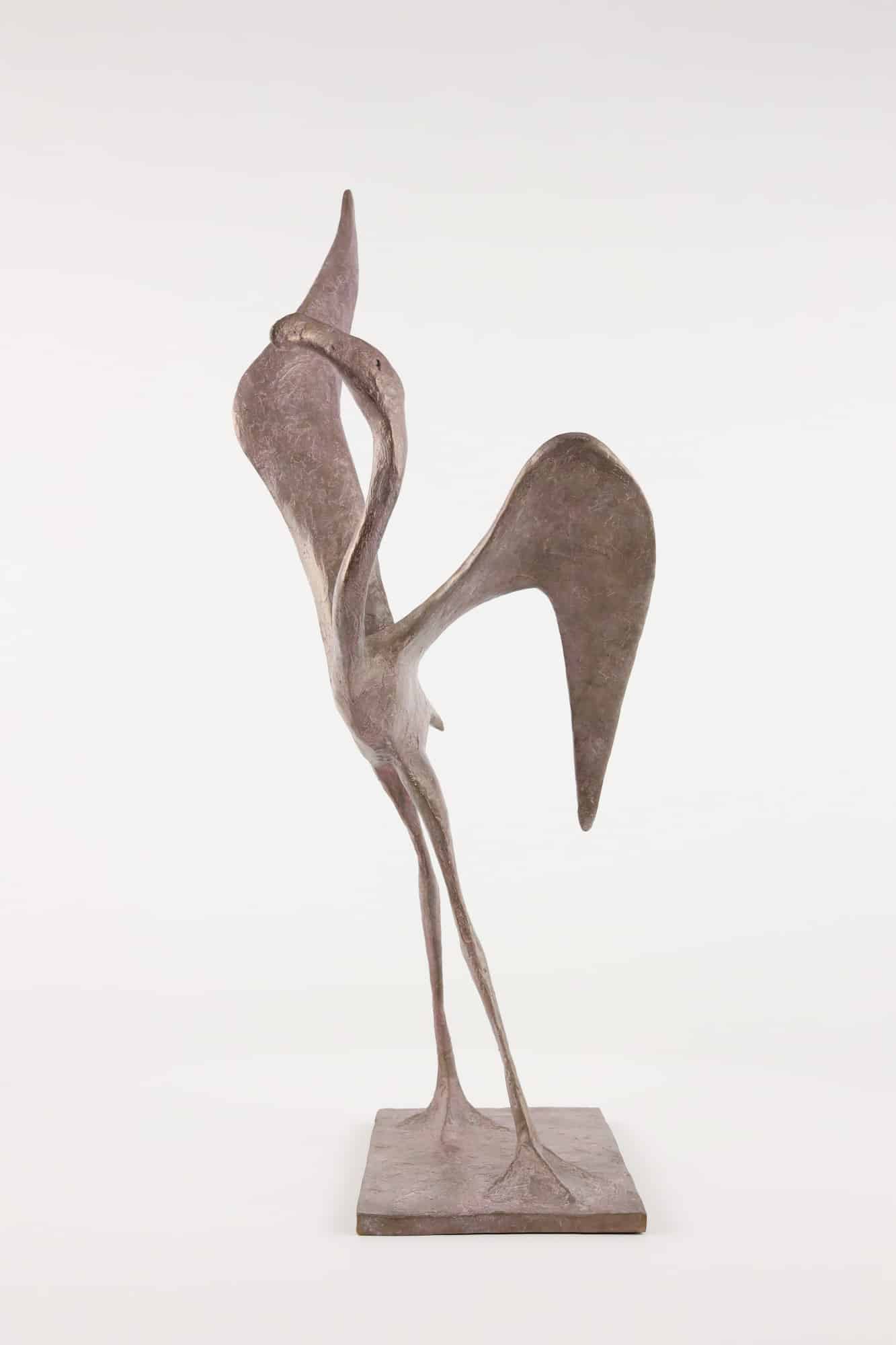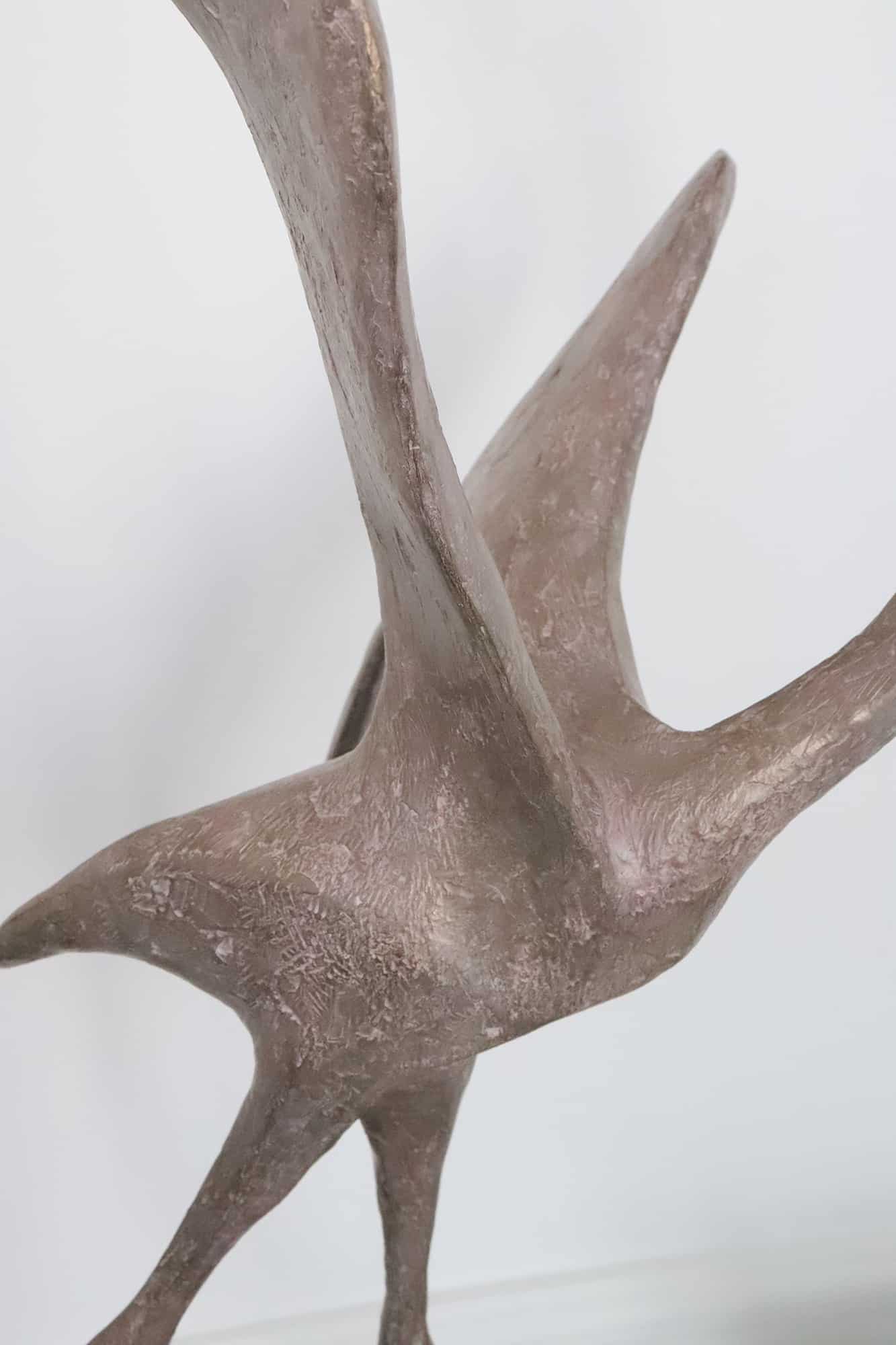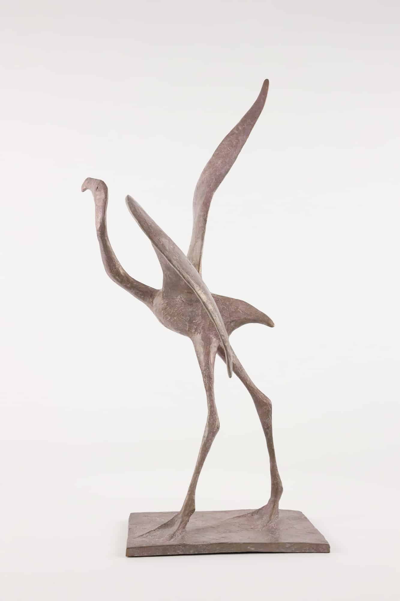 This bronze sculpture is of a bird about to fly. The bird, a celestial symbol, is still standing on its long legs, keeping a harmonious balance of grace and lightness.