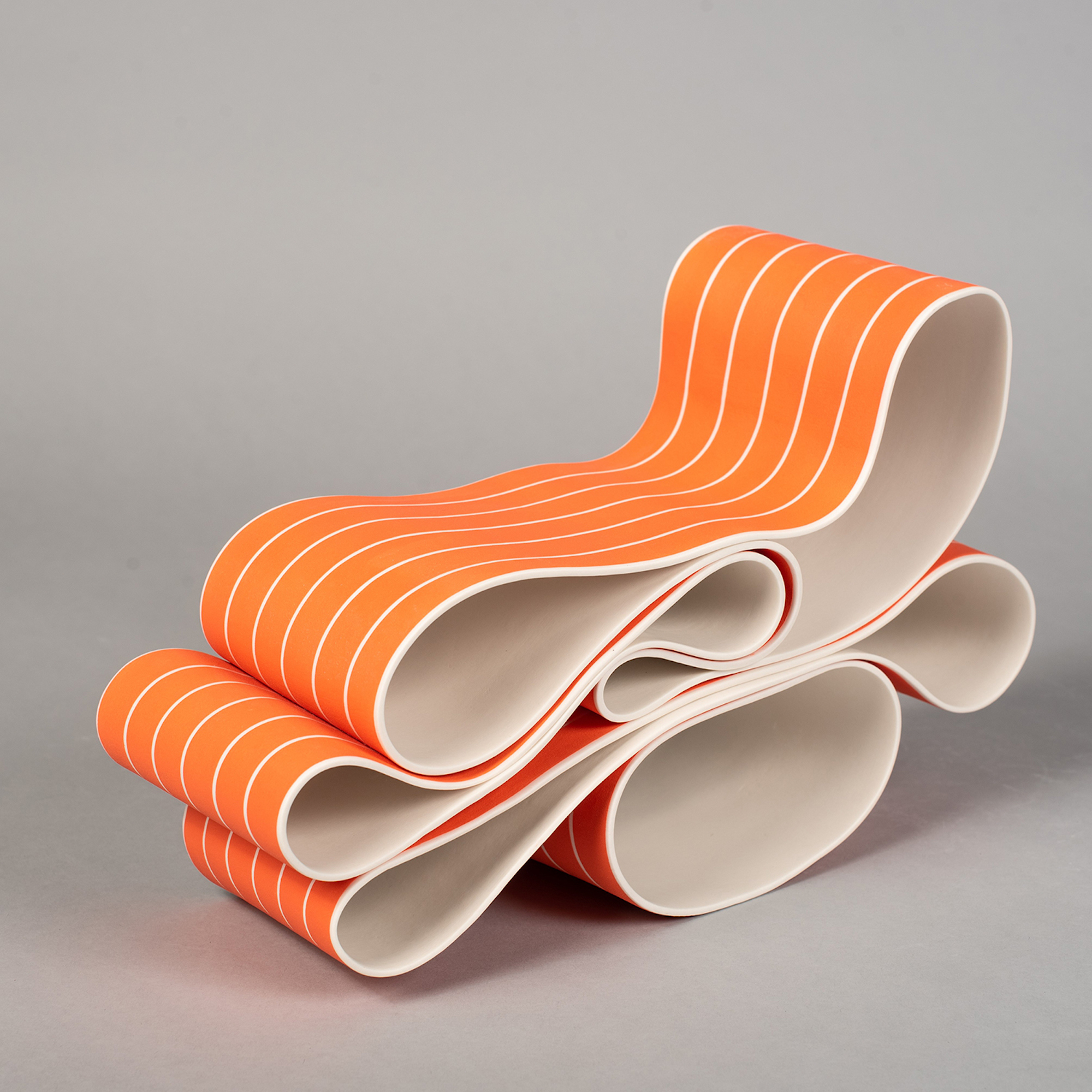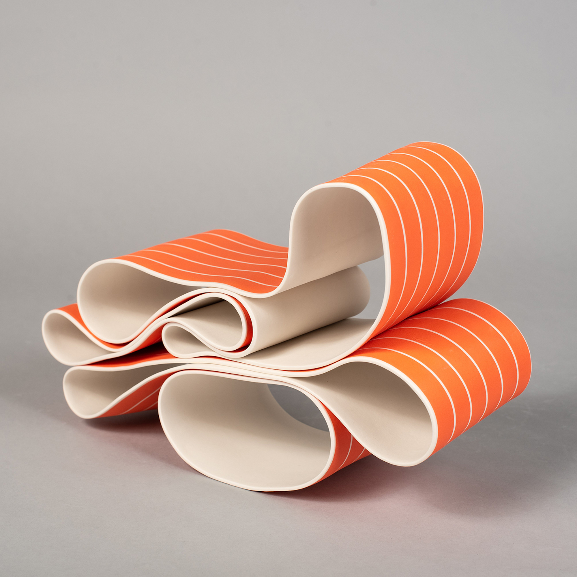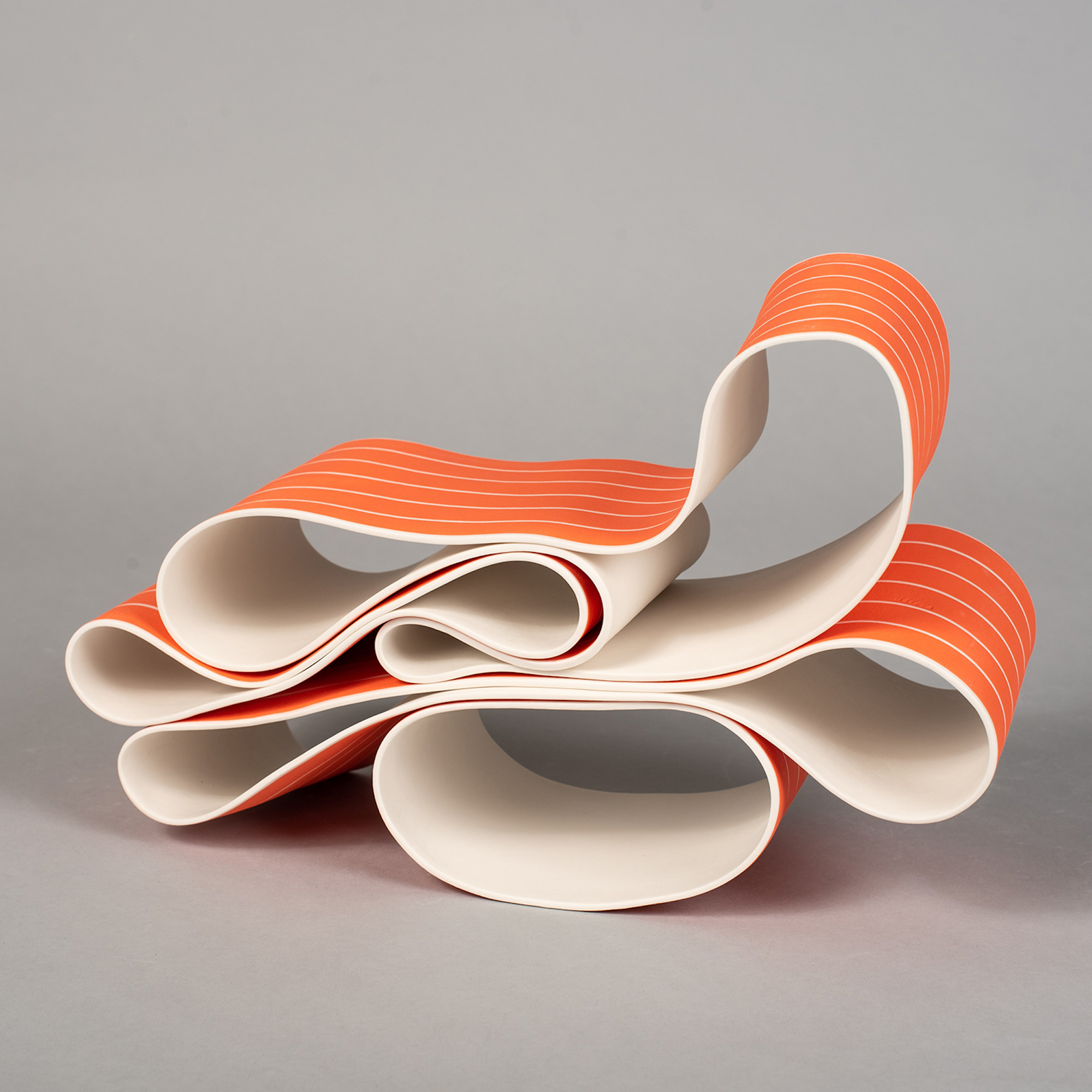 This sculpture is part of the sculptor’s most recent work, in which she uses paper porcelain (porcelain with 0.5% paper fibre added for greater flexibility) to create organic, dynamic and natural shapes. The artist tests the physical limits of the material (its collapse during firing) and plays with the balance between the full and empty spaces created by the shapes. She assembles different pieces to build her sculptures, but because of this process of collapsing, the final result after firing is always open to the unexpected. Colour is an important feature of this sculptural production, likely to elicit an emotional or psychological response from the observer. The linear patterns on the surface follow the viewer’s gaze along the curves, accentuating the soft, light, fluid look of the sculptures.