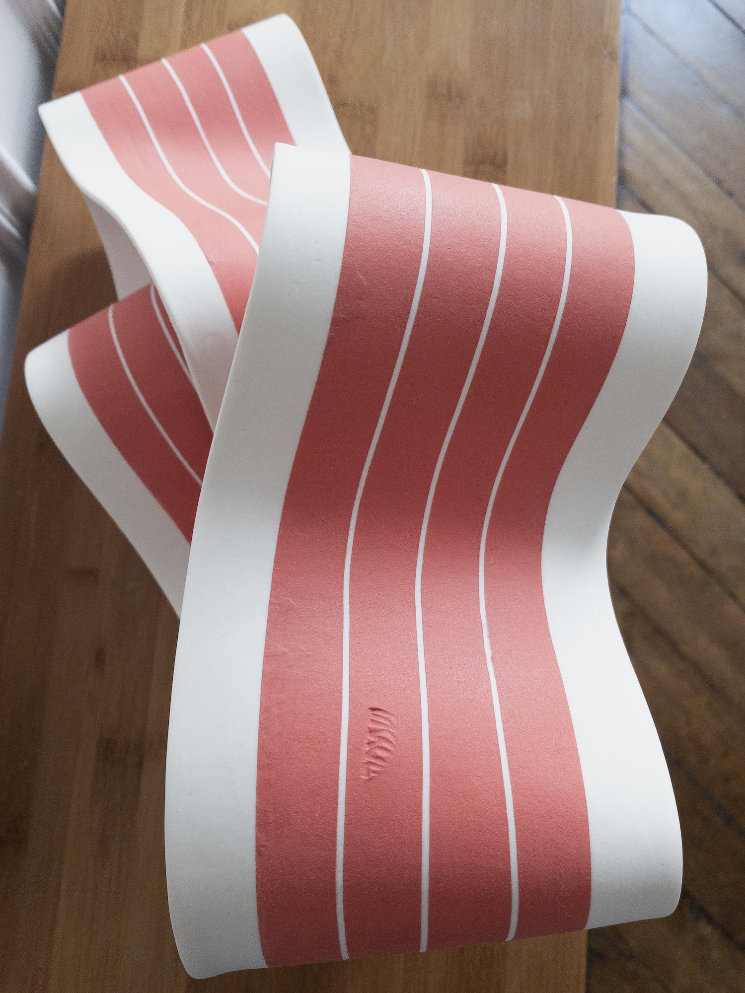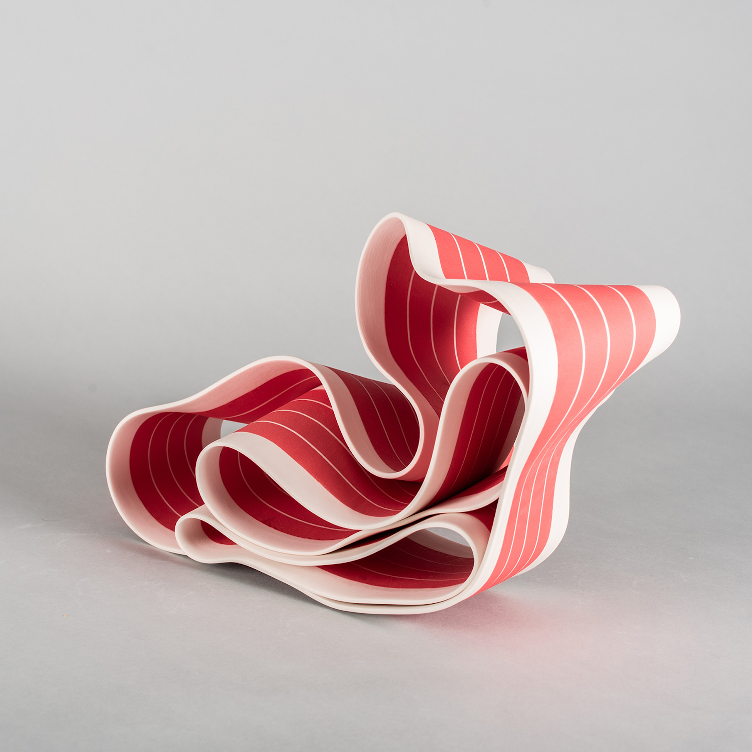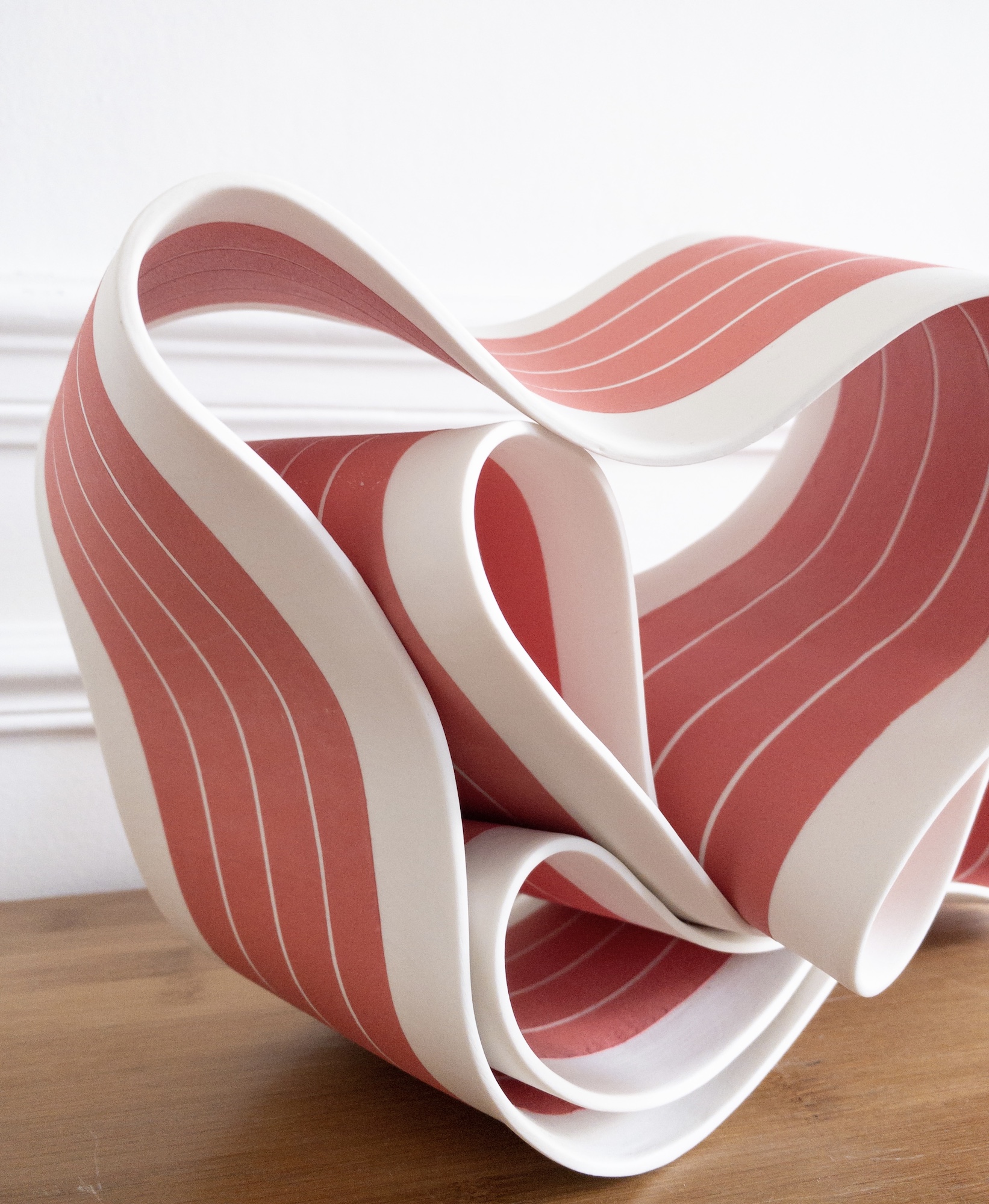This sculpture is part of the sculptor’s most recent work, in which she uses paper porcelain (porcelain with 0.5% paper fibre added for greater flexibility) to create organic, dynamic and natural shapes. The artist tests the physical limits of the material (its collapse during firing) and plays with the balance between the full and empty spaces created by the shapes. She assembles different pieces to build her sculptures, but because of this process of collapsing, the final result after firing is always open to the unexpected. Colour is an important feature of this sculptural production, likely to elicit an emotional or psychological response from the observer. The linear patterns on the surface follow the viewer’s gaze along the curves, accentuating the soft, light, fluid look of the sculptures.