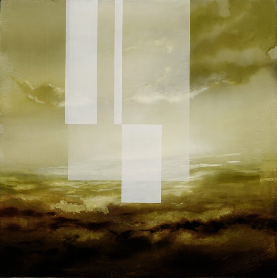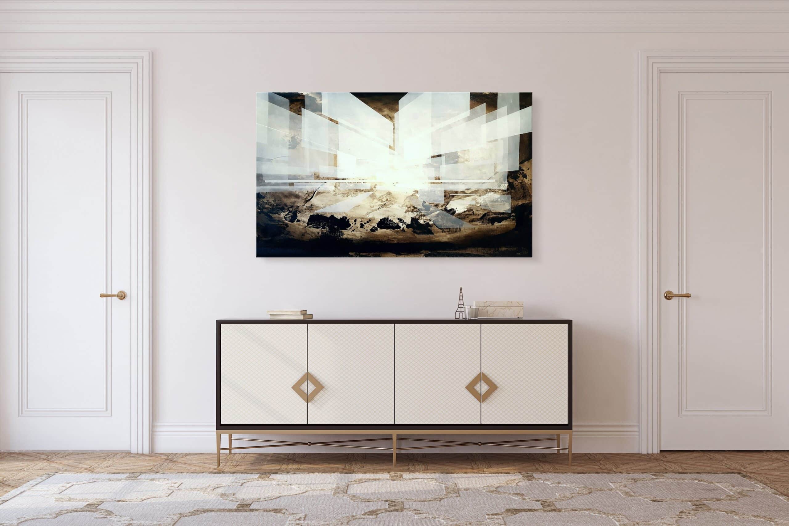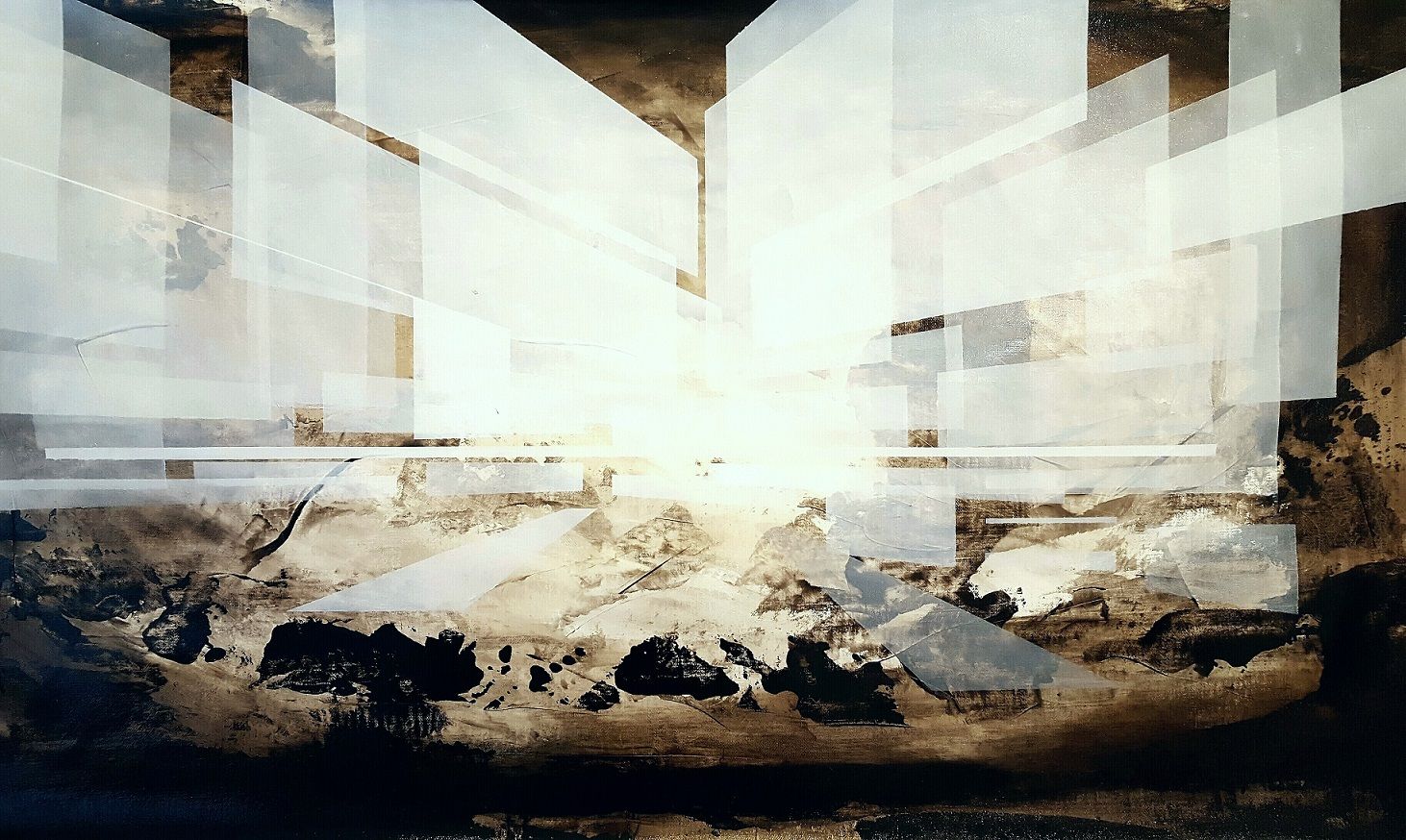 Together with a voluntarily restricted palette of colours, black and white, brown, beige and blue, the artist paints a succession of layers. He gradually brings out the nuances and intensity of light. He then integrates different shapes and geometric forms.