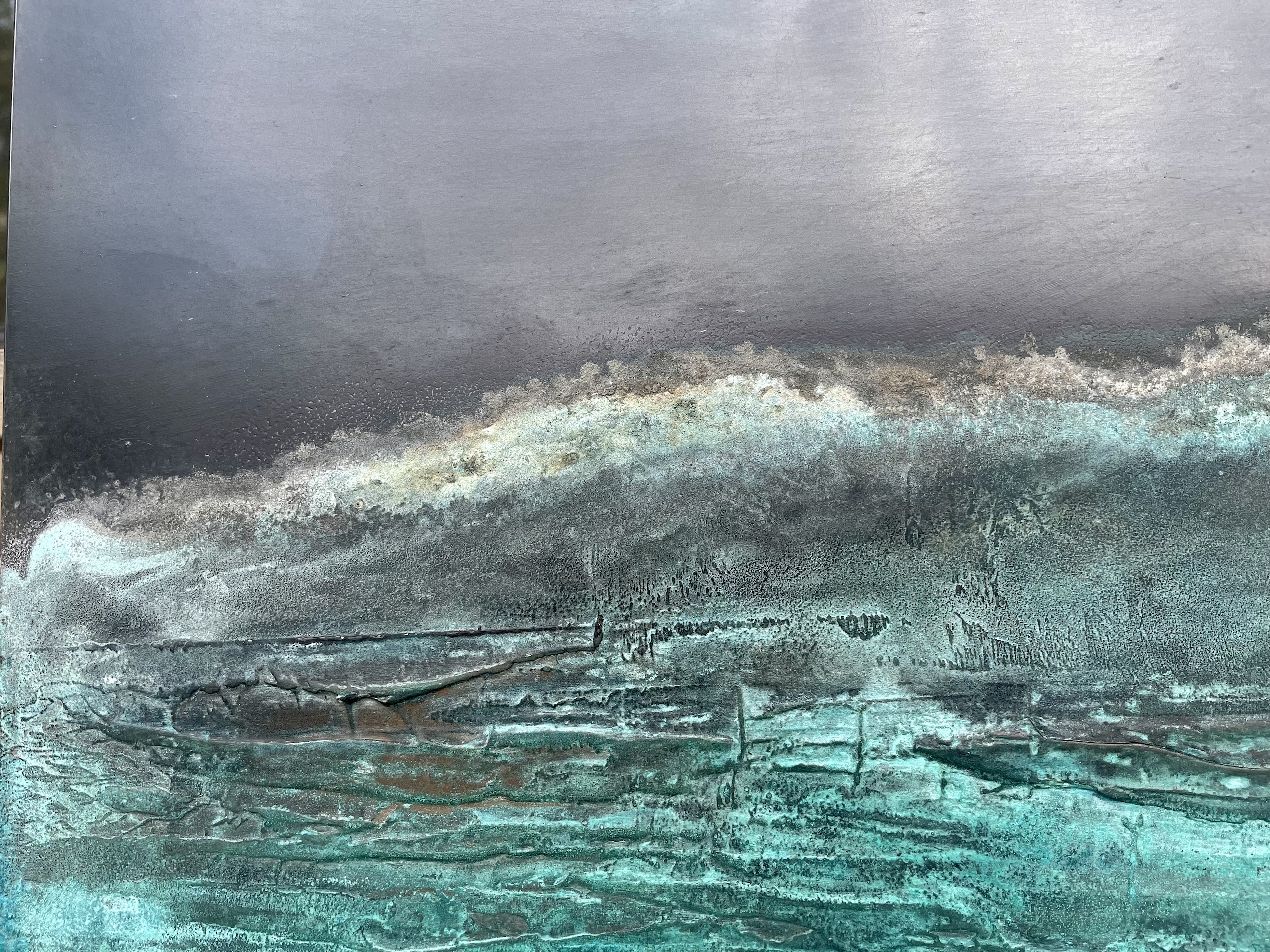 | Description | Oxidized zinc and bronze leaves on aluminum panel, patina fixed with beeswax polish |