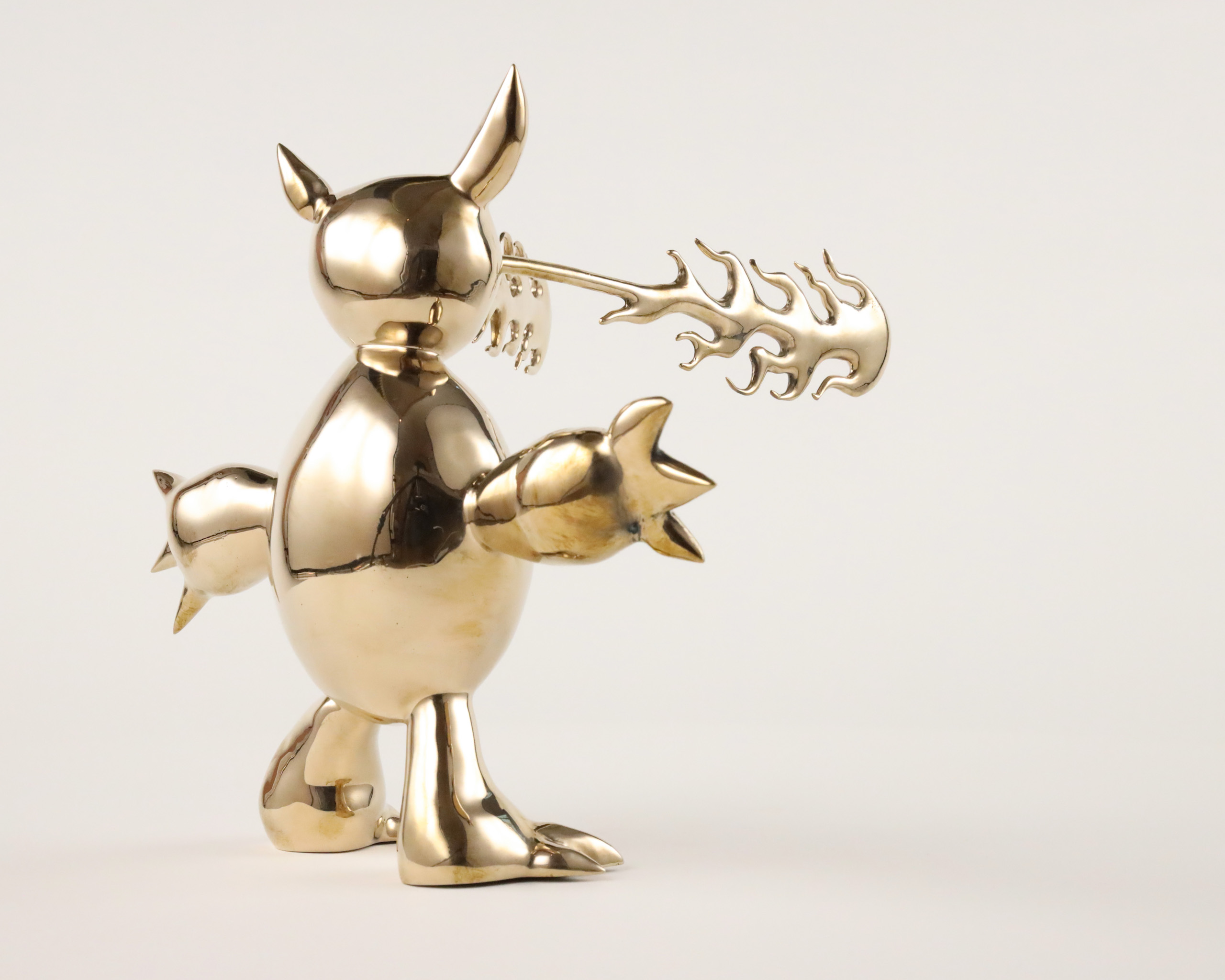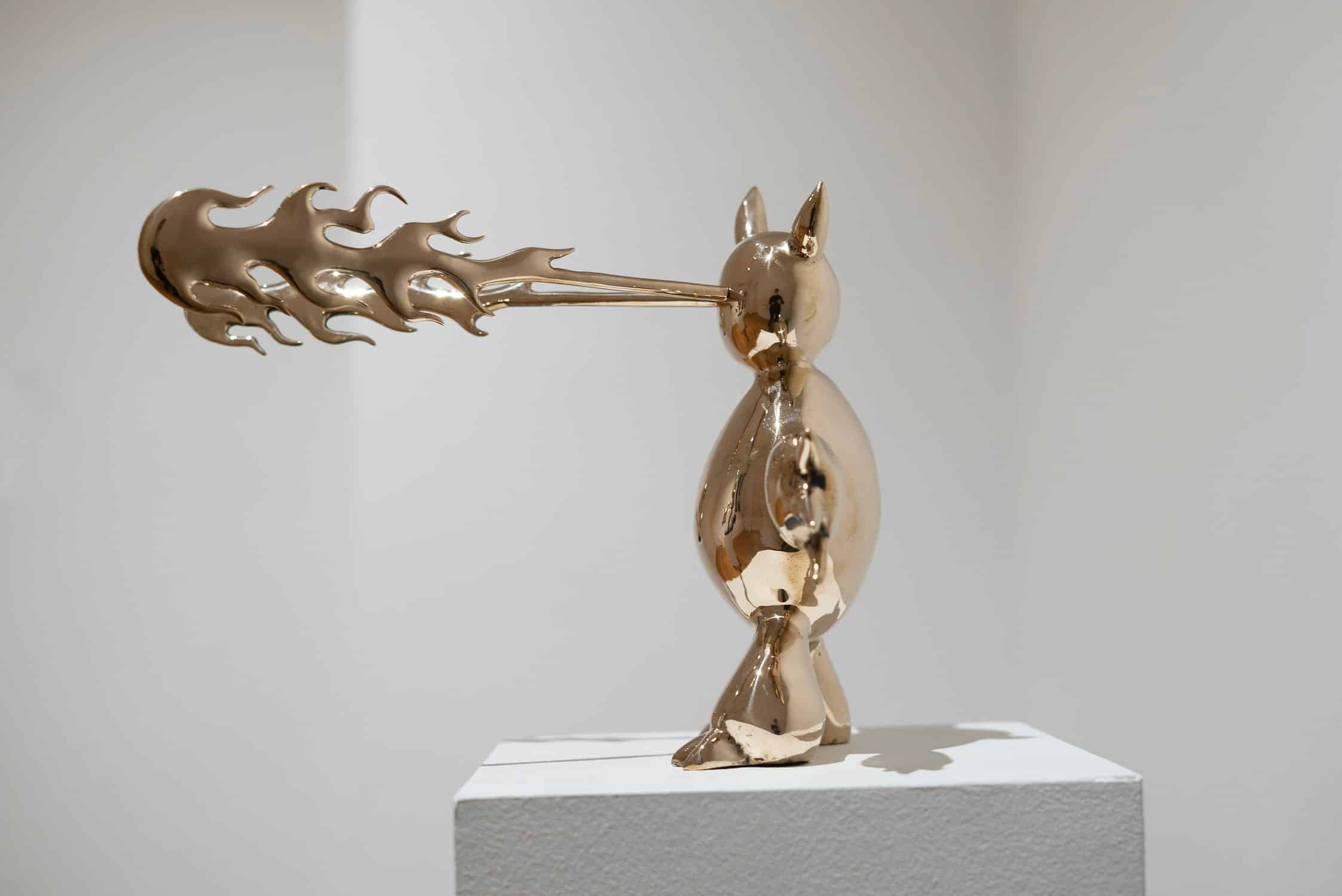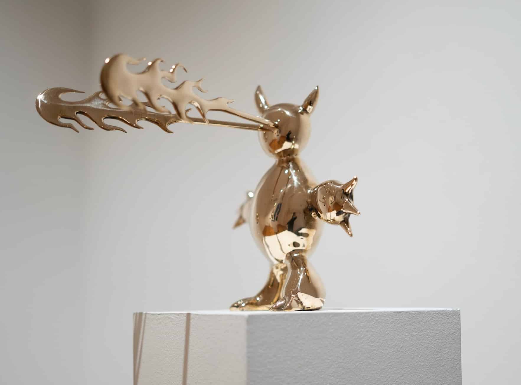 Marcelo Burgos’ artistic world is deeply rooted in childhood: children’s dreams and nightmares, populated by fantastic creatures, demons, monsters and dragons, provide the artist with his primary source of inspiration. His series The Monsters draws as much from children’s drawings, cartoons and manga as from African and Toltec sculpture. Far from being frightening, these creatures, with their golden surface, are reminiscent of statues of deities that provide both protection and comfort.