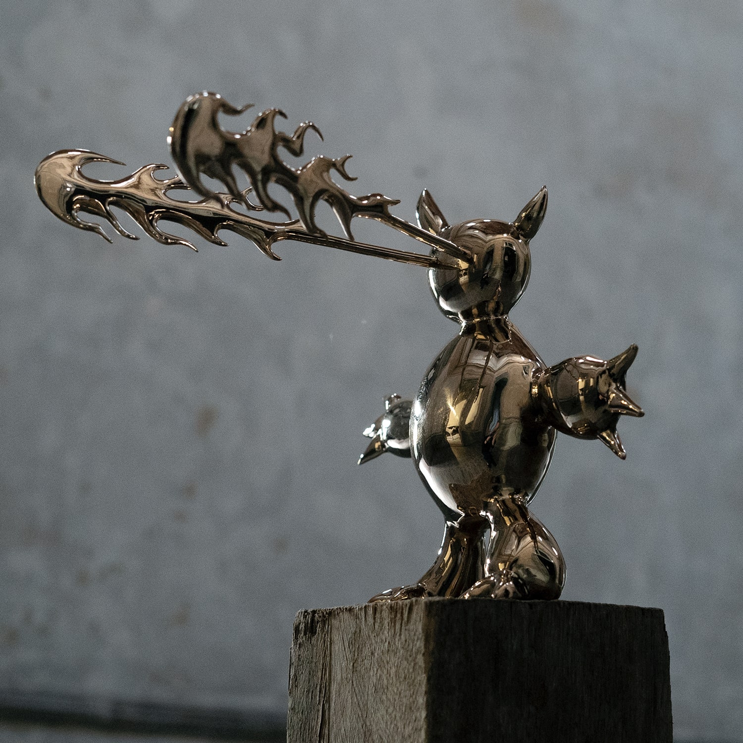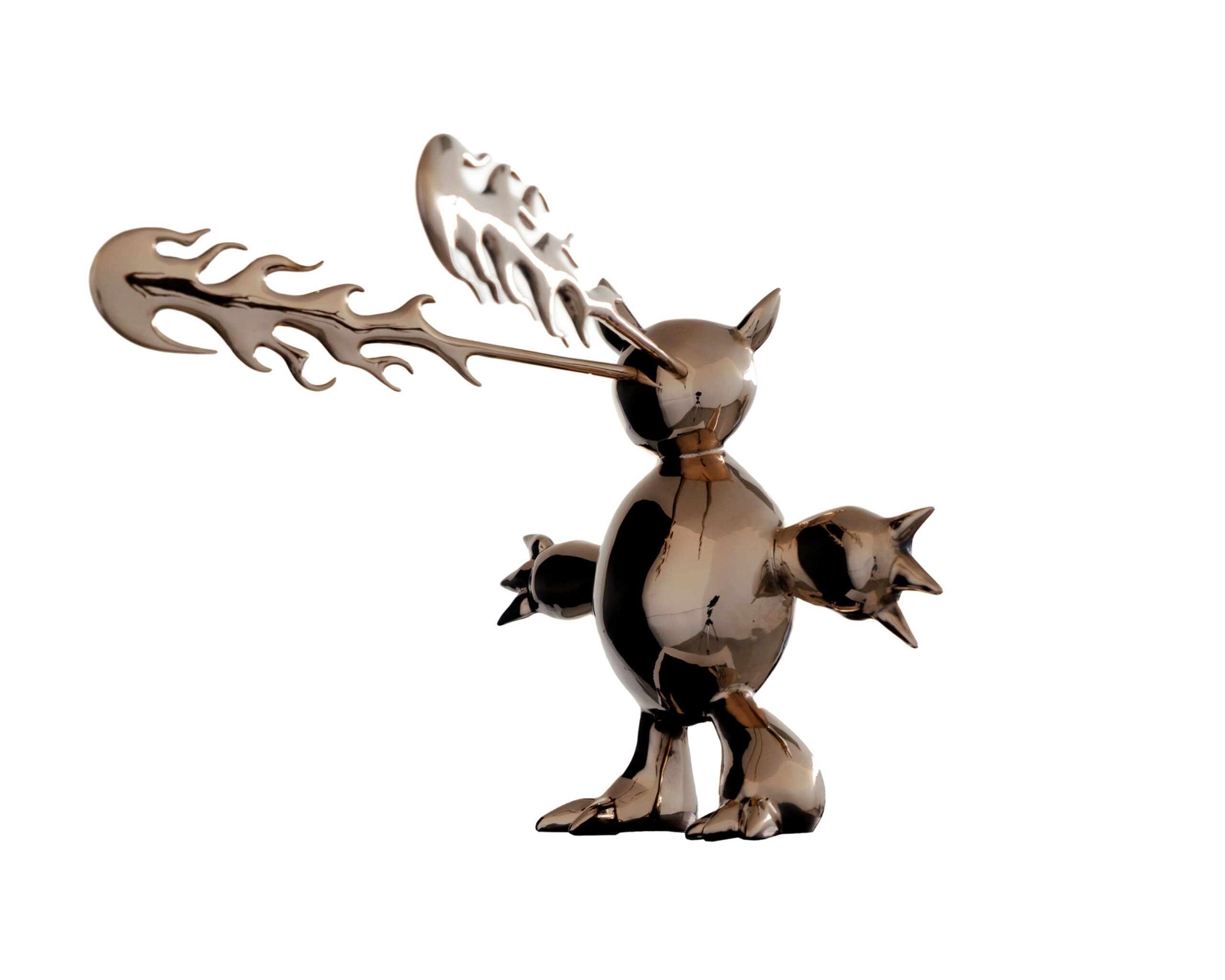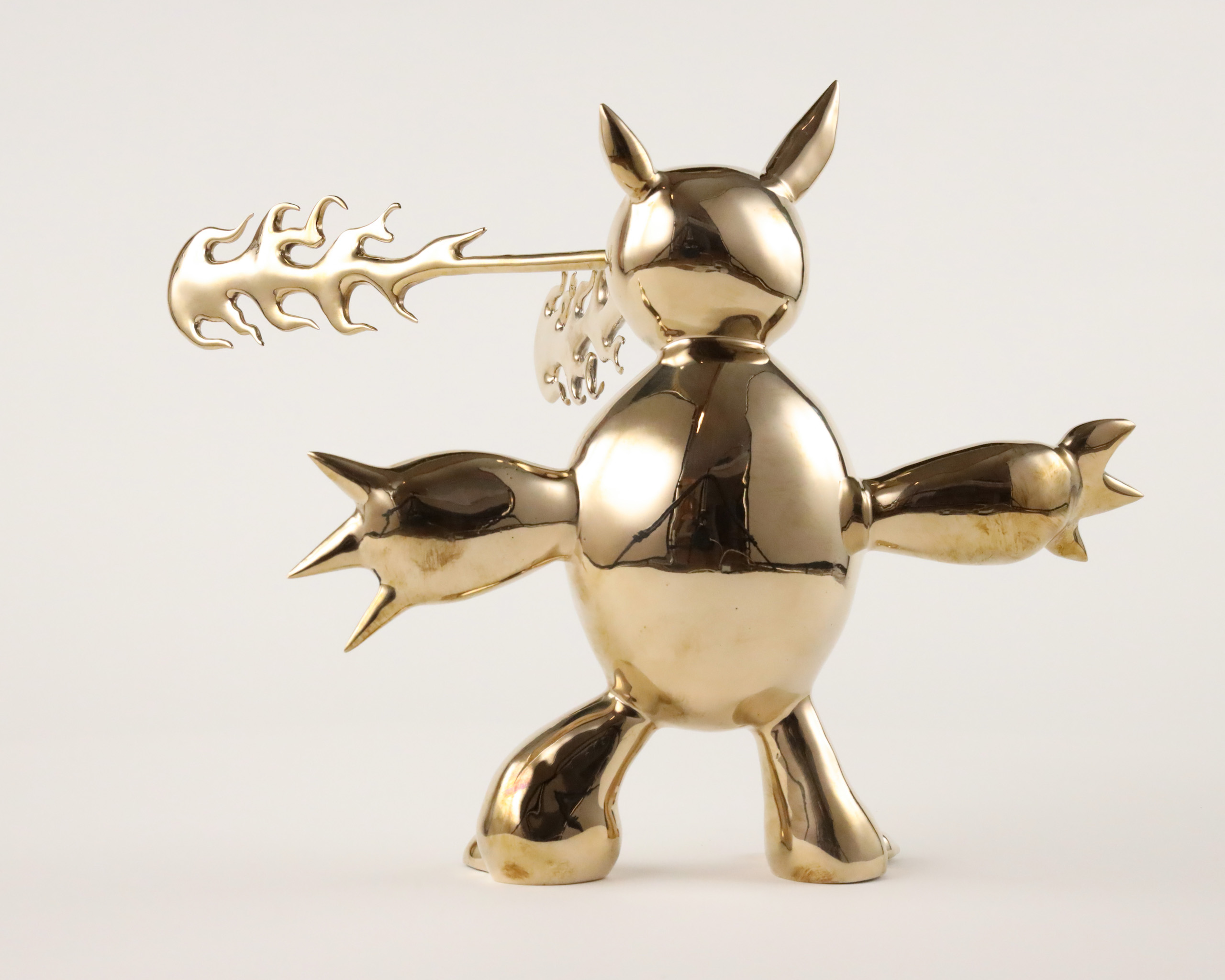 Marcelo Burgos’ artistic world is deeply rooted in childhood: children’s dreams and nightmares, populated by fantastic creatures, demons, monsters and dragons, provide the artist with his primary source of inspiration. His series The Monsters draws as much from children’s drawings, cartoons and manga as from African and Toltec sculpture. Far from being frightening, these creatures, with their golden surface, are reminiscent of statues of deities that provide both protection and comfort.